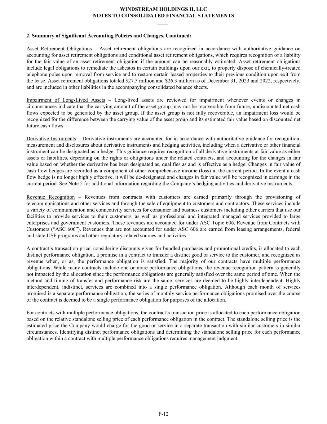 2. Summary of Significant Accounting Policies and Changes, Continued: Asset Retirement Obligations – Asset retirement obligations are recognized in accordance with authoritative guidance on accounting for asset retirement obligations and conditional asset retirement obligations, which requires recognition of a liability for the fair value of an asset retirement obligation if the amount can be reasonably estimated. Asset retirement obligations include legal obligations to remediate the asbestos in certain buildings upon our exit, to properly dispose of chemically-treated telephone poles upon removal from service and to restore certain leased properties to their previous condition upon exit from the lease. Asset retirement obligations totaled $27.5 million and $26.3 million as of December 31, 2023 and 2022, respectively, and are included in other liabilities in the accompanying consolidated balance sheets. Impairment of Long-Lived Assets – Long-lived assets are reviewed for impairment whenever events or changes in circumstances indicate that the carrying amount of the asset group may not be recoverable from future, undiscounted net cash flows expected to be generated by the asset group. If the asset group is not fully recoverable, an impairment loss would be recognized for the difference between the carrying value of the asset group and its estimated fair value based on discounted net future cash flows. Derivative Instruments – Derivative instruments are accounted for in accordance with authoritative guidance for recognition, measurement and disclosures about derivative instruments and hedging activities, including when a derivative or other financial instrument can be designated as a hedge. This guidance requires recognition of all derivative instruments at fair value as either assets or liabilities, depending on the rights or obligations under the related contracts, and accounting for the changes in fair value based on whether the derivative has been designated as, qualifies as and is effective as a hedge. Changes in fair value of cash flow hedges are recorded as a component of other comprehensive income (loss) in the current period. In the event a cash flow hedge is no longer highly effective, it will be de-designated and changes in fair value will be recognized in earnings in the current period. See Note 5 for additional information regarding the Company’s hedging activities and derivative instruments. Revenue Recognition – Revenues from contracts with customers are earned primarily through the provisioning of telecommunications and other services and through the sale of equipment to customers and contractors. These services include a variety of communication and connectivity services for consumer and business customers including other carriers that use our facilities to provide services to their customers, as well as professional and integrated managed services provided to large enterprises and government customers. These revenues are accounted for under ASC Topic 606, Revenue from Contracts with Customers (“ASC 606”). Revenues that are not accounted for under ASC 606 are earned from leasing arrangements, federal and state USF programs and other regulatory-related sources and activities. A contract’s transaction price, considering discounts given for bundled purchases and promotional credits, is allocated to each distinct performance obligation, a promise in a contract to transfer a distinct good or service to the customer, and recognized as revenue when, or as, the performance obligation is satisfied. The majority of our contracts have multiple performance obligations. While many contracts include one or more performance obligations, the revenue recognition pattern is generally not impacted by the allocation since the performance obligations are generally satisfied over the same period of time. When the method and timing of transfer and performance risk are the same, services are deemed to be highly interdependent. Highly interdependent, indistinct, services are combined into a single performance obligation. Although each month of services promised is a separate performance obligation, the series of monthly service performance obligations promised over the course of the contract is deemed to be a single performance obligation for purposes of the allocation. For contracts with multiple performance obligations, the contract’s transaction price is allocated to each performance obligation based on the relative standalone selling price of each performance obligation in the contract. The standalone selling price is the estimated price the Company would charge for the good or service in a separate transaction with similar customers in similar circumstances. Identifying distinct performance obligations and determining the standalone selling price for each performance obligation within a contract with multiple performance obligations requires management judgment. WINDSTREAM HOLDINGS II, LLC NOTES TO CONSOLIDATED FINANCIAL STATEMENTS ____ F-12