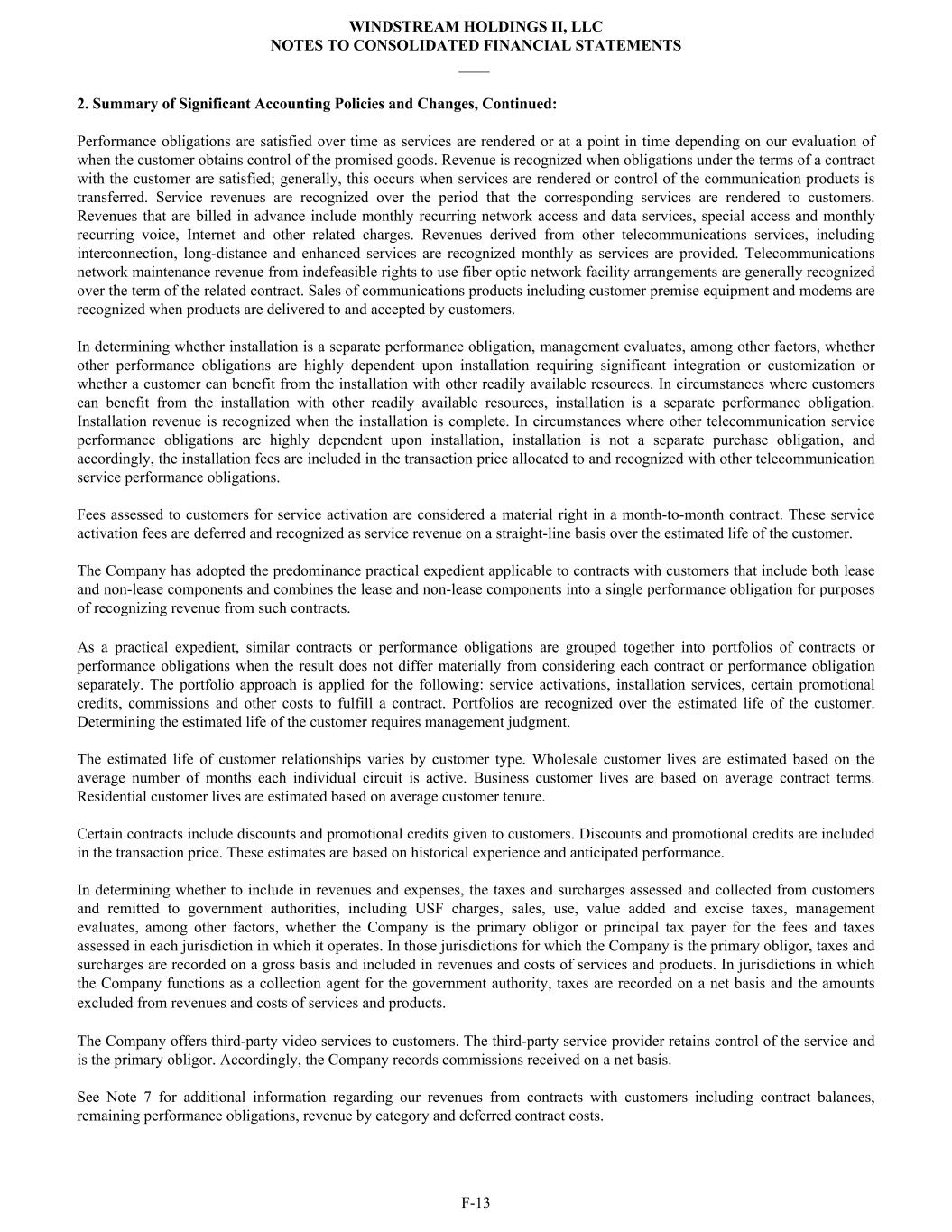 2. Summary of Significant Accounting Policies and Changes, Continued: Performance obligations are satisfied over time as services are rendered or at a point in time depending on our evaluation of when the customer obtains control of the promised goods. Revenue is recognized when obligations under the terms of a contract with the customer are satisfied; generally, this occurs when services are rendered or control of the communication products is transferred. Service revenues are recognized over the period that the corresponding services are rendered to customers. Revenues that are billed in advance include monthly recurring network access and data services, special access and monthly recurring voice, Internet and other related charges. Revenues derived from other telecommunications services, including interconnection, long-distance and enhanced services are recognized monthly as services are provided. Telecommunications network maintenance revenue from indefeasible rights to use fiber optic network facility arrangements are generally recognized over the term of the related contract. Sales of communications products including customer premise equipment and modems are recognized when products are delivered to and accepted by customers. In determining whether installation is a separate performance obligation, management evaluates, among other factors, whether other performance obligations are highly dependent upon installation requiring significant integration or customization or whether a customer can benefit from the installation with other readily available resources. In circumstances where customers can benefit from the installation with other readily available resources, installation is a separate performance obligation. Installation revenue is recognized when the installation is complete. In circumstances where other telecommunication service performance obligations are highly dependent upon installation, installation is not a separate purchase obligation, and accordingly, the installation fees are included in the transaction price allocated to and recognized with other telecommunication service performance obligations. Fees assessed to customers for service activation are considered a material right in a month-to-month contract. These service activation fees are deferred and recognized as service revenue on a straight-line basis over the estimated life of the customer. The Company has adopted the predominance practical expedient applicable to contracts with customers that include both lease and non-lease components and combines the lease and non-lease components into a single performance obligation for purposes of recognizing revenue from such contracts. As a practical expedient, similar contracts or performance obligations are grouped together into portfolios of contracts or performance obligations when the result does not differ materially from considering each contract or performance obligation separately. The portfolio approach is applied for the following: service activations, installation services, certain promotional credits, commissions and other costs to fulfill a contract. Portfolios are recognized over the estimated life of the customer. Determining the estimated life of the customer requires management judgment. The estimated life of customer relationships varies by customer type. Wholesale customer lives are estimated based on the average number of months each individual circuit is active. Business customer lives are based on average contract terms. Residential customer lives are estimated based on average customer tenure. Certain contracts include discounts and promotional credits given to customers. Discounts and promotional credits are included in the transaction price. These estimates are based on historical experience and anticipated performance. In determining whether to include in revenues and expenses, the taxes and surcharges assessed and collected from customers and remitted to government authorities, including USF charges, sales, use, value added and excise taxes, management evaluates, among other factors, whether the Company is the primary obligor or principal tax payer for the fees and taxes assessed in each jurisdiction in which it operates. In those jurisdictions for which the Company is the primary obligor, taxes and surcharges are recorded on a gross basis and included in revenues and costs of services and products. In jurisdictions in which the Company functions as a collection agent for the government authority, taxes are recorded on a net basis and the amounts excluded from revenues and costs of services and products. The Company offers third-party video services to customers. The third-party service provider retains control of the service and is the primary obligor. Accordingly, the Company records commissions received on a net basis. See Note 7 for additional information regarding our revenues from contracts with customers including contract balances, remaining performance obligations, revenue by category and deferred contract costs. WINDSTREAM HOLDINGS II, LLC NOTES TO CONSOLIDATED FINANCIAL STATEMENTS ____ F-13