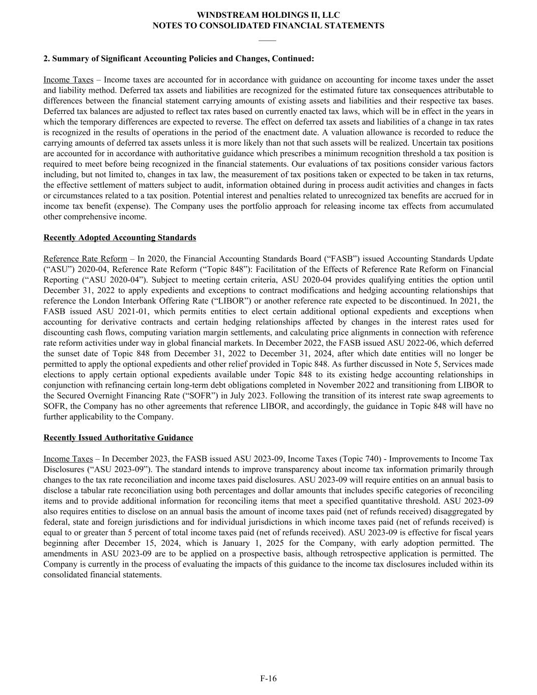 2. Summary of Significant Accounting Policies and Changes, Continued: Income Taxes – Income taxes are accounted for in accordance with guidance on accounting for income taxes under the asset and liability method. Deferred tax assets and liabilities are recognized for the estimated future tax consequences attributable to differences between the financial statement carrying amounts of existing assets and liabilities and their respective tax bases. Deferred tax balances are adjusted to reflect tax rates based on currently enacted tax laws, which will be in effect in the years in which the temporary differences are expected to reverse. The effect on deferred tax assets and liabilities of a change in tax rates is recognized in the results of operations in the period of the enactment date. A valuation allowance is recorded to reduce the carrying amounts of deferred tax assets unless it is more likely than not that such assets will be realized. Uncertain tax positions are accounted for in accordance with authoritative guidance which prescribes a minimum recognition threshold a tax position is required to meet before being recognized in the financial statements. Our evaluations of tax positions consider various factors including, but not limited to, changes in tax law, the measurement of tax positions taken or expected to be taken in tax returns, the effective settlement of matters subject to audit, information obtained during in process audit activities and changes in facts or circumstances related to a tax position. Potential interest and penalties related to unrecognized tax benefits are accrued for in income tax benefit (expense). The Company uses the portfolio approach for releasing income tax effects from accumulated other comprehensive income. Recently Adopted Accounting Standards Reference Rate Reform – In 2020, the Financial Accounting Standards Board (“FASB”) issued Accounting Standards Update (“ASU”) 2020-04, Reference Rate Reform (“Topic 848”): Facilitation of the Effects of Reference Rate Reform on Financial Reporting (“ASU 2020-04”). Subject to meeting certain criteria, ASU 2020-04 provides qualifying entities the option until December 31, 2022 to apply expedients and exceptions to contract modifications and hedging accounting relationships that reference the London Interbank Offering Rate (“LIBOR”) or another reference rate expected to be discontinued. In 2021, the FASB issued ASU 2021-01, which permits entities to elect certain additional optional expedients and exceptions when accounting for derivative contracts and certain hedging relationships affected by changes in the interest rates used for discounting cash flows, computing variation margin settlements, and calculating price alignments in connection with reference rate reform activities under way in global financial markets. In December 2022, the FASB issued ASU 2022-06, which deferred the sunset date of Topic 848 from December 31, 2022 to December 31, 2024, after which date entities will no longer be permitted to apply the optional expedients and other relief provided in Topic 848. As further discussed in Note 5, Services made elections to apply certain optional expedients available under Topic 848 to its existing hedge accounting relationships in conjunction with refinancing certain long-term debt obligations completed in November 2022 and transitioning from LIBOR to the Secured Overnight Financing Rate (“SOFR”) in July 2023. Following the transition of its interest rate swap agreements to SOFR, the Company has no other agreements that reference LIBOR, and accordingly, the guidance in Topic 848 will have no further applicability to the Company. Recently Issued Authoritative Guidance Income Taxes – In December 2023, the FASB issued ASU 2023-09, Income Taxes (Topic 740) - Improvements to Income Tax Disclosures (“ASU 2023-09”). The standard intends to improve transparency about income tax information primarily through changes to the tax rate reconciliation and income taxes paid disclosures. ASU 2023-09 will require entities on an annual basis to disclose a tabular rate reconciliation using both percentages and dollar amounts that includes specific categories of reconciling items and to provide additional information for reconciling items that meet a specified quantitative threshold. ASU 2023-09 also requires entities to disclose on an annual basis the amount of income taxes paid (net of refunds received) disaggregated by federal, state and foreign jurisdictions and for individual jurisdictions in which income taxes paid (net of refunds received) is equal to or greater than 5 percent of total income taxes paid (net of refunds received). ASU 2023-09 is effective for fiscal years beginning after December 15, 2024, which is January 1, 2025 for the Company, with early adoption permitted. The amendments in ASU 2023-09 are to be applied on a prospective basis, although retrospective application is permitted. The Company is currently in the process of evaluating the impacts of this guidance to the income tax disclosures included within its consolidated financial statements. WINDSTREAM HOLDINGS II, LLC NOTES TO CONSOLIDATED FINANCIAL STATEMENTS ____ F-16
