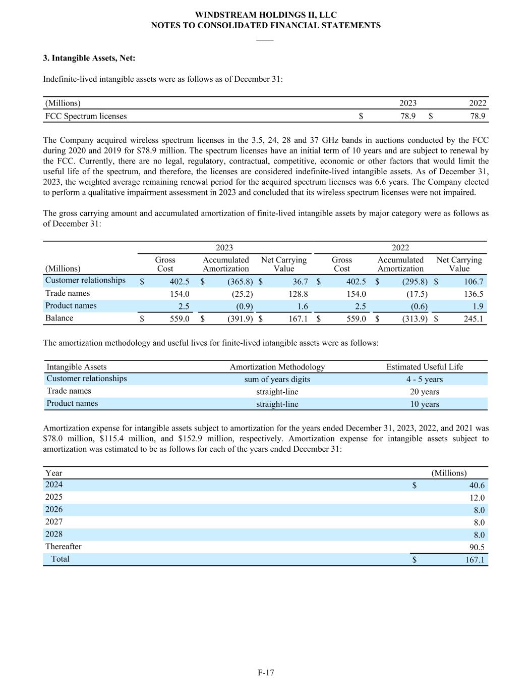 3. Intangible Assets, Net: Indefinite-lived intangible assets were as follows as of December 31: (Millions) 2023 2022 FCC Spectrum licenses $ 78.9 $ 78.9 The Company acquired wireless spectrum licenses in the 3.5, 24, 28 and 37 GHz bands in auctions conducted by the FCC during 2020 and 2019 for $78.9 million. The spectrum licenses have an initial term of 10 years and are subject to renewal by the FCC. Currently, there are no legal, regulatory, contractual, competitive, economic or other factors that would limit the useful life of the spectrum, and therefore, the licenses are considered indefinite-lived intangible assets. As of December 31, 2023, the weighted average remaining renewal period for the acquired spectrum licenses was 6.6 years. The Company elected to perform a qualitative impairment assessment in 2023 and concluded that its wireless spectrum licenses were not impaired. The gross carrying amount and accumulated amortization of finite-lived intangible assets by major category were as follows as of December 31: 2023 2022 (Millions) Gross Cost Accumulated Amortization Net Carrying Value Gross Cost Accumulated Amortization Net Carrying Value Customer relationships $ 402.5 $ (365.8) $ 36.7 $ 402.5 $ (295.8) $ 106.7 Trade names 154.0 (25.2) 128.8 154.0 (17.5) 136.5 Product names 2.5 (0.9) 1.6 2.5 (0.6) 1.9 Balance $ 559.0 $ (391.9) $ 167.1 $ 559.0 $ (313.9) $ 245.1 The amortization methodology and useful lives for finite-lived intangible assets were as follows: Intangible Assets Amortization Methodology Estimated Useful Life Customer relationships sum of years digits 4 - 5 years Trade names straight-line 20 years Product names straight-line 10 years Amortization expense for intangible assets subject to amortization for the years ended December 31, 2023, 2022, and 2021 was $78.0 million, $115.4 million, and $152.9 million, respectively. Amortization expense for intangible assets subject to amortization was estimated to be as follows for each of the years ended December 31: Year (Millions) 2024 $ 40.6 2025 12.0 2026 8.0 2027 8.0 2028 8.0 Thereafter 90.5 Total $ 167.1 WINDSTREAM HOLDINGS II, LLC NOTES TO CONSOLIDATED FINANCIAL STATEMENTS ____ F-17