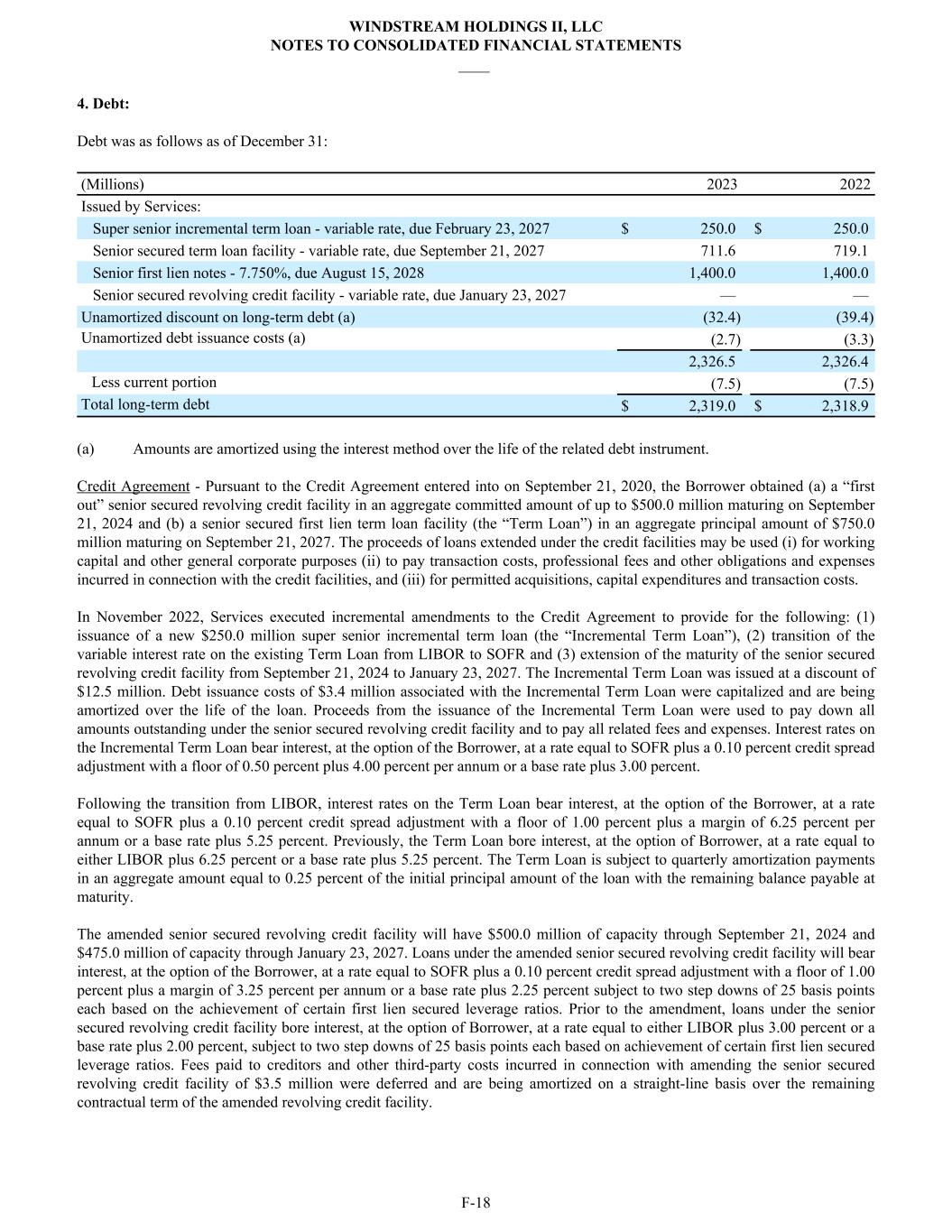 4. Debt: Debt was as follows as of December 31: (Millions) 2023 2022 Issued by Services: Super senior incremental term loan - variable rate, due February 23, 2027 $ 250.0 $ 250.0 Senior secured term loan facility - variable rate, due September 21, 2027 711.6 719.1 Senior first lien notes - 7.750%, due August 15, 2028 1,400.0 1,400.0 Senior secured revolving credit facility - variable rate, due January 23, 2027 — — Unamortized discount on long-term debt (a) (32.4) (39.4) Unamortized debt issuance costs (a) (2.7) (3.3) 2,326.5 2,326.4 Less current portion (7.5) (7.5) Total long-term debt $ 2,319.0 $ 2,318.9 (a) Amounts are amortized using the interest method over the life of the related debt instrument. Credit Agreement - Pursuant to the Credit Agreement entered into on September 21, 2020, the Borrower obtained (a) a “first out” senior secured revolving credit facility in an aggregate committed amount of up to $500.0 million maturing on September 21, 2024 and (b) a senior secured first lien term loan facility (the “Term Loan”) in an aggregate principal amount of $750.0 million maturing on September 21, 2027. The proceeds of loans extended under the credit facilities may be used (i) for working capital and other general corporate purposes (ii) to pay transaction costs, professional fees and other obligations and expenses incurred in connection with the credit facilities, and (iii) for permitted acquisitions, capital expenditures and transaction costs. In November 2022, Services executed incremental amendments to the Credit Agreement to provide for the following: (1) issuance of a new $250.0 million super senior incremental term loan (the “Incremental Term Loan”), (2) transition of the variable interest rate on the existing Term Loan from LIBOR to SOFR and (3) extension of the maturity of the senior secured revolving credit facility from September 21, 2024 to January 23, 2027. The Incremental Term Loan was issued at a discount of $12.5 million. Debt issuance costs of $3.4 million associated with the Incremental Term Loan were capitalized and are being amortized over the life of the loan. Proceeds from the issuance of the Incremental Term Loan were used to pay down all amounts outstanding under the senior secured revolving credit facility and to pay all related fees and expenses. Interest rates on the Incremental Term Loan bear interest, at the option of the Borrower, at a rate equal to SOFR plus a 0.10 percent credit spread adjustment with a floor of 0.50 percent plus 4.00 percent per annum or a base rate plus 3.00 percent. Following the transition from LIBOR, interest rates on the Term Loan bear interest, at the option of the Borrower, at a rate equal to SOFR plus a 0.10 percent credit spread adjustment with a floor of 1.00 percent plus a margin of 6.25 percent per annum or a base rate plus 5.25 percent. Previously, the Term Loan bore interest, at the option of Borrower, at a rate equal to either LIBOR plus 6.25 percent or a base rate plus 5.25 percent. The Term Loan is subject to quarterly amortization payments in an aggregate amount equal to 0.25 percent of the initial principal amount of the loan with the remaining balance payable at maturity. The amended senior secured revolving credit facility will have $500.0 million of capacity through September 21, 2024 and $475.0 million of capacity through January 23, 2027. Loans under the amended senior secured revolving credit facility will bear interest, at the option of the Borrower, at a rate equal to SOFR plus a 0.10 percent credit spread adjustment with a floor of 1.00 percent plus a margin of 3.25 percent per annum or a base rate plus 2.25 percent subject to two step downs of 25 basis points each based on the achievement of certain first lien secured leverage ratios. Prior to the amendment, loans under the senior secured revolving credit facility bore interest, at the option of Borrower, at a rate equal to either LIBOR plus 3.00 percent or a base rate plus 2.00 percent, subject to two step downs of 25 basis points each based on achievement of certain first lien secured leverage ratios. Fees paid to creditors and other third-party costs incurred in connection with amending the senior secured revolving credit facility of $3.5 million were deferred and are being amortized on a straight-line basis over the remaining contractual term of the amended revolving credit facility. WINDSTREAM HOLDINGS II, LLC NOTES TO CONSOLIDATED FINANCIAL STATEMENTS ____ F-18