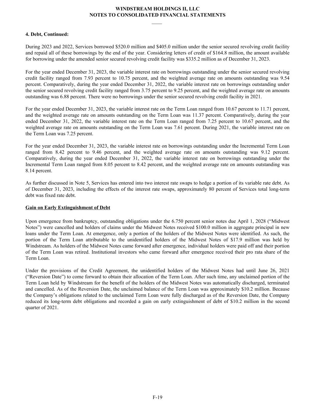 4. Debt, Continued: During 2023 and 2022, Services borrowed $520.0 million and $405.0 million under the senior secured revolving credit facility and repaid all of these borrowings by the end of the year. Considering letters of credit of $164.8 million, the amount available for borrowing under the amended senior secured revolving credit facility was $335.2 million as of December 31, 2023. For the year ended December 31, 2023, the variable interest rate on borrowings outstanding under the senior secured revolving credit facility ranged from 7.93 percent to 10.75 percent, and the weighted average rate on amounts outstanding was 9.54 percent. Comparatively, during the year ended December 31, 2022, the variable interest rate on borrowings outstanding under the senior secured revolving credit facility ranged from 3.75 percent to 9.25 percent, and the weighted average rate on amounts outstanding was 6.88 percent. There were no borrowings under the senior secured revolving credit facility in 2021. For the year ended December 31, 2023, the variable interest rate on the Term Loan ranged from 10.67 percent to 11.71 percent, and the weighted average rate on amounts outstanding on the Term Loan was 11.37 percent. Comparatively, during the year ended December 31, 2022, the variable interest rate on the Term Loan ranged from 7.25 percent to 10.67 percent, and the weighted average rate on amounts outstanding on the Term Loan was 7.61 percent. During 2021, the variable interest rate on the Term Loan was 7.25 percent. For the year ended December 31, 2023, the variable interest rate on borrowings outstanding under the Incremental Term Loan ranged from 8.42 percent to 9.46 percent, and the weighted average rate on amounts outstanding was 9.12 percent. Comparatively, during the year ended December 31, 2022, the variable interest rate on borrowings outstanding under the Incremental Term Loan ranged from 8.05 percent to 8.42 percent, and the weighted average rate on amounts outstanding was 8.14 percent. As further discussed in Note 5, Services has entered into two interest rate swaps to hedge a portion of its variable rate debt. As of December 31, 2023, including the effects of the interest rate swaps, approximately 80 percent of Services total long-term debt was fixed rate debt. Gain on Early Extinguishment of Debt Upon emergence from bankruptcy, outstanding obligations under the 6.750 percent senior notes due April 1, 2028 (“Midwest Notes”) were cancelled and holders of claims under the Midwest Notes received $100.0 million in aggregate principal in new loans under the Term Loan. At emergence, only a portion of the holders of the Midwest Notes were identified. As such, the portion of the Term Loan attributable to the unidentified holders of the Midwest Notes of $17.9 million was held by Windstream. As holders of the Midwest Notes came forward after emergence, individual holders were paid off and their portion of the Term Loan was retired. Institutional investors who came forward after emergence received their pro rata share of the Term Loan. Under the provisions of the Credit Agreement, the unidentified holders of the Midwest Notes had until June 26, 2021 (“Reversion Date”) to come forward to obtain their allocation of the Term Loan. After such time, any unclaimed portion of the Term Loan held by Windstream for the benefit of the holders of the Midwest Notes was automatically discharged, terminated and cancelled. As of the Reversion Date, the unclaimed balance of the Term Loan was approximately $10.2 million. Because the Company’s obligations related to the unclaimed Term Loan were fully discharged as of the Reversion Date, the Company reduced its long-term debt obligations and recorded a gain on early extinguishment of debt of $10.2 million in the second quarter of 2021. WINDSTREAM HOLDINGS II, LLC NOTES TO CONSOLIDATED FINANCIAL STATEMENTS ____ F-19