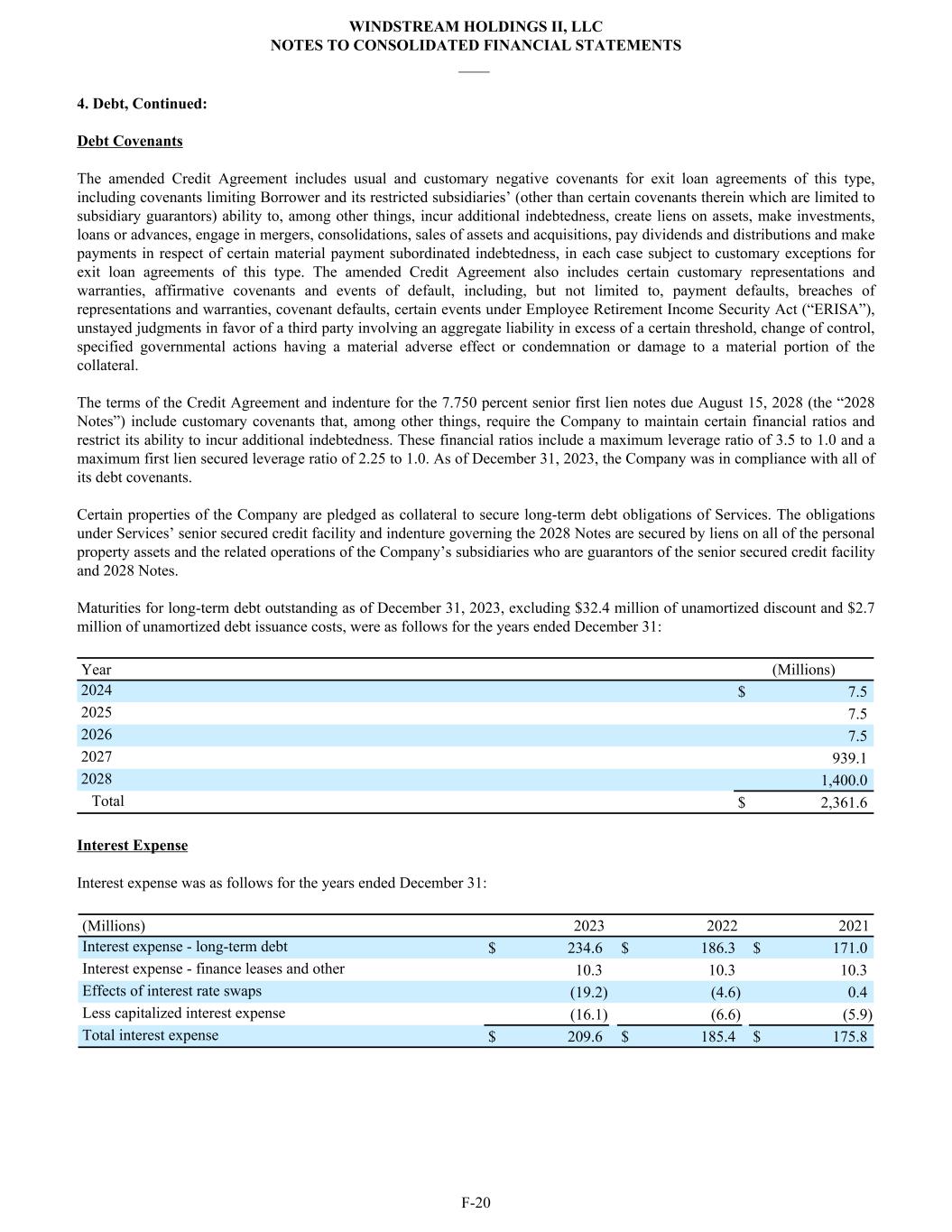 4. Debt, Continued: Debt Covenants The amended Credit Agreement includes usual and customary negative covenants for exit loan agreements of this type, including covenants limiting Borrower and its restricted subsidiaries’ (other than certain covenants therein which are limited to subsidiary guarantors) ability to, among other things, incur additional indebtedness, create liens on assets, make investments, loans or advances, engage in mergers, consolidations, sales of assets and acquisitions, pay dividends and distributions and make payments in respect of certain material payment subordinated indebtedness, in each case subject to customary exceptions for exit loan agreements of this type. The amended Credit Agreement also includes certain customary representations and warranties, affirmative covenants and events of default, including, but not limited to, payment defaults, breaches of representations and warranties, covenant defaults, certain events under Employee Retirement Income Security Act (“ERISA”), unstayed judgments in favor of a third party involving an aggregate liability in excess of a certain threshold, change of control, specified governmental actions having a material adverse effect or condemnation or damage to a material portion of the collateral. The terms of the Credit Agreement and indenture for the 7.750 percent senior first lien notes due August 15, 2028 (the “2028 Notes”) include customary covenants that, among other things, require the Company to maintain certain financial ratios and restrict its ability to incur additional indebtedness. These financial ratios include a maximum leverage ratio of 3.5 to 1.0 and a maximum first lien secured leverage ratio of 2.25 to 1.0. As of December 31, 2023, the Company was in compliance with all of its debt covenants. Certain properties of the Company are pledged as collateral to secure long-term debt obligations of Services. The obligations under Services’ senior secured credit facility and indenture governing the 2028 Notes are secured by liens on all of the personal property assets and the related operations of the Company’s subsidiaries who are guarantors of the senior secured credit facility and 2028 Notes. Maturities for long-term debt outstanding as of December 31, 2023, excluding $32.4 million of unamortized discount and $2.7 million of unamortized debt issuance costs, were as follows for the years ended December 31: Year (Millions) 2024 $ 7.5 2025 7.5 2026 7.5 2027 939.1 2028 1,400.0 Total $ 2,361.6 Interest Expense Interest expense was as follows for the years ended December 31: (Millions) 2023 2022 2021 Interest expense - long-term debt $ 234.6 $ 186.3 $ 171.0 Interest expense - finance leases and other 10.3 10.3 10.3 Effects of interest rate swaps (19.2) (4.6) 0.4 Less capitalized interest expense (16.1) (6.6) (5.9) Total interest expense $ 209.6 $ 185.4 $ 175.8 WINDSTREAM HOLDINGS II, LLC NOTES TO CONSOLIDATED FINANCIAL STATEMENTS ____ F-20
