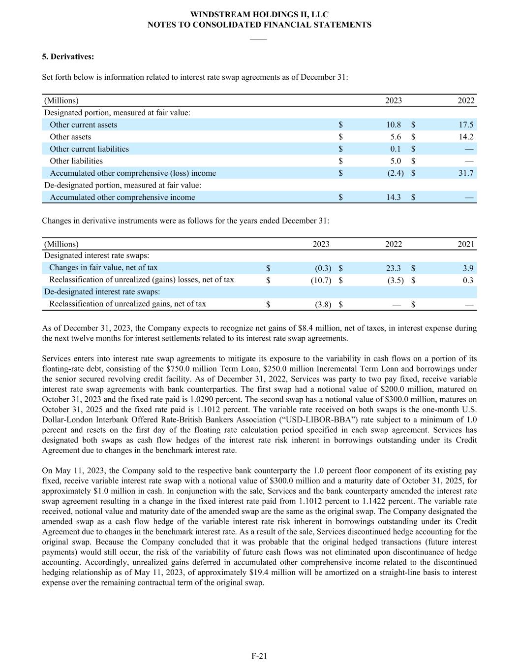 5. Derivatives: Set forth below is information related to interest rate swap agreements as of December 31: (Millions) 2023 2022 Designated portion, measured at fair value: Other current assets $ 10.8 $ 17.5 Other assets $ 5.6 $ 14.2 Other current liabilities $ 0.1 $ — Other liabilities $ 5.0 $ — Accumulated other comprehensive (loss) income $ (2.4) $ 31.7 De-designated portion, measured at fair value: Accumulated other comprehensive income $ 14.3 $ — Changes in derivative instruments were as follows for the years ended December 31: (Millions) 2023 2022 2021 Designated interest rate swaps: Changes in fair value, net of tax $ (0.3) $ 23.3 $ 3.9 Reclassification of unrealized (gains) losses, net of tax $ (10.7) $ (3.5) $ 0.3 De-designated interest rate swaps: Reclassification of unrealized gains, net of tax $ (3.8) $ — $ — As of December 31, 2023, the Company expects to recognize net gains of $8.4 million, net of taxes, in interest expense during the next twelve months for interest settlements related to its interest rate swap agreements. Services enters into interest rate swap agreements to mitigate its exposure to the variability in cash flows on a portion of its floating-rate debt, consisting of the $750.0 million Term Loan, $250.0 million Incremental Term Loan and borrowings under the senior secured revolving credit facility. As of December 31, 2022, Services was party to two pay fixed, receive variable interest rate swap agreements with bank counterparties. The first swap had a notional value of $200.0 million, matured on October 31, 2023 and the fixed rate paid is 1.0290 percent. The second swap has a notional value of $300.0 million, matures on October 31, 2025 and the fixed rate paid is 1.1012 percent. The variable rate received on both swaps is the one-month U.S. Dollar-London Interbank Offered Rate-British Bankers Association (“USD-LIBOR-BBA”) rate subject to a minimum of 1.0 percent and resets on the first day of the floating rate calculation period specified in each swap agreement. Services has designated both swaps as cash flow hedges of the interest rate risk inherent in borrowings outstanding under its Credit Agreement due to changes in the benchmark interest rate. On May 11, 2023, the Company sold to the respective bank counterparty the 1.0 percent floor component of its existing pay fixed, receive variable interest rate swap with a notional value of $300.0 million and a maturity date of October 31, 2025, for approximately $1.0 million in cash. In conjunction with the sale, Services and the bank counterparty amended the interest rate swap agreement resulting in a change in the fixed interest rate paid from 1.1012 percent to 1.1422 percent. The variable rate received, notional value and maturity date of the amended swap are the same as the original swap. The Company designated the amended swap as a cash flow hedge of the variable interest rate risk inherent in borrowings outstanding under its Credit Agreement due to changes in the benchmark interest rate. As a result of the sale, Services discontinued hedge accounting for the original swap. Because the Company concluded that it was probable that the original hedged transactions (future interest payments) would still occur, the risk of the variability of future cash flows was not eliminated upon discontinuance of hedge accounting. Accordingly, unrealized gains deferred in accumulated other comprehensive income related to the discontinued hedging relationship as of May 11, 2023, of approximately $19.4 million will be amortized on a straight-line basis to interest expense over the remaining contractual term of the original swap. WINDSTREAM HOLDINGS II, LLC NOTES TO CONSOLIDATED FINANCIAL STATEMENTS ____ F-21