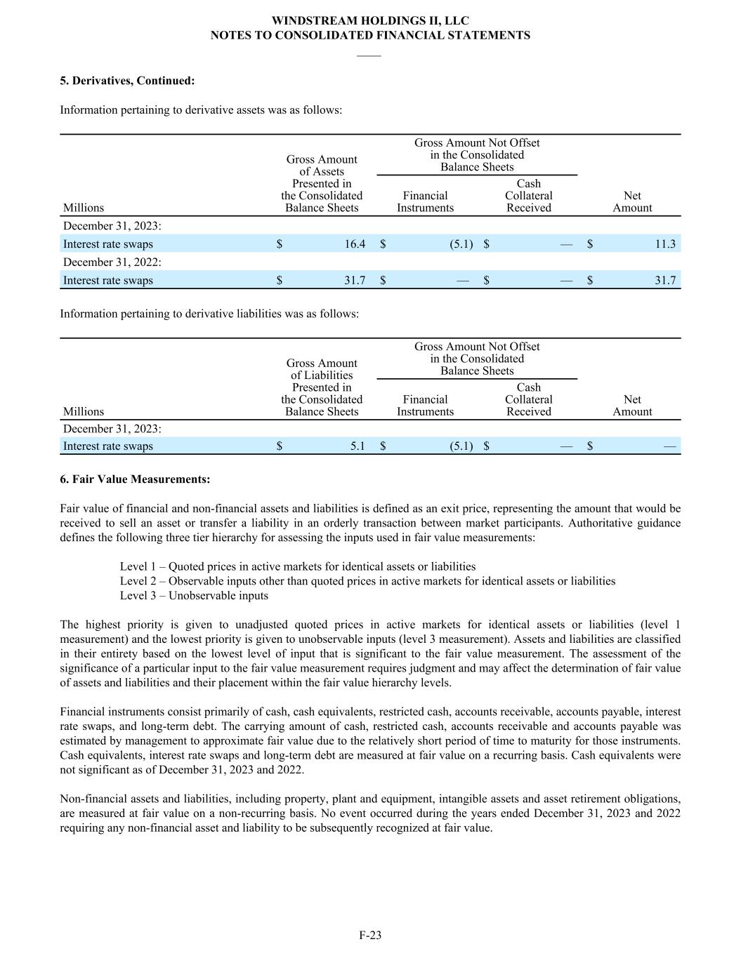 5. Derivatives, Continued: Information pertaining to derivative assets was as follows: Gross Amount of Assets Presented in the Consolidated Balance Sheets Gross Amount Not Offset in the Consolidated Balance Sheets Millions Financial Instruments Cash Collateral Received Net Amount December 31, 2023: Interest rate swaps $ 16.4 $ (5.1) $ — $ 11.3 December 31, 2022: Interest rate swaps $ 31.7 $ — $ — $ 31.7 Information pertaining to derivative liabilities was as follows: Gross Amount of Liabilities Presented in the Consolidated Balance Sheets Gross Amount Not Offset in the Consolidated Balance Sheets Millions Financial Instruments Cash Collateral Received Net Amount December 31, 2023: Interest rate swaps $ 5.1 $ (5.1) $ — $ — 6. Fair Value Measurements: Fair value of financial and non-financial assets and liabilities is defined as an exit price, representing the amount that would be received to sell an asset or transfer a liability in an orderly transaction between market participants. Authoritative guidance defines the following three tier hierarchy for assessing the inputs used in fair value measurements: Level 1 – Quoted prices in active markets for identical assets or liabilities Level 2 – Observable inputs other than quoted prices in active markets for identical assets or liabilities Level 3 – Unobservable inputs The highest priority is given to unadjusted quoted prices in active markets for identical assets or liabilities (level 1 measurement) and the lowest priority is given to unobservable inputs (level 3 measurement). Assets and liabilities are classified in their entirety based on the lowest level of input that is significant to the fair value measurement. The assessment of the significance of a particular input to the fair value measurement requires judgment and may affect the determination of fair value of assets and liabilities and their placement within the fair value hierarchy levels. Financial instruments consist primarily of cash, cash equivalents, restricted cash, accounts receivable, accounts payable, interest rate swaps, and long-term debt. The carrying amount of cash, restricted cash, accounts receivable and accounts payable was estimated by management to approximate fair value due to the relatively short period of time to maturity for those instruments. Cash equivalents, interest rate swaps and long-term debt are measured at fair value on a recurring basis. Cash equivalents were not significant as of December 31, 2023 and 2022. Non-financial assets and liabilities, including property, plant and equipment, intangible assets and asset retirement obligations, are measured at fair value on a non-recurring basis. No event occurred during the years ended December 31, 2023 and 2022 requiring any non-financial asset and liability to be subsequently recognized at fair value. WINDSTREAM HOLDINGS II, LLC NOTES TO CONSOLIDATED FINANCIAL STATEMENTS ____ F-23
