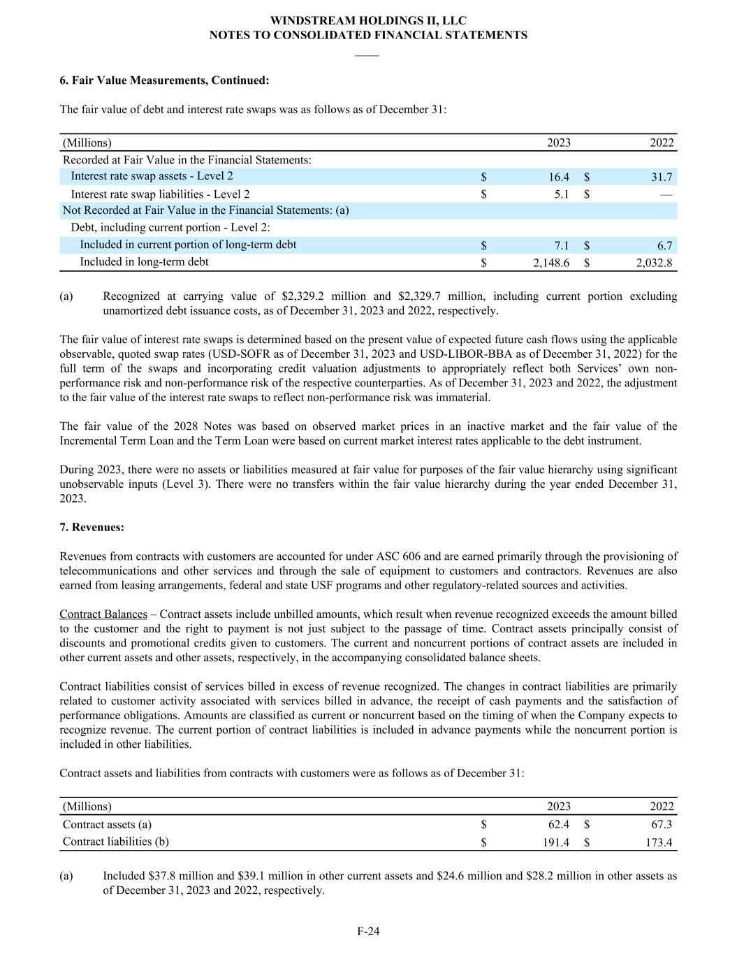 6. Fair Value Measurements, Continued: The fair value of debt and interest rate swaps was as follows as of December 31: (Millions) 2023 2022 Recorded at Fair Value in the Financial Statements: Interest rate swap assets - Level 2 $ 16.4 $ 31.7 Interest rate swap liabilities - Level 2 $ 5.1 $ — Not Recorded at Fair Value in the Financial Statements: (a) Debt, including current portion - Level 2: Included in current portion of long-term debt $ 7.1 $ 6.7 Included in long-term debt $ 2,148.6 $ 2,032.8 (a) Recognized at carrying value of $2,329.2 million and $2,329.7 million, including current portion excluding unamortized debt issuance costs, as of December 31, 2023 and 2022, respectively. The fair value of interest rate swaps is determined based on the present value of expected future cash flows using the applicable observable, quoted swap rates (USD-SOFR as of December 31, 2023 and USD-LIBOR-BBA as of December 31, 2022) for the full term of the swaps and incorporating credit valuation adjustments to appropriately reflect both Services’ own non- performance risk and non-performance risk of the respective counterparties. As of December 31, 2023 and 2022, the adjustment to the fair value of the interest rate swaps to reflect non-performance risk was immaterial. The fair value of the 2028 Notes was based on observed market prices in an inactive market and the fair value of the Incremental Term Loan and the Term Loan were based on current market interest rates applicable to the debt instrument. During 2023, there were no assets or liabilities measured at fair value for purposes of the fair value hierarchy using significant unobservable inputs (Level 3). There were no transfers within the fair value hierarchy during the year ended December 31, 2023. 7. Revenues: Revenues from contracts with customers are accounted for under ASC 606 and are earned primarily through the provisioning of telecommunications and other services and through the sale of equipment to customers and contractors. Revenues are also earned from leasing arrangements, federal and state USF programs and other regulatory-related sources and activities. Contract Balances – Contract assets include unbilled amounts, which result when revenue recognized exceeds the amount billed to the customer and the right to payment is not just subject to the passage of time. Contract assets principally consist of discounts and promotional credits given to customers. The current and noncurrent portions of contract assets are included in other current assets and other assets, respectively, in the accompanying consolidated balance sheets. Contract liabilities consist of services billed in excess of revenue recognized. The changes in contract liabilities are primarily related to customer activity associated with services billed in advance, the receipt of cash payments and the satisfaction of performance obligations. Amounts are classified as current or noncurrent based on the timing of when the Company expects to recognize revenue. The current portion of contract liabilities is included in advance payments while the noncurrent portion is included in other liabilities. Contract assets and liabilities from contracts with customers were as follows as of December 31: (Millions) 2023 2022 Contract assets (a) $ 62.4 $ 67.3 Contract liabilities (b) $ 191.4 $ 173.4 (a) Included $37.8 million and $39.1 million in other current assets and $24.6 million and $28.2 million in other assets as of December 31, 2023 and 2022, respectively. WINDSTREAM HOLDINGS II, LLC NOTES TO CONSOLIDATED FINANCIAL STATEMENTS ____ F-24