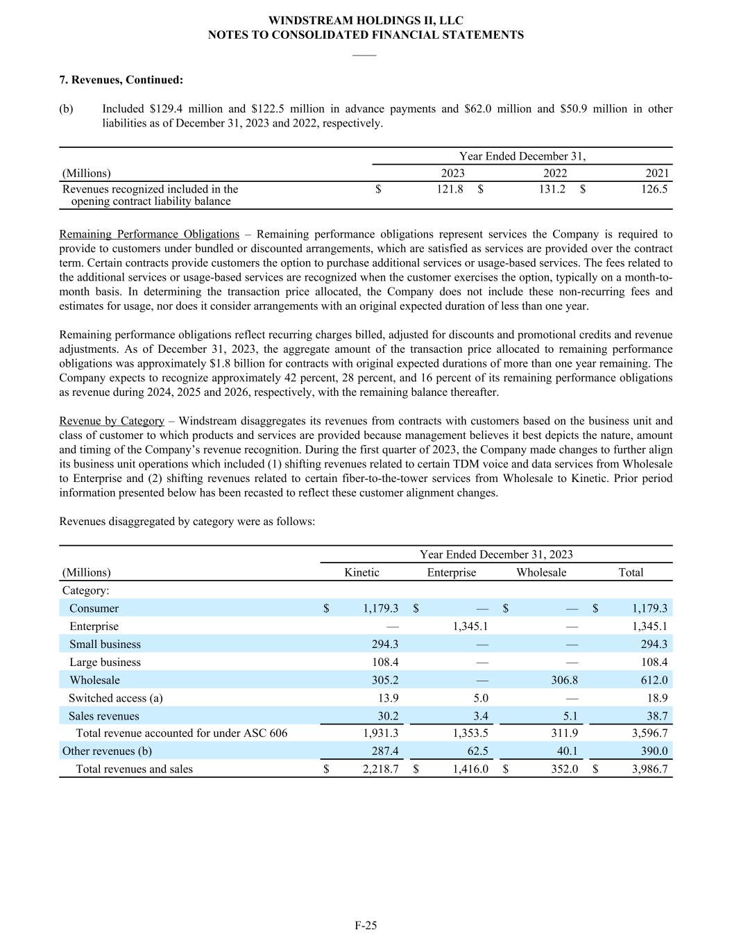 7. Revenues, Continued: (b) Included $129.4 million and $122.5 million in advance payments and $62.0 million and $50.9 million in other liabilities as of December 31, 2023 and 2022, respectively. Year Ended December 31, (Millions) 2023 2022 2021 Revenues recognized included in the opening contract liability balance $ 121.8 $ 131.2 $ 126.5 Remaining Performance Obligations – Remaining performance obligations represent services the Company is required to provide to customers under bundled or discounted arrangements, which are satisfied as services are provided over the contract term. Certain contracts provide customers the option to purchase additional services or usage-based services. The fees related to the additional services or usage-based services are recognized when the customer exercises the option, typically on a month-to- month basis. In determining the transaction price allocated, the Company does not include these non-recurring fees and estimates for usage, nor does it consider arrangements with an original expected duration of less than one year. Remaining performance obligations reflect recurring charges billed, adjusted for discounts and promotional credits and revenue adjustments. As of December 31, 2023, the aggregate amount of the transaction price allocated to remaining performance obligations was approximately $1.8 billion for contracts with original expected durations of more than one year remaining. The Company expects to recognize approximately 42 percent, 28 percent, and 16 percent of its remaining performance obligations as revenue during 2024, 2025 and 2026, respectively, with the remaining balance thereafter. Revenue by Category – Windstream disaggregates its revenues from contracts with customers based on the business unit and class of customer to which products and services are provided because management believes it best depicts the nature, amount and timing of the Company’s revenue recognition. During the first quarter of 2023, the Company made changes to further align its business unit operations which included (1) shifting revenues related to certain TDM voice and data services from Wholesale to Enterprise and (2) shifting revenues related to certain fiber-to-the-tower services from Wholesale to Kinetic. Prior period information presented below has been recasted to reflect these customer alignment changes. Revenues disaggregated by category were as follows: Year Ended December 31, 2023 (Millions) Kinetic Enterprise Wholesale Total Category: Consumer $ 1,179.3 $ — $ — $ 1,179.3 Enterprise — 1,345.1 — 1,345.1 Small business 294.3 — — 294.3 Large business 108.4 — — 108.4 Wholesale 305.2 — 306.8 612.0 Switched access (a) 13.9 5.0 — 18.9 Sales revenues 30.2 3.4 5.1 38.7 Total revenue accounted for under ASC 606 1,931.3 1,353.5 311.9 3,596.7 Other revenues (b) 287.4 62.5 40.1 390.0 Total revenues and sales $ 2,218.7 $ 1,416.0 $ 352.0 $ 3,986.7 WINDSTREAM HOLDINGS II, LLC NOTES TO CONSOLIDATED FINANCIAL STATEMENTS ____ F-25