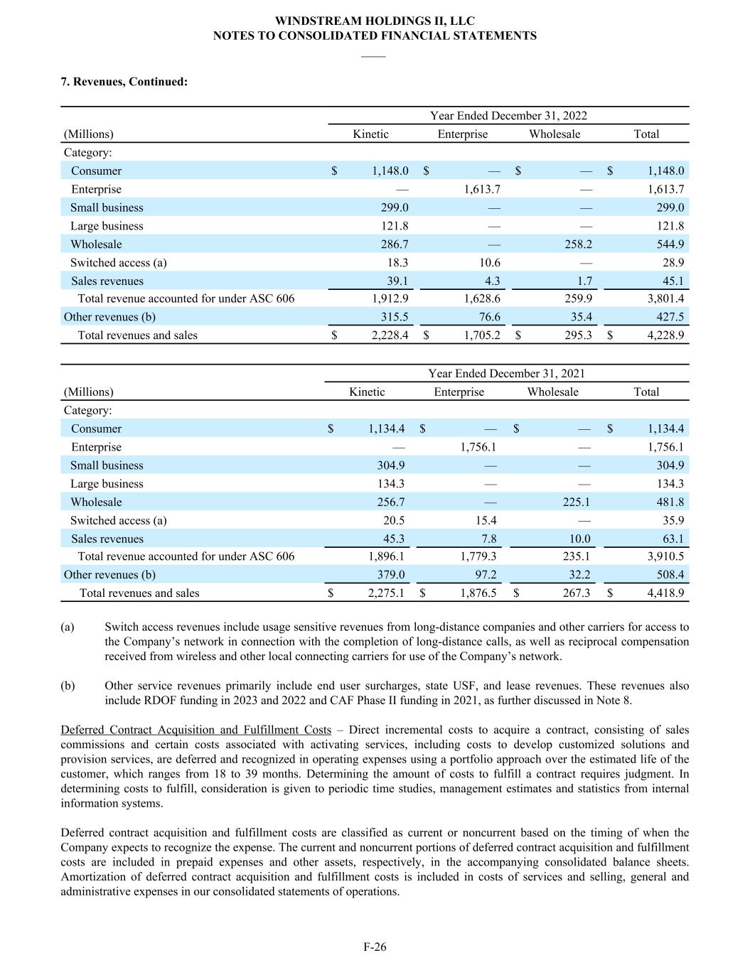 7. Revenues, Continued: Year Ended December 31, 2022 (Millions) Kinetic Enterprise Wholesale Total Category: Consumer $ 1,148.0 $ — $ — $ 1,148.0 Enterprise — 1,613.7 — 1,613.7 Small business 299.0 — — 299.0 Large business 121.8 — — 121.8 Wholesale 286.7 — 258.2 544.9 Switched access (a) 18.3 10.6 — 28.9 Sales revenues 39.1 4.3 1.7 45.1 Total revenue accounted for under ASC 606 1,912.9 1,628.6 259.9 3,801.4 Other revenues (b) 315.5 76.6 35.4 427.5 Total revenues and sales $ 2,228.4 $ 1,705.2 $ 295.3 $ 4,228.9 Year Ended December 31, 2021 (Millions) Kinetic Enterprise Wholesale Total Category: Consumer $ 1,134.4 $ — $ — $ 1,134.4 Enterprise — 1,756.1 — 1,756.1 Small business 304.9 — — 304.9 Large business 134.3 — — 134.3 Wholesale 256.7 — 225.1 481.8 Switched access (a) 20.5 15.4 — 35.9 Sales revenues 45.3 7.8 10.0 63.1 Total revenue accounted for under ASC 606 1,896.1 1,779.3 235.1 3,910.5 Other revenues (b) 379.0 97.2 32.2 508.4 Total revenues and sales $ 2,275.1 $ 1,876.5 $ 267.3 $ 4,418.9 (a) Switch access revenues include usage sensitive revenues from long-distance companies and other carriers for access to the Company’s network in connection with the completion of long-distance calls, as well as reciprocal compensation received from wireless and other local connecting carriers for use of the Company’s network. (b) Other service revenues primarily include end user surcharges, state USF, and lease revenues. These revenues also include RDOF funding in 2023 and 2022 and CAF Phase II funding in 2021, as further discussed in Note 8. Deferred Contract Acquisition and Fulfillment Costs – Direct incremental costs to acquire a contract, consisting of sales commissions and certain costs associated with activating services, including costs to develop customized solutions and provision services, are deferred and recognized in operating expenses using a portfolio approach over the estimated life of the customer, which ranges from 18 to 39 months. Determining the amount of costs to fulfill a contract requires judgment. In determining costs to fulfill, consideration is given to periodic time studies, management estimates and statistics from internal information systems. Deferred contract acquisition and fulfillment costs are classified as current or noncurrent based on the timing of when the Company expects to recognize the expense. The current and noncurrent portions of deferred contract acquisition and fulfillment costs are included in prepaid expenses and other assets, respectively, in the accompanying consolidated balance sheets. Amortization of deferred contract acquisition and fulfillment costs is included in costs of services and selling, general and administrative expenses in our consolidated statements of operations. WINDSTREAM HOLDINGS II, LLC NOTES TO CONSOLIDATED FINANCIAL STATEMENTS ____ F-26