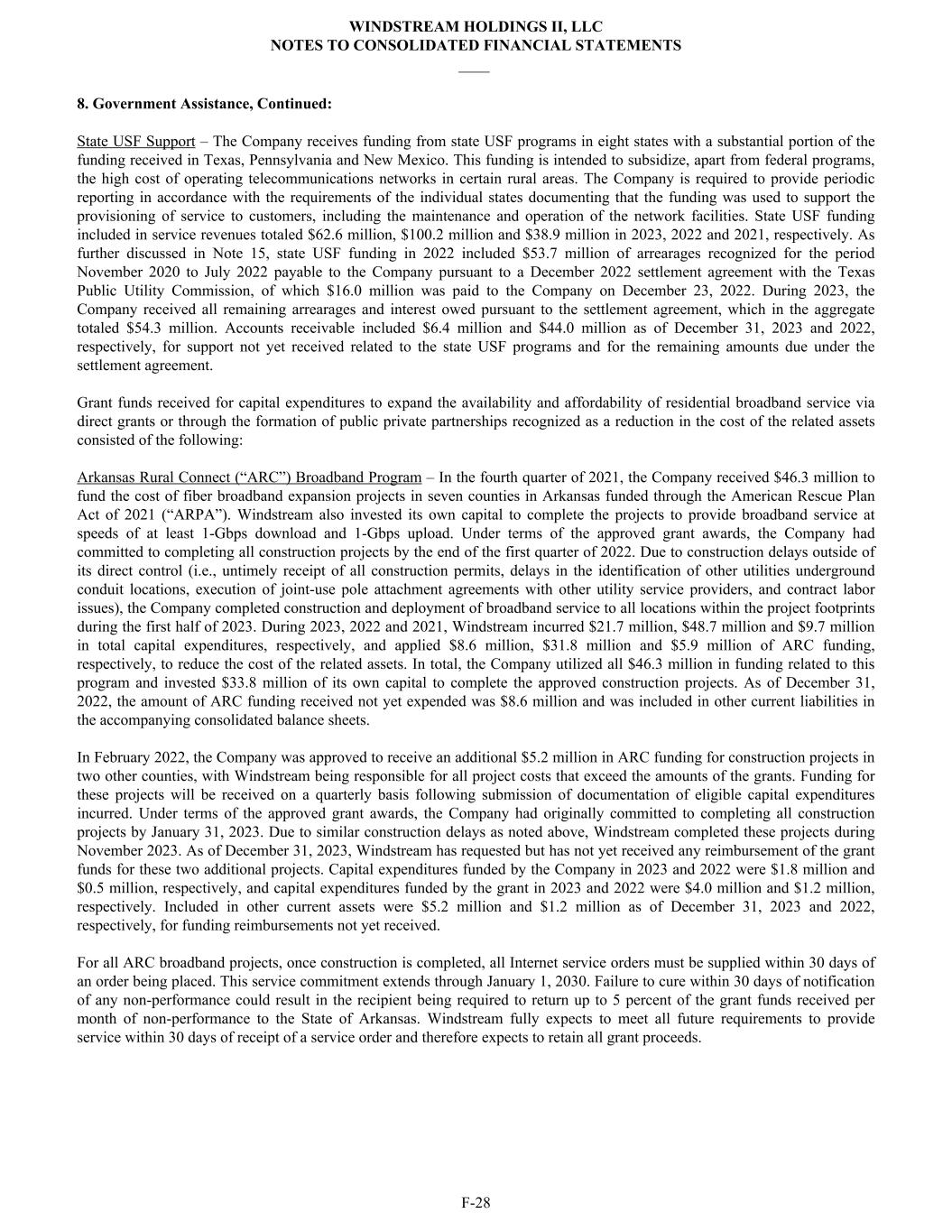 8. Government Assistance, Continued: State USF Support – The Company receives funding from state USF programs in eight states with a substantial portion of the funding received in Texas, Pennsylvania and New Mexico. This funding is intended to subsidize, apart from federal programs, the high cost of operating telecommunications networks in certain rural areas. The Company is required to provide periodic reporting in accordance with the requirements of the individual states documenting that the funding was used to support the provisioning of service to customers, including the maintenance and operation of the network facilities. State USF funding included in service revenues totaled $62.6 million, $100.2 million and $38.9 million in 2023, 2022 and 2021, respectively. As further discussed in Note 15, state USF funding in 2022 included $53.7 million of arrearages recognized for the period November 2020 to July 2022 payable to the Company pursuant to a December 2022 settlement agreement with the Texas Public Utility Commission, of which $16.0 million was paid to the Company on December 23, 2022. During 2023, the Company received all remaining arrearages and interest owed pursuant to the settlement agreement, which in the aggregate totaled $54.3 million. Accounts receivable included $6.4 million and $44.0 million as of December 31, 2023 and 2022, respectively, for support not yet received related to the state USF programs and for the remaining amounts due under the settlement agreement. Grant funds received for capital expenditures to expand the availability and affordability of residential broadband service via direct grants or through the formation of public private partnerships recognized as a reduction in the cost of the related assets consisted of the following: Arkansas Rural Connect (“ARC”) Broadband Program – In the fourth quarter of 2021, the Company received $46.3 million to fund the cost of fiber broadband expansion projects in seven counties in Arkansas funded through the American Rescue Plan Act of 2021 (“ARPA”). Windstream also invested its own capital to complete the projects to provide broadband service at speeds of at least 1-Gbps download and 1-Gbps upload. Under terms of the approved grant awards, the Company had committed to completing all construction projects by the end of the first quarter of 2022. Due to construction delays outside of its direct control (i.e., untimely receipt of all construction permits, delays in the identification of other utilities underground conduit locations, execution of joint-use pole attachment agreements with other utility service providers, and contract labor issues), the Company completed construction and deployment of broadband service to all locations within the project footprints during the first half of 2023. During 2023, 2022 and 2021, Windstream incurred $21.7 million, $48.7 million and $9.7 million in total capital expenditures, respectively, and applied $8.6 million, $31.8 million and $5.9 million of ARC funding, respectively, to reduce the cost of the related assets. In total, the Company utilized all $46.3 million in funding related to this program and invested $33.8 million of its own capital to complete the approved construction projects. As of December 31, 2022, the amount of ARC funding received not yet expended was $8.6 million and was included in other current liabilities in the accompanying consolidated balance sheets. In February 2022, the Company was approved to receive an additional $5.2 million in ARC funding for construction projects in two other counties, with Windstream being responsible for all project costs that exceed the amounts of the grants. Funding for these projects will be received on a quarterly basis following submission of documentation of eligible capital expenditures incurred. Under terms of the approved grant awards, the Company had originally committed to completing all construction projects by January 31, 2023. Due to similar construction delays as noted above, Windstream completed these projects during November 2023. As of December 31, 2023, Windstream has requested but has not yet received any reimbursement of the grant funds for these two additional projects. Capital expenditures funded by the Company in 2023 and 2022 were $1.8 million and $0.5 million, respectively, and capital expenditures funded by the grant in 2023 and 2022 were $4.0 million and $1.2 million, respectively. Included in other current assets were $5.2 million and $1.2 million as of December 31, 2023 and 2022, respectively, for funding reimbursements not yet received. For all ARC broadband projects, once construction is completed, all Internet service orders must be supplied within 30 days of an order being placed. This service commitment extends through January 1, 2030. Failure to cure within 30 days of notification of any non-performance could result in the recipient being required to return up to 5 percent of the grant funds received per month of non-performance to the State of Arkansas. Windstream fully expects to meet all future requirements to provide service within 30 days of receipt of a service order and therefore expects to retain all grant proceeds. WINDSTREAM HOLDINGS II, LLC NOTES TO CONSOLIDATED FINANCIAL STATEMENTS ____ F-28