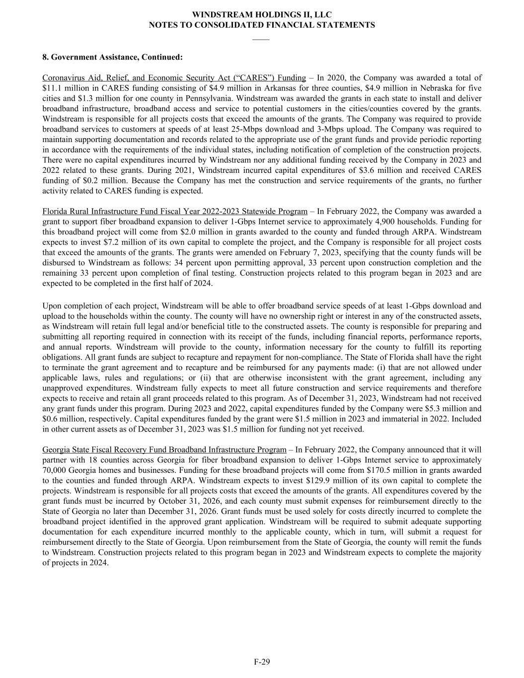 8. Government Assistance, Continued: Coronavirus Aid, Relief, and Economic Security Act (“CARES”) Funding – In 2020, the Company was awarded a total of $11.1 million in CARES funding consisting of $4.9 million in Arkansas for three counties, $4.9 million in Nebraska for five cities and $1.3 million for one county in Pennsylvania. Windstream was awarded the grants in each state to install and deliver broadband infrastructure, broadband access and service to potential customers in the cities/counties covered by the grants. Windstream is responsible for all projects costs that exceed the amounts of the grants. The Company was required to provide broadband services to customers at speeds of at least 25-Mbps download and 3-Mbps upload. The Company was required to maintain supporting documentation and records related to the appropriate use of the grant funds and provide periodic reporting in accordance with the requirements of the individual states, including notification of completion of the construction projects. There were no capital expenditures incurred by Windstream nor any additional funding received by the Company in 2023 and 2022 related to these grants. During 2021, Windstream incurred capital expenditures of $3.6 million and received CARES funding of $0.2 million. Because the Company has met the construction and service requirements of the grants, no further activity related to CARES funding is expected. Florida Rural Infrastructure Fund Fiscal Year 2022-2023 Statewide Program – In February 2022, the Company was awarded a grant to support fiber broadband expansion to deliver 1-Gbps Internet service to approximately 4,900 households. Funding for this broadband project will come from $2.0 million in grants awarded to the county and funded through ARPA. Windstream expects to invest $7.2 million of its own capital to complete the project, and the Company is responsible for all project costs that exceed the amounts of the grants. The grants were amended on February 7, 2023, specifying that the county funds will be disbursed to Windstream as follows: 34 percent upon permitting approval, 33 percent upon construction completion and the remaining 33 percent upon completion of final testing. Construction projects related to this program began in 2023 and are expected to be completed in the first half of 2024. Upon completion of each project, Windstream will be able to offer broadband service speeds of at least 1-Gbps download and upload to the households within the county. The county will have no ownership right or interest in any of the constructed assets, as Windstream will retain full legal and/or beneficial title to the constructed assets. The county is responsible for preparing and submitting all reporting required in connection with its receipt of the funds, including financial reports, performance reports, and annual reports. Windstream will provide to the county, information necessary for the county to fulfill its reporting obligations. All grant funds are subject to recapture and repayment for non-compliance. The State of Florida shall have the right to terminate the grant agreement and to recapture and be reimbursed for any payments made: (i) that are not allowed under applicable laws, rules and regulations; or (ii) that are otherwise inconsistent with the grant agreement, including any unapproved expenditures. Windstream fully expects to meet all future construction and service requirements and therefore expects to receive and retain all grant proceeds related to this program. As of December 31, 2023, Windstream had not received any grant funds under this program. During 2023 and 2022, capital expenditures funded by the Company were $5.3 million and $0.6 million, respectively. Capital expenditures funded by the grant were $1.5 million in 2023 and immaterial in 2022. Included in other current assets as of December 31, 2023 was $1.5 million for funding not yet received. Georgia State Fiscal Recovery Fund Broadband Infrastructure Program – In February 2022, the Company announced that it will partner with 18 counties across Georgia for fiber broadband expansion to deliver 1-Gbps Internet service to approximately 70,000 Georgia homes and businesses. Funding for these broadband projects will come from $170.5 million in grants awarded to the counties and funded through ARPA. Windstream expects to invest $129.9 million of its own capital to complete the projects. Windstream is responsible for all projects costs that exceed the amounts of the grants. All expenditures covered by the grant funds must be incurred by October 31, 2026, and each county must submit expenses for reimbursement directly to the State of Georgia no later than December 31, 2026. Grant funds must be used solely for costs directly incurred to complete the broadband project identified in the approved grant application. Windstream will be required to submit adequate supporting documentation for each expenditure incurred monthly to the applicable county, which in turn, will submit a request for reimbursement directly to the State of Georgia. Upon reimbursement from the State of Georgia, the county will remit the funds to Windstream. Construction projects related to this program began in 2023 and Windstream expects to complete the majority of projects in 2024. WINDSTREAM HOLDINGS II, LLC NOTES TO CONSOLIDATED FINANCIAL STATEMENTS ____ F-29