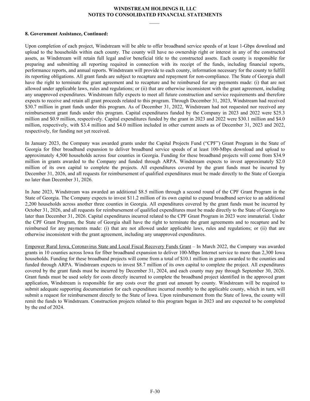 8. Government Assistance, Continued: Upon completion of each project, Windstream will be able to offer broadband service speeds of at least 1-Gbps download and upload to the households within each county. The county will have no ownership right or interest in any of the constructed assets, as Windstream will retain full legal and/or beneficial title to the constructed assets. Each county is responsible for preparing and submitting all reporting required in connection with its receipt of the funds, including financial reports, performance reports, and annual reports. Windstream will provide to each county, information necessary for the county to fulfill its reporting obligations. All grant funds are subject to recapture and repayment for non-compliance. The State of Georgia shall have the right to terminate the grant agreement and to recapture and be reimbursed for any payments made: (i) that are not allowed under applicable laws, rules and regulations; or (ii) that are otherwise inconsistent with the grant agreement, including any unapproved expenditures. Windstream fully expects to meet all future construction and service requirements and therefore expects to receive and retain all grant proceeds related to this program. Through December 31, 2023, Windstream had received $30.7 million in grant funds under this program. As of December 31, 2022, Windstream had not requested nor received any reimbursement grant funds under this program. Capital expenditures funded by the Company in 2023 and 2022 were $25.3 million and $0.9 million, respectively. Capital expenditures funded by the grant in 2023 and 2022 were $30.1 million and $4.0 million, respectively, with $3.4 million and $4.0 million included in other current assets as of December 31, 2023 and 2022, respectively, for funding not yet received. In January 2023, the Company was awarded grants under the Capital Projects Fund (“CPF”) Grant Program in the State of Georgia for fiber broadband expansion to deliver broadband service speeds of at least 100-Mbps download and upload to approximately 4,500 households across four counties in Georgia. Funding for these broadband projects will come from $34.9 million in grants awarded to the Company and funded through ARPA. Windstream expects to invest approximately $2.0 million of its own capital to complete the projects. All expenditures covered by the grant funds must be incurred by December 31, 2026, and all requests for reimbursement of qualified expenditures must be made directly to the State of Georgia no later than December 31, 2026. In June 2023, Windstream was awarded an additional $8.5 million through a second round of the CPF Grant Program in the State of Georgia. The Company expects to invest $11.2 million of its own capital to expand broadband service to an additional 2,200 households across another three counties in Georgia. All expenditures covered by the grant funds must be incurred by October 31, 2026, and all requests for reimbursement of qualified expenditures must be made directly to the State of Georgia no later than December 31, 2026. Capital expenditures incurred related to the CPF Grant Program in 2023 were immaterial. Under the CPF Grant Program, the State of Georgia shall have the right to terminate the grant agreements and to recapture and be reimbursed for any payments made: (i) that are not allowed under applicable laws, rules and regulations; or (ii) that are otherwise inconsistent with the grant agreement, including any unapproved expenditures. Empower Rural Iowa, Coronavirus State and Local Fiscal Recovery Funds Grant – In March 2022, the Company was awarded grants in 10 counties across Iowa for fiber broadband expansion to deliver 100-Mbps Internet service to more than 2,300 Iowa households. Funding for these broadband projects will come from a total of $10.1 million in grants awarded to the counties and funded through ARPA. Windstream expects to invest $8.7 million of its own capital to complete the project. All expenditures covered by the grant funds must be incurred by December 31, 2024, and each county may pay through September 30, 2026. Grant funds must be used solely for costs directly incurred to complete the broadband project identified in the approved grant application, Windstream is responsible for any costs over the grant out amount by county. Windstream will be required to submit adequate supporting documentation for each expenditure incurred monthly to the applicable county, which in turn, will submit a request for reimbursement directly to the State of Iowa. Upon reimbursement from the State of Iowa, the county will remit the funds to Windstream. Construction projects related to this program began in 2023 and are expected to be completed by the end of 2024. WINDSTREAM HOLDINGS II, LLC NOTES TO CONSOLIDATED FINANCIAL STATEMENTS ____ F-30