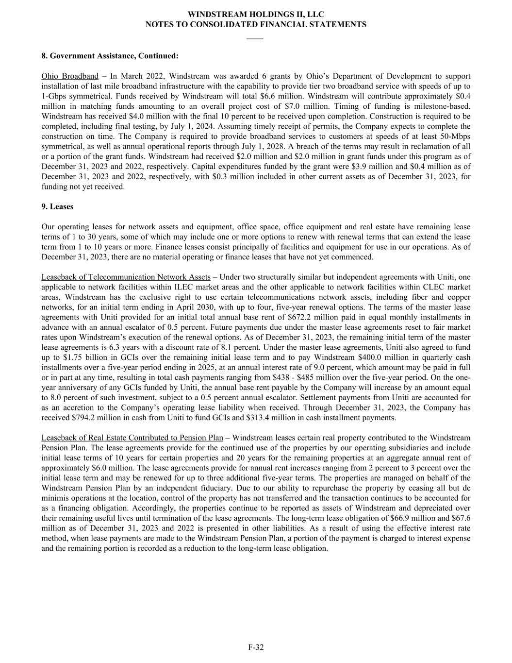 8. Government Assistance, Continued: Ohio Broadband – In March 2022, Windstream was awarded 6 grants by Ohio’s Department of Development to support installation of last mile broadband infrastructure with the capability to provide tier two broadband service with speeds of up to 1-Gbps symmetrical. Funds received by Windstream will total $6.6 million. Windstream will contribute approximately $0.4 million in matching funds amounting to an overall project cost of $7.0 million. Timing of funding is milestone-based. Windstream has received $4.0 million with the final 10 percent to be received upon completion. Construction is required to be completed, including final testing, by July 1, 2024. Assuming timely receipt of permits, the Company expects to complete the construction on time. The Company is required to provide broadband services to customers at speeds of at least 50-Mbps symmetrical, as well as annual operational reports through July 1, 2028. A breach of the terms may result in reclamation of all or a portion of the grant funds. Windstream had received $2.0 million and $2.0 million in grant funds under this program as of December 31, 2023 and 2022, respectively. Capital expenditures funded by the grant were $3.9 million and $0.4 million as of December 31, 2023 and 2022, respectively, with $0.3 million included in other current assets as of December 31, 2023, for funding not yet received. 9. Leases Our operating leases for network assets and equipment, office space, office equipment and real estate have remaining lease terms of 1 to 30 years, some of which may include one or more options to renew with renewal terms that can extend the lease term from 1 to 10 years or more. Finance leases consist principally of facilities and equipment for use in our operations. As of December 31, 2023, there are no material operating or finance leases that have not yet commenced. Leaseback of Telecommunication Network Assets – Under two structurally similar but independent agreements with Uniti, one applicable to network facilities within ILEC market areas and the other applicable to network facilities within CLEC market areas, Windstream has the exclusive right to use certain telecommunications network assets, including fiber and copper networks, for an initial term ending in April 2030, with up to four, five-year renewal options. The terms of the master lease agreements with Uniti provided for an initial total annual base rent of $672.2 million paid in equal monthly installments in advance with an annual escalator of 0.5 percent. Future payments due under the master lease agreements reset to fair market rates upon Windstream’s execution of the renewal options. As of December 31, 2023, the remaining initial term of the master lease agreements is 6.3 years with a discount rate of 8.1 percent. Under the master lease agreements, Uniti also agreed to fund up to $1.75 billion in GCIs over the remaining initial lease term and to pay Windstream $400.0 million in quarterly cash installments over a five-year period ending in 2025, at an annual interest rate of 9.0 percent, which amount may be paid in full or in part at any time, resulting in total cash payments ranging from $438 - $485 million over the five-year period. On the one- year anniversary of any GCIs funded by Uniti, the annual base rent payable by the Company will increase by an amount equal to 8.0 percent of such investment, subject to a 0.5 percent annual escalator. Settlement payments from Uniti are accounted for as an accretion to the Company’s operating lease liability when received. Through December 31, 2023, the Company has received $794.2 million in cash from Uniti to fund GCIs and $313.4 million in cash installment payments. Leaseback of Real Estate Contributed to Pension Plan – Windstream leases certain real property contributed to the Windstream Pension Plan. The lease agreements provide for the continued use of the properties by our operating subsidiaries and include initial lease terms of 10 years for certain properties and 20 years for the remaining properties at an aggregate annual rent of approximately $6.0 million. The lease agreements provide for annual rent increases ranging from 2 percent to 3 percent over the initial lease term and may be renewed for up to three additional five-year terms. The properties are managed on behalf of the Windstream Pension Plan by an independent fiduciary. Due to our ability to repurchase the property by ceasing all but de minimis operations at the location, control of the property has not transferred and the transaction continues to be accounted for as a financing obligation. Accordingly, the properties continue to be reported as assets of Windstream and depreciated over their remaining useful lives until termination of the lease agreements. The long-term lease obligation of $66.9 million and $67.6 million as of December 31, 2023 and 2022 is presented in other liabilities. As a result of using the effective interest rate method, when lease payments are made to the Windstream Pension Plan, a portion of the payment is charged to interest expense and the remaining portion is recorded as a reduction to the long-term lease obligation. WINDSTREAM HOLDINGS II, LLC NOTES TO CONSOLIDATED FINANCIAL STATEMENTS ____ F-32