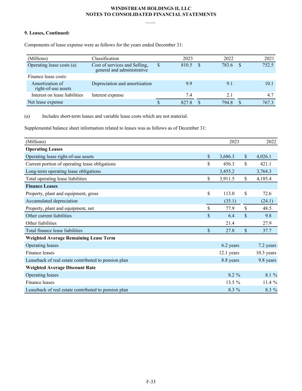 9. Leases, Continued: Components of lease expense were as follows for the years ended December 31: (Millions) Classification 2023 2022 2021 Operating lease costs (a) Cost of services and Selling, general and administrative $ 810.5 $ 783.6 $ 752.5 Finance lease costs: Amortization of right-of-use assets Depreciation and amortization 9.9 9.1 10.1 Interest on lease liabilities Interest expense 7.4 2.1 4.7 Net lease expense $ 827.8 $ 794.8 $ 767.3 (a) Includes short-term leases and variable lease costs which are not material. Supplemental balance sheet information related to leases was as follows as of December 31: (Millions) 2023 2022 Operating Leases Operating lease right-of-use assets $ 3,686.3 $ 4,026.1 Current portion of operating lease obligations $ 456.3 $ 421.1 Long-term operating lease obligations 3,455.2 3,764.3 Total operating lease liabilities $ 3,911.5 $ 4,185.4 Finance Leases Property, plant and equipment, gross $ 113.0 $ 72.6 Accumulated depreciation (35.1) (24.1) Property, plant and equipment, net $ 77.9 $ 48.5 Other current liabilities $ 6.4 $ 9.8 Other liabilities 21.4 27.9 Total finance lease liabilities $ 27.8 $ 37.7 Weighted Average Remaining Lease Term Operating leases 6.2 years 7.2 years Finance leases 12.1 years 10.3 years Leaseback of real estate contributed to pension plan 8.8 years 9.8 years Weighted Average Discount Rate Operating leases 8.2 % 8.1 % Finance leases 13.5 % 11.4 % Leaseback of real estate contributed to pension plan 8.3 % 8.3 % WINDSTREAM HOLDINGS II, LLC NOTES TO CONSOLIDATED FINANCIAL STATEMENTS ____ F-33