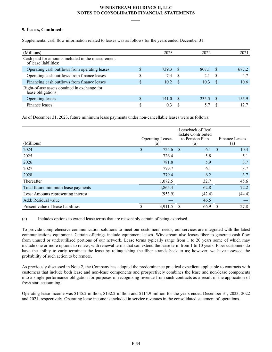 9. Leases, Continued: Supplemental cash flow information related to leases was as follows for the years ended December 31: (Millions) 2023 2022 2021 Cash paid for amounts included in the measurement of lease liabilities: Operating cash outflows from operating leases $ 739.3 $ 807.1 $ 677.2 Operating cash outflows from finance leases $ 7.4 $ 2.1 $ 4.7 Financing cash outflows from finance leases $ 10.2 $ 10.3 $ 10.6 Right-of-use assets obtained in exchange for lease obligations: Operating leases $ 141.0 $ 235.5 $ 155.9 Finance leases $ 0.3 $ 5.7 $ 12.7 As of December 31, 2023, future minimum lease payments under non-cancellable leases were as follows: (Millions) Operating Leases (a) Leaseback of Real Estate Contributed to Pension Plan (a) Finance Leases (a) 2024 $ 725.6 $ 6.1 $ 10.4 2025 726.4 5.8 5.1 2026 781.8 5.9 3.7 2027 779.7 6.1 3.7 2028 779.4 6.2 3.7 Thereafter 1,072.5 32.7 45.6 Total future minimum lease payments 4,865.4 62.8 72.2 Less: Amounts representing interest (953.9) (42.4) (44.4) Add: Residual value — 46.5 — Present value of lease liabilities $ 3,911.5 $ 66.9 $ 27.8 (a) Includes options to extend lease terms that are reasonably certain of being exercised. To provide comprehensive communication solutions to meet our customers’ needs, our services are integrated with the latest communications equipment. Certain offerings include equipment leases. Windstream also leases fiber to generate cash flow from unused or underutilized portions of our network. Lease terms typically range from 1 to 20 years some of which may include one or more options to renew, with renewal terms that can extend the lease term from 1 to 10 years. Fiber customers do have the ability to early terminate the lease by relinquishing the fiber strands back to us; however, we have assessed the probability of such action to be remote. As previously discussed in Note 2, the Company has adopted the predominance practical expedient applicable to contracts with customers that include both lease and non-lease components and prospectively combines the lease and non-lease components into a single performance obligation for purposes of recognizing revenue from such contracts as a result of the application of fresh start accounting. Operating lease income was $145.2 million, $132.2 million and $114.9 million for the years ended December 31, 2023, 2022 and 2021, respectively. Operating lease income is included in service revenues in the consolidated statement of operations. WINDSTREAM HOLDINGS II, LLC NOTES TO CONSOLIDATED FINANCIAL STATEMENTS ____ F-34