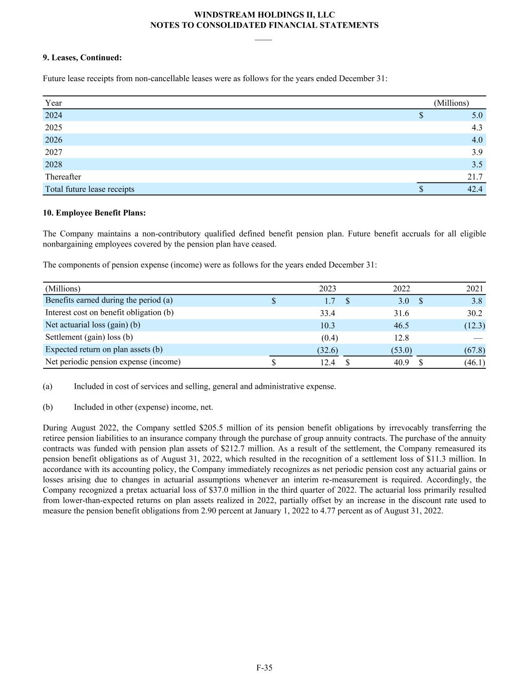 9. Leases, Continued: Future lease receipts from non-cancellable leases were as follows for the years ended December 31: Year (Millions) 2024 $ 5.0 2025 4.3 2026 4.0 2027 3.9 2028 3.5 Thereafter 21.7 Total future lease receipts $ 42.4 10. Employee Benefit Plans: The Company maintains a non-contributory qualified defined benefit pension plan. Future benefit accruals for all eligible nonbargaining employees covered by the pension plan have ceased. The components of pension expense (income) were as follows for the years ended December 31: (Millions) 2023 2022 2021 Benefits earned during the period (a) $ 1.7 $ 3.0 $ 3.8 Interest cost on benefit obligation (b) 33.4 31.6 30.2 Net actuarial loss (gain) (b) 10.3 46.5 (12.3) Settlement (gain) loss (b) (0.4) 12.8 — Expected return on plan assets (b) (32.6) (53.0) (67.8) Net periodic pension expense (income) $ 12.4 $ 40.9 $ (46.1) (a) Included in cost of services and selling, general and administrative expense. (b) Included in other (expense) income, net. During August 2022, the Company settled $205.5 million of its pension benefit obligations by irrevocably transferring the retiree pension liabilities to an insurance company through the purchase of group annuity contracts. The purchase of the annuity contracts was funded with pension plan assets of $212.7 million. As a result of the settlement, the Company remeasured its pension benefit obligations as of August 31, 2022, which resulted in the recognition of a settlement loss of $11.3 million. In accordance with its accounting policy, the Company immediately recognizes as net periodic pension cost any actuarial gains or losses arising due to changes in actuarial assumptions whenever an interim re-measurement is required. Accordingly, the Company recognized a pretax actuarial loss of $37.0 million in the third quarter of 2022. The actuarial loss primarily resulted from lower-than-expected returns on plan assets realized in 2022, partially offset by an increase in the discount rate used to measure the pension benefit obligations from 2.90 percent at January 1, 2022 to 4.77 percent as of August 31, 2022. WINDSTREAM HOLDINGS II, LLC NOTES TO CONSOLIDATED FINANCIAL STATEMENTS ____ F-35