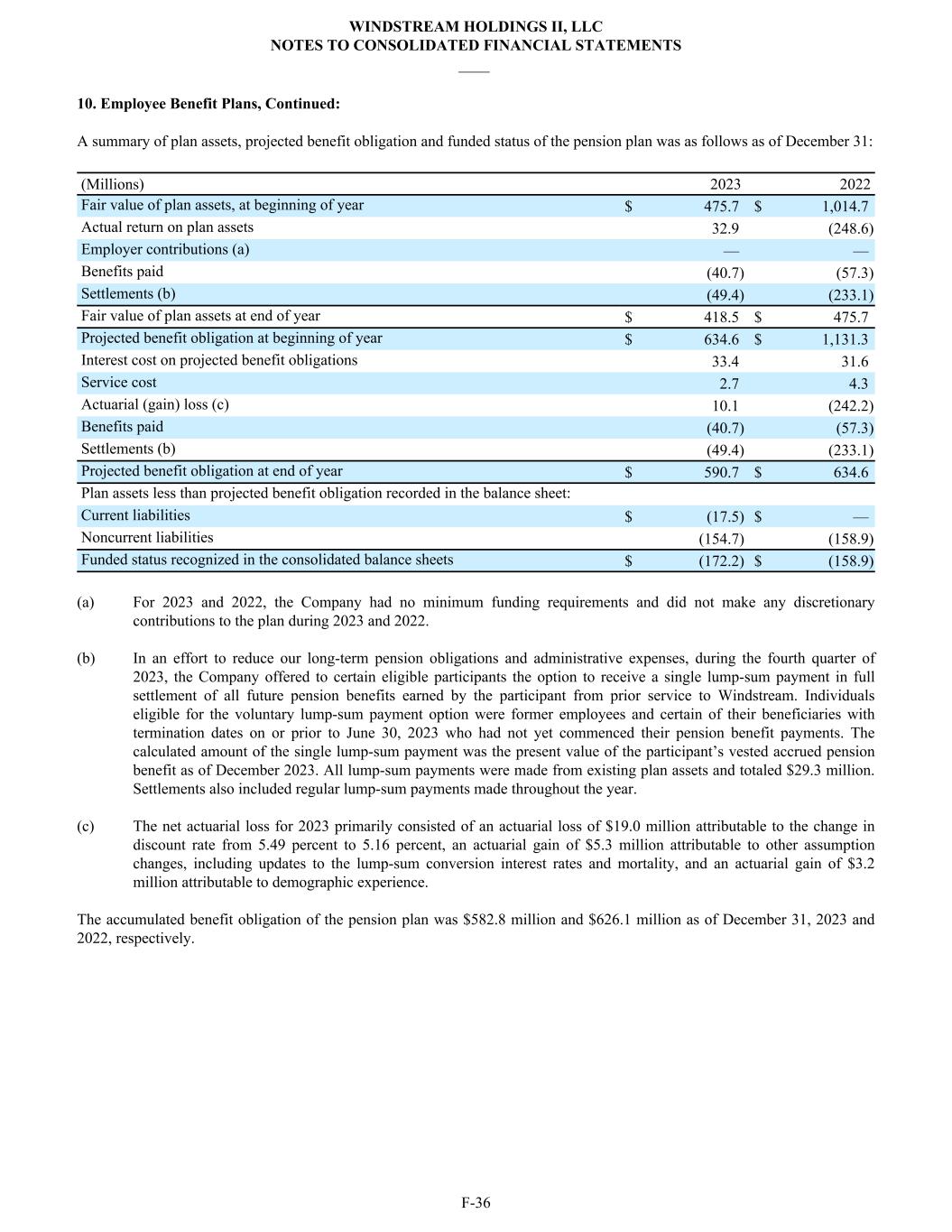 10. Employee Benefit Plans, Continued: A summary of plan assets, projected benefit obligation and funded status of the pension plan was as follows as of December 31: (Millions) 2023 2022 Fair value of plan assets, at beginning of year $ 475.7 $ 1,014.7 Actual return on plan assets 32.9 (248.6) Employer contributions (a) — — Benefits paid (40.7) (57.3) Settlements (b) (49.4) (233.1) Fair value of plan assets at end of year $ 418.5 $ 475.7 Projected benefit obligation at beginning of year $ 634.6 $ 1,131.3 Interest cost on projected benefit obligations 33.4 31.6 Service cost 2.7 4.3 Actuarial (gain) loss (c) 10.1 (242.2) Benefits paid (40.7) (57.3) Settlements (b) (49.4) (233.1) Projected benefit obligation at end of year $ 590.7 $ 634.6 Plan assets less than projected benefit obligation recorded in the balance sheet: Current liabilities $ (17.5) $ — Noncurrent liabilities (154.7) (158.9) Funded status recognized in the consolidated balance sheets $ (172.2) $ (158.9) (a) For 2023 and 2022, the Company had no minimum funding requirements and did not make any discretionary contributions to the plan during 2023 and 2022. (b) In an effort to reduce our long-term pension obligations and administrative expenses, during the fourth quarter of 2023, the Company offered to certain eligible participants the option to receive a single lump-sum payment in full settlement of all future pension benefits earned by the participant from prior service to Windstream. Individuals eligible for the voluntary lump-sum payment option were former employees and certain of their beneficiaries with termination dates on or prior to June 30, 2023 who had not yet commenced their pension benefit payments. The calculated amount of the single lump-sum payment was the present value of the participant’s vested accrued pension benefit as of December 2023. All lump-sum payments were made from existing plan assets and totaled $29.3 million. Settlements also included regular lump-sum payments made throughout the year. (c) The net actuarial loss for 2023 primarily consisted of an actuarial loss of $19.0 million attributable to the change in discount rate from 5.49 percent to 5.16 percent, an actuarial gain of $5.3 million attributable to other assumption changes, including updates to the lump-sum conversion interest rates and mortality, and an actuarial gain of $3.2 million attributable to demographic experience. The accumulated benefit obligation of the pension plan was $582.8 million and $626.1 million as of December 31, 2023 and 2022, respectively. WINDSTREAM HOLDINGS II, LLC NOTES TO CONSOLIDATED FINANCIAL STATEMENTS ____ F-36