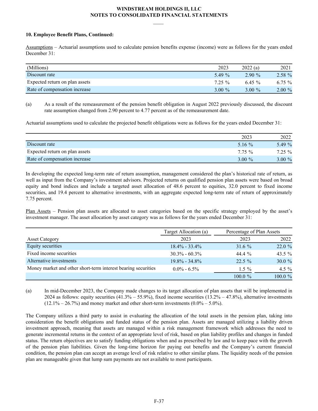 10. Employee Benefit Plans, Continued: Assumptions – Actuarial assumptions used to calculate pension benefits expense (income) were as follows for the years ended December 31: (Millions) 2023 2022 (a) 2021 Discount rate 5.49 % 2.90 % 2.58 % Expected return on plan assets 7.25 % 6.45 % 6.75 % Rate of compensation increase 3.00 % 3.00 % 2.00 % (a) As a result of the remeasurement of the pension benefit obligation in August 2022 previously discussed, the discount rate assumption changed from 2.90 percent to 4.77 percent as of the remeasurement date. Actuarial assumptions used to calculate the projected benefit obligations were as follows for the years ended December 31: 2023 2022 Discount rate 5.16 % 5.49 % Expected return on plan assets 7.75 % 7.25 % Rate of compensation increase 3.00 % 3.00 % In developing the expected long-term rate of return assumption, management considered the plan’s historical rate of return, as well as input from the Company’s investment advisors. Projected returns on qualified pension plan assets were based on broad equity and bond indices and include a targeted asset allocation of 48.6 percent to equities, 32.0 percent to fixed income securities, and 19.4 percent to alternative investments, with an aggregate expected long-term rate of return of approximately 7.75 percent. Plan Assets – Pension plan assets are allocated to asset categories based on the specific strategy employed by the asset’s investment manager. The asset allocation by asset category was as follows for the years ended December 31: Target Allocation (a) Percentage of Plan Assets Asset Category 2023 2023 2022 Equity securities 18.4% - 33.4% 31.6 % 22.0 % Fixed income securities 30.3% - 60.3% 44.4 % 43.5 % Alternative investments 19.8% - 34.8% 22.5 % 30.0 % Money market and other short-term interest bearing securities 0.0% - 6.5% 1.5 % 4.5 % 100.0 % 100.0 % (a) In mid-December 2023, the Company made changes to its target allocation of plan assets that will be implemented in 2024 as follows: equity securities (41.3% – 55.9%), fixed income securities (13.2% – 47.8%), alternative investments (12.1% – 26.7%) and money market and other short-term investments (0.0% – 5.0%). The Company utilizes a third party to assist in evaluating the allocation of the total assets in the pension plan, taking into consideration the benefit obligations and funded status of the pension plan. Assets are managed utilizing a liability driven investment approach, meaning that assets are managed within a risk management framework which addresses the need to generate incremental returns in the context of an appropriate level of risk, based on plan liability profiles and changes in funded status. The return objectives are to satisfy funding obligations when and as prescribed by law and to keep pace with the growth of the pension plan liabilities. Given the long-time horizon for paying out benefits and the Company’s current financial condition, the pension plan can accept an average level of risk relative to other similar plans. The liquidity needs of the pension plan are manageable given that lump sum payments are not available to most participants. WINDSTREAM HOLDINGS II, LLC NOTES TO CONSOLIDATED FINANCIAL STATEMENTS ____ F-37