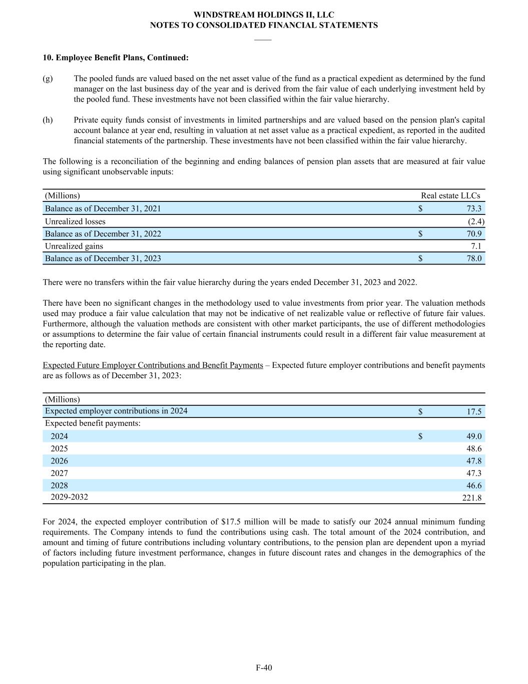 10. Employee Benefit Plans, Continued: (g) The pooled funds are valued based on the net asset value of the fund as a practical expedient as determined by the fund manager on the last business day of the year and is derived from the fair value of each underlying investment held by the pooled fund. These investments have not been classified within the fair value hierarchy. (h) Private equity funds consist of investments in limited partnerships and are valued based on the pension plan's capital account balance at year end, resulting in valuation at net asset value as a practical expedient, as reported in the audited financial statements of the partnership. These investments have not been classified within the fair value hierarchy. The following is a reconciliation of the beginning and ending balances of pension plan assets that are measured at fair value using significant unobservable inputs: (Millions) Real estate LLCs Balance as of December 31, 2021 $ 73.3 Unrealized losses (2.4) Balance as of December 31, 2022 $ 70.9 Unrealized gains 7.1 Balance as of December 31, 2023 $ 78.0 There were no transfers within the fair value hierarchy during the years ended December 31, 2023 and 2022. There have been no significant changes in the methodology used to value investments from prior year. The valuation methods used may produce a fair value calculation that may not be indicative of net realizable value or reflective of future fair values. Furthermore, although the valuation methods are consistent with other market participants, the use of different methodologies or assumptions to determine the fair value of certain financial instruments could result in a different fair value measurement at the reporting date. Expected Future Employer Contributions and Benefit Payments – Expected future employer contributions and benefit payments are as follows as of December 31, 2023: (Millions) Expected employer contributions in 2024 $ 17.5 Expected benefit payments: 2024 $ 49.0 2025 48.6 2026 47.8 2027 47.3 2028 46.6 2029-2032 221.8 For 2024, the expected employer contribution of $17.5 million will be made to satisfy our 2024 annual minimum funding requirements. The Company intends to fund the contributions using cash. The total amount of the 2024 contribution, and amount and timing of future contributions including voluntary contributions, to the pension plan are dependent upon a myriad of factors including future investment performance, changes in future discount rates and changes in the demographics of the population participating in the plan. WINDSTREAM HOLDINGS II, LLC NOTES TO CONSOLIDATED FINANCIAL STATEMENTS ____ F-40