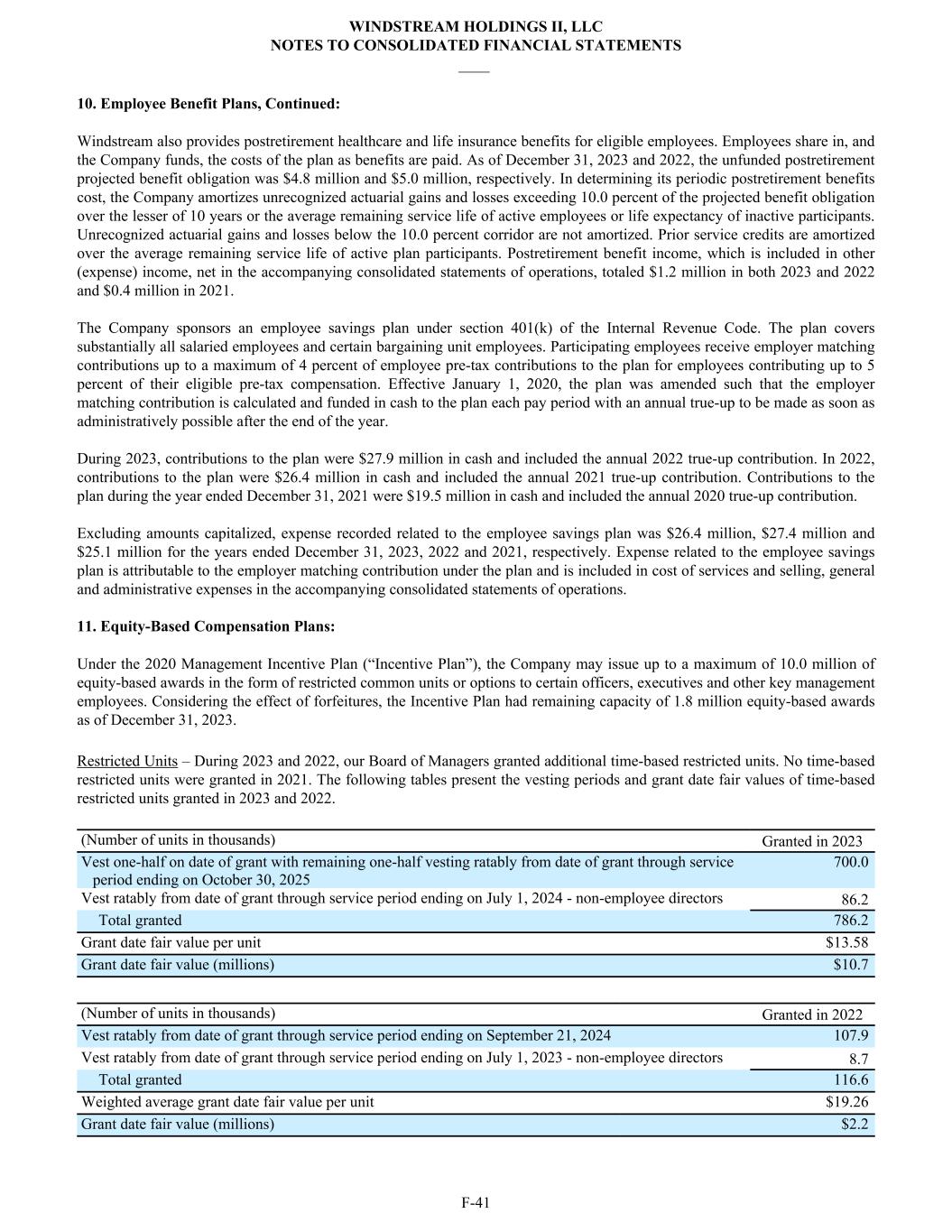10. Employee Benefit Plans, Continued: Windstream also provides postretirement healthcare and life insurance benefits for eligible employees. Employees share in, and the Company funds, the costs of the plan as benefits are paid. As of December 31, 2023 and 2022, the unfunded postretirement projected benefit obligation was $4.8 million and $5.0 million, respectively. In determining its periodic postretirement benefits cost, the Company amortizes unrecognized actuarial gains and losses exceeding 10.0 percent of the projected benefit obligation over the lesser of 10 years or the average remaining service life of active employees or life expectancy of inactive participants. Unrecognized actuarial gains and losses below the 10.0 percent corridor are not amortized. Prior service credits are amortized over the average remaining service life of active plan participants. Postretirement benefit income, which is included in other (expense) income, net in the accompanying consolidated statements of operations, totaled $1.2 million in both 2023 and 2022 and $0.4 million in 2021. The Company sponsors an employee savings plan under section 401(k) of the Internal Revenue Code. The plan covers substantially all salaried employees and certain bargaining unit employees. Participating employees receive employer matching contributions up to a maximum of 4 percent of employee pre-tax contributions to the plan for employees contributing up to 5 percent of their eligible pre-tax compensation. Effective January 1, 2020, the plan was amended such that the employer matching contribution is calculated and funded in cash to the plan each pay period with an annual true-up to be made as soon as administratively possible after the end of the year. During 2023, contributions to the plan were $27.9 million in cash and included the annual 2022 true-up contribution. In 2022, contributions to the plan were $26.4 million in cash and included the annual 2021 true-up contribution. Contributions to the plan during the year ended December 31, 2021 were $19.5 million in cash and included the annual 2020 true-up contribution. Excluding amounts capitalized, expense recorded related to the employee savings plan was $26.4 million, $27.4 million and $25.1 million for the years ended December 31, 2023, 2022 and 2021, respectively. Expense related to the employee savings plan is attributable to the employer matching contribution under the plan and is included in cost of services and selling, general and administrative expenses in the accompanying consolidated statements of operations. 11. Equity-Based Compensation Plans: Under the 2020 Management Incentive Plan (“Incentive Plan”), the Company may issue up to a maximum of 10.0 million of equity-based awards in the form of restricted common units or options to certain officers, executives and other key management employees. Considering the effect of forfeitures, the Incentive Plan had remaining capacity of 1.8 million equity-based awards as of December 31, 2023. Restricted Units – During 2023 and 2022, our Board of Managers granted additional time-based restricted units. No time-based restricted units were granted in 2021. The following tables present the vesting periods and grant date fair values of time-based restricted units granted in 2023 and 2022. (Number of units in thousands) Granted in 2023 Vest one-half on date of grant with remaining one-half vesting ratably from date of grant through service period ending on October 30, 2025 700.0 Vest ratably from date of grant through service period ending on July 1, 2024 - non-employee directors 86.2 Total granted 786.2 Grant date fair value per unit $13.58 Grant date fair value (millions) $10.7 (Number of units in thousands) Granted in 2022 Vest ratably from date of grant through service period ending on September 21, 2024 107.9 Vest ratably from date of grant through service period ending on July 1, 2023 - non-employee directors 8.7 Total granted 116.6 Weighted average grant date fair value per unit $19.26 Grant date fair value (millions) $2.2 WINDSTREAM HOLDINGS II, LLC NOTES TO CONSOLIDATED FINANCIAL STATEMENTS ____ F-41