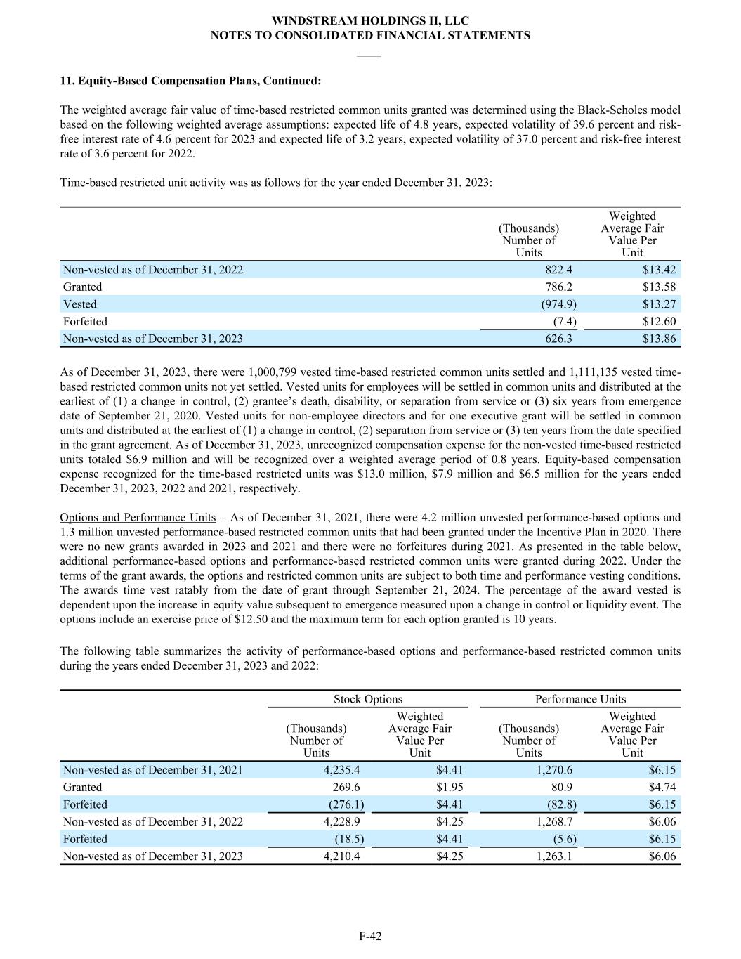 11. Equity-Based Compensation Plans, Continued: The weighted average fair value of time-based restricted common units granted was determined using the Black-Scholes model based on the following weighted average assumptions: expected life of 4.8 years, expected volatility of 39.6 percent and risk- free interest rate of 4.6 percent for 2023 and expected life of 3.2 years, expected volatility of 37.0 percent and risk-free interest rate of 3.6 percent for 2022. Time-based restricted unit activity was as follows for the year ended December 31, 2023: (Thousands) Number of Units Weighted Average Fair Value Per Unit Non-vested as of December 31, 2022 822.4 $13.42 Granted 786.2 $13.58 Vested (974.9) $13.27 Forfeited (7.4) $12.60 Non-vested as of December 31, 2023 626.3 $13.86 As of December 31, 2023, there were 1,000,799 vested time-based restricted common units settled and 1,111,135 vested time- based restricted common units not yet settled. Vested units for employees will be settled in common units and distributed at the earliest of (1) a change in control, (2) grantee’s death, disability, or separation from service or (3) six years from emergence date of September 21, 2020. Vested units for non-employee directors and for one executive grant will be settled in common units and distributed at the earliest of (1) a change in control, (2) separation from service or (3) ten years from the date specified in the grant agreement. As of December 31, 2023, unrecognized compensation expense for the non-vested time-based restricted units totaled $6.9 million and will be recognized over a weighted average period of 0.8 years. Equity-based compensation expense recognized for the time-based restricted units was $13.0 million, $7.9 million and $6.5 million for the years ended December 31, 2023, 2022 and 2021, respectively. Options and Performance Units – As of December 31, 2021, there were 4.2 million unvested performance-based options and 1.3 million unvested performance-based restricted common units that had been granted under the Incentive Plan in 2020. There were no new grants awarded in 2023 and 2021 and there were no forfeitures during 2021. As presented in the table below, additional performance-based options and performance-based restricted common units were granted during 2022. Under the terms of the grant awards, the options and restricted common units are subject to both time and performance vesting conditions. The awards time vest ratably from the date of grant through September 21, 2024. The percentage of the award vested is dependent upon the increase in equity value subsequent to emergence measured upon a change in control or liquidity event. The options include an exercise price of $12.50 and the maximum term for each option granted is 10 years. The following table summarizes the activity of performance-based options and performance-based restricted common units during the years ended December 31, 2023 and 2022: Stock Options Performance Units (Thousands) Number of Units Weighted Average Fair Value Per Unit (Thousands) Number of Units Weighted Average Fair Value Per Unit Non-vested as of December 31, 2021 4,235.4 $4.41 1,270.6 $6.15 Granted 269.6 $1.95 80.9 $4.74 Forfeited (276.1) $4.41 (82.8) $6.15 Non-vested as of December 31, 2022 4,228.9 $4.25 1,268.7 $6.06 Forfeited (18.5) $4.41 (5.6) $6.15 Non-vested as of December 31, 2023 4,210.4 $4.25 1,263.1 $6.06 WINDSTREAM HOLDINGS II, LLC NOTES TO CONSOLIDATED FINANCIAL STATEMENTS ____ F-42