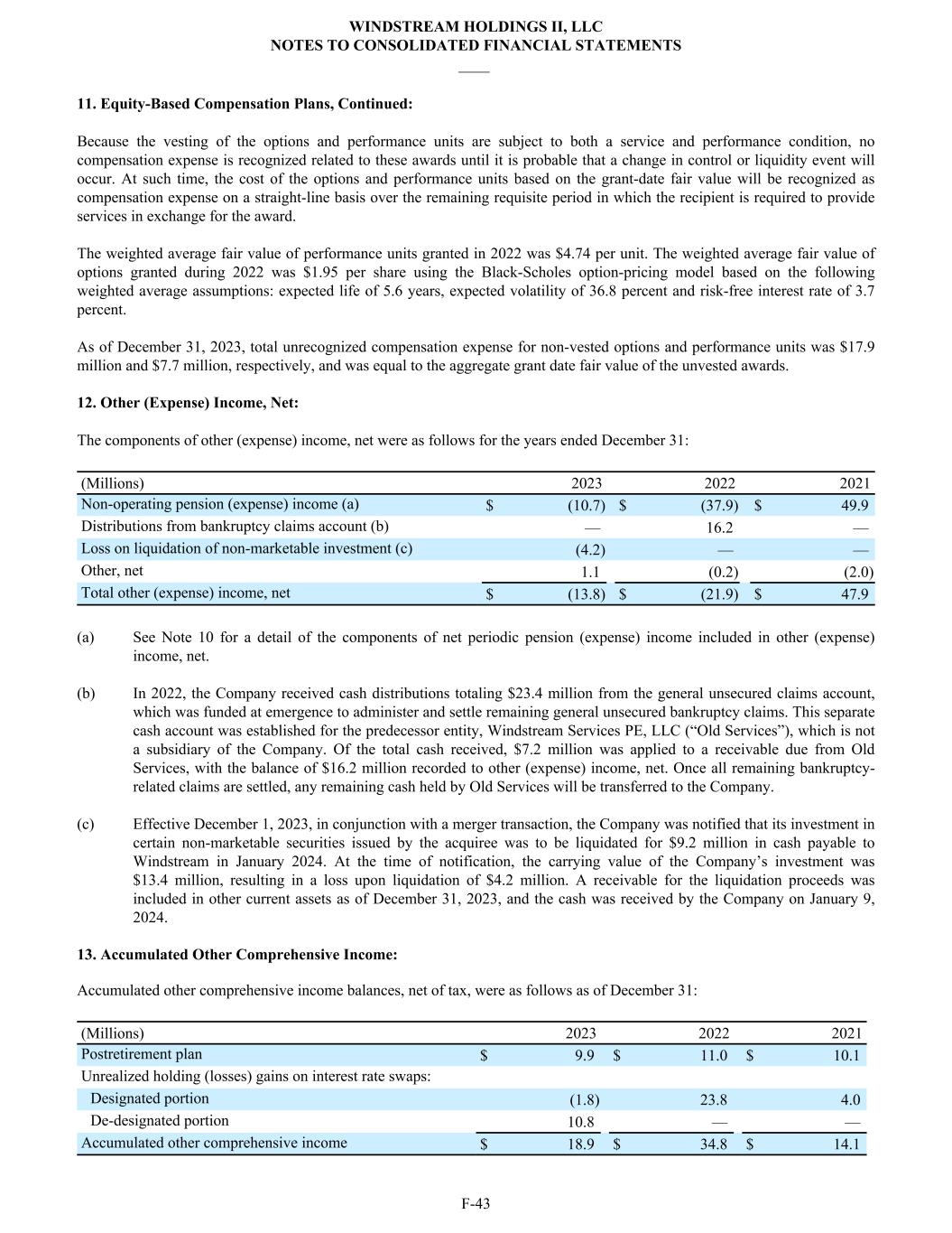 11. Equity-Based Compensation Plans, Continued: Because the vesting of the options and performance units are subject to both a service and performance condition, no compensation expense is recognized related to these awards until it is probable that a change in control or liquidity event will occur. At such time, the cost of the options and performance units based on the grant-date fair value will be recognized as compensation expense on a straight-line basis over the remaining requisite period in which the recipient is required to provide services in exchange for the award. The weighted average fair value of performance units granted in 2022 was $4.74 per unit. The weighted average fair value of options granted during 2022 was $1.95 per share using the Black-Scholes option-pricing model based on the following weighted average assumptions: expected life of 5.6 years, expected volatility of 36.8 percent and risk-free interest rate of 3.7 percent. As of December 31, 2023, total unrecognized compensation expense for non-vested options and performance units was $17.9 million and $7.7 million, respectively, and was equal to the aggregate grant date fair value of the unvested awards. 12. Other (Expense) Income, Net: The components of other (expense) income, net were as follows for the years ended December 31: (Millions) 2023 2022 2021 Non-operating pension (expense) income (a) $ (10.7) $ (37.9) $ 49.9 Distributions from bankruptcy claims account (b) — 16.2 — Loss on liquidation of non-marketable investment (c) (4.2) — — Other, net 1.1 (0.2) (2.0) Total other (expense) income, net $ (13.8) $ (21.9) $ 47.9 (a) See Note 10 for a detail of the components of net periodic pension (expense) income included in other (expense) income, net. (b) In 2022, the Company received cash distributions totaling $23.4 million from the general unsecured claims account, which was funded at emergence to administer and settle remaining general unsecured bankruptcy claims. This separate cash account was established for the predecessor entity, Windstream Services PE, LLC (“Old Services”), which is not a subsidiary of the Company. Of the total cash received, $7.2 million was applied to a receivable due from Old Services, with the balance of $16.2 million recorded to other (expense) income, net. Once all remaining bankruptcy- related claims are settled, any remaining cash held by Old Services will be transferred to the Company. (c) Effective December 1, 2023, in conjunction with a merger transaction, the Company was notified that its investment in certain non-marketable securities issued by the acquiree was to be liquidated for $9.2 million in cash payable to Windstream in January 2024. At the time of notification, the carrying value of the Company’s investment was $13.4 million, resulting in a loss upon liquidation of $4.2 million. A receivable for the liquidation proceeds was included in other current assets as of December 31, 2023, and the cash was received by the Company on January 9, 2024. 13. Accumulated Other Comprehensive Income: Accumulated other comprehensive income balances, net of tax, were as follows as of December 31: (Millions) 2023 2022 2021 Postretirement plan $ 9.9 $ 11.0 $ 10.1 Unrealized holding (losses) gains on interest rate swaps: Designated portion (1.8) 23.8 4.0 De-designated portion 10.8 — — Accumulated other comprehensive income $ 18.9 $ 34.8 $ 14.1 WINDSTREAM HOLDINGS II, LLC NOTES TO CONSOLIDATED FINANCIAL STATEMENTS ____ F-43