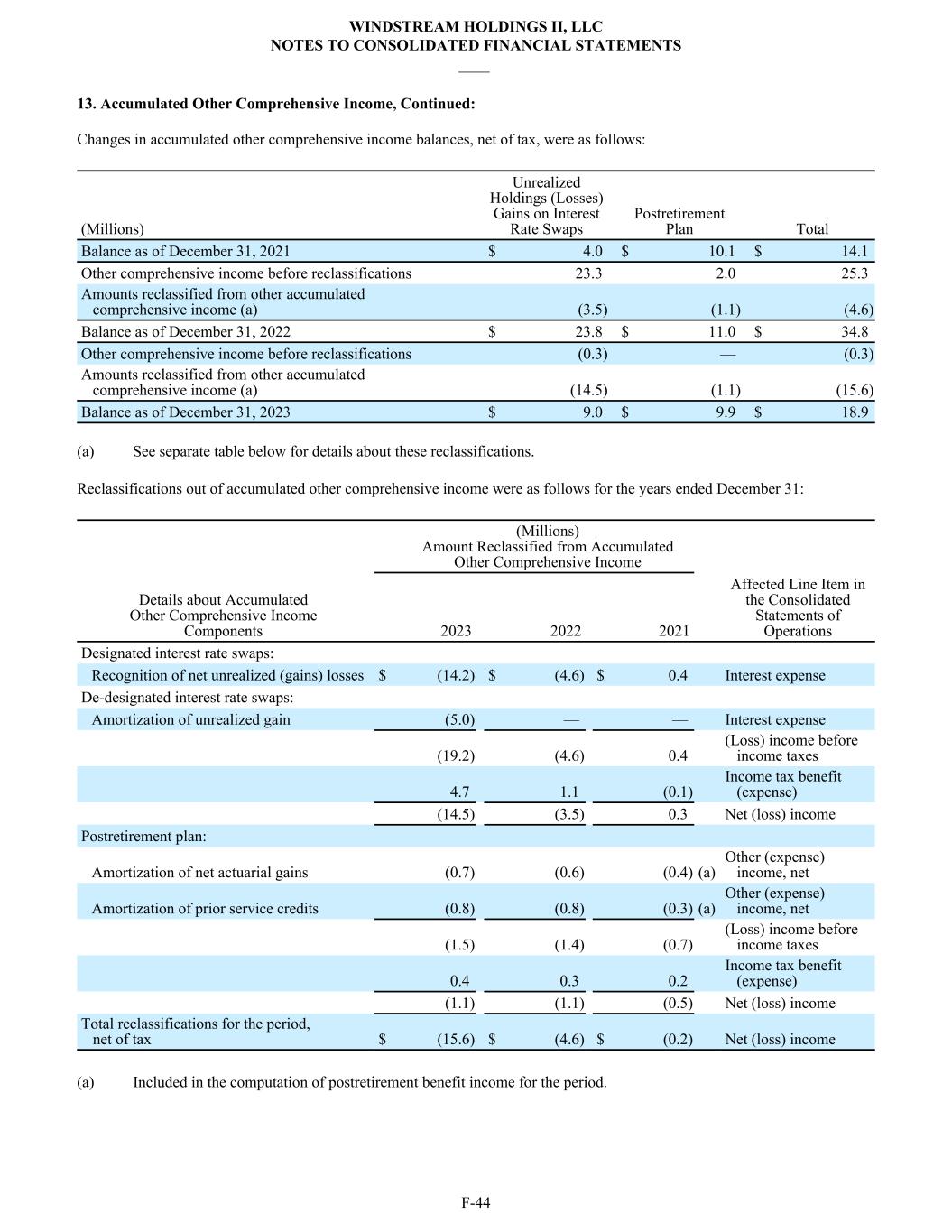 13. Accumulated Other Comprehensive Income, Continued: Changes in accumulated other comprehensive income balances, net of tax, were as follows: (Millions) Unrealized Holdings (Losses) Gains on Interest Rate Swaps Postretirement Plan Total Balance as of December 31, 2021 $ 4.0 $ 10.1 $ 14.1 Other comprehensive income before reclassifications 23.3 2.0 25.3 Amounts reclassified from other accumulated comprehensive income (a) (3.5) (1.1) (4.6) Balance as of December 31, 2022 $ 23.8 $ 11.0 $ 34.8 Other comprehensive income before reclassifications (0.3) — (0.3) Amounts reclassified from other accumulated comprehensive income (a) (14.5) (1.1) (15.6) Balance as of December 31, 2023 $ 9.0 $ 9.9 $ 18.9 (a) See separate table below for details about these reclassifications. Reclassifications out of accumulated other comprehensive income were as follows for the years ended December 31: (Millions) Amount Reclassified from Accumulated Other Comprehensive Income Details about Accumulated Other Comprehensive Income Components 2023 2022 2021 Affected Line Item in the Consolidated Statements of Operations Designated interest rate swaps: Recognition of net unrealized (gains) losses $ (14.2) $ (4.6) $ 0.4 Interest expense De-designated interest rate swaps: Amortization of unrealized gain (5.0) — — Interest expense (19.2) (4.6) 0.4 (Loss) income before income taxes 4.7 1.1 (0.1) Income tax benefit (expense) (14.5) (3.5) 0.3 Net (loss) income Postretirement plan: Amortization of net actuarial gains (0.7) (0.6) (0.4) (a) Other (expense) income, net Amortization of prior service credits (0.8) (0.8) (0.3) (a) Other (expense) income, net (1.5) (1.4) (0.7) (Loss) income before income taxes 0.4 0.3 0.2 Income tax benefit (expense) (1.1) (1.1) (0.5) Net (loss) income Total reclassifications for the period, net of tax $ (15.6) $ (4.6) $ (0.2) Net (loss) income (a) Included in the computation of postretirement benefit income for the period. WINDSTREAM HOLDINGS II, LLC NOTES TO CONSOLIDATED FINANCIAL STATEMENTS ____ F-44