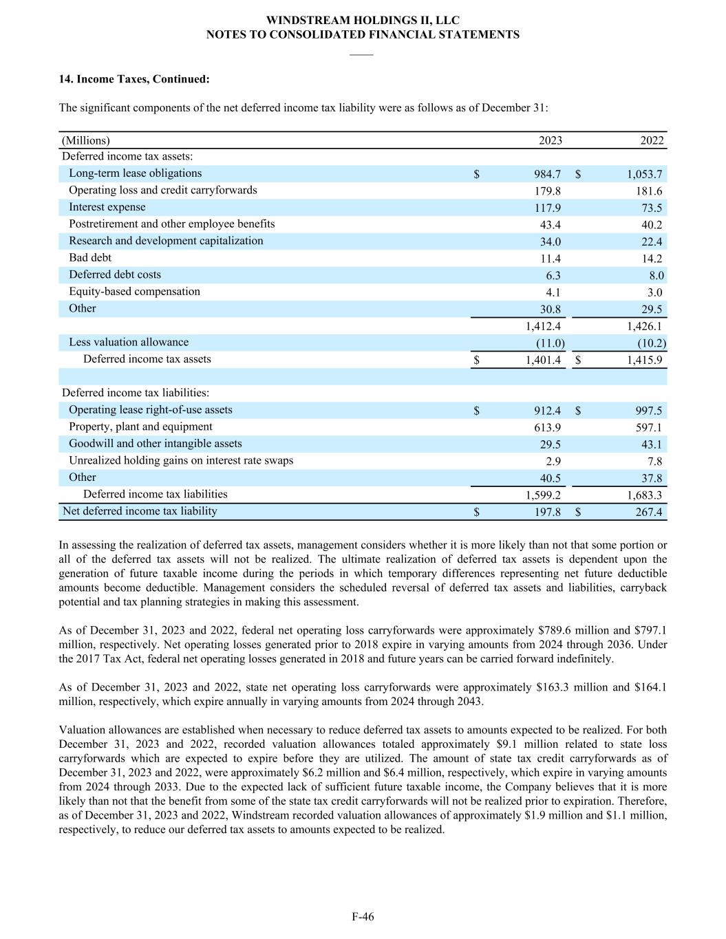 14. Income Taxes, Continued: The significant components of the net deferred income tax liability were as follows as of December 31: (Millions) 2023 2022 Deferred income tax assets: Long-term lease obligations $ 984.7 $ 1,053.7 Operating loss and credit carryforwards 179.8 181.6 Interest expense 117.9 73.5 Postretirement and other employee benefits 43.4 40.2 Research and development capitalization 34.0 22.4 Bad debt 11.4 14.2 Deferred debt costs 6.3 8.0 Equity-based compensation 4.1 3.0 Other 30.8 29.5 1,412.4 1,426.1 Less valuation allowance (11.0) (10.2) Deferred income tax assets $ 1,401.4 $ 1,415.9 Deferred income tax liabilities: Operating lease right-of-use assets $ 912.4 $ 997.5 Property, plant and equipment 613.9 597.1 Goodwill and other intangible assets 29.5 43.1 Unrealized holding gains on interest rate swaps 2.9 7.8 Other 40.5 37.8 Deferred income tax liabilities 1,599.2 1,683.3 Net deferred income tax liability $ 197.8 $ 267.4 In assessing the realization of deferred tax assets, management considers whether it is more likely than not that some portion or all of the deferred tax assets will not be realized. The ultimate realization of deferred tax assets is dependent upon the generation of future taxable income during the periods in which temporary differences representing net future deductible amounts become deductible. Management considers the scheduled reversal of deferred tax assets and liabilities, carryback potential and tax planning strategies in making this assessment. As of December 31, 2023 and 2022, federal net operating loss carryforwards were approximately $789.6 million and $797.1 million, respectively. Net operating losses generated prior to 2018 expire in varying amounts from 2024 through 2036. Under the 2017 Tax Act, federal net operating losses generated in 2018 and future years can be carried forward indefinitely. As of December 31, 2023 and 2022, state net operating loss carryforwards were approximately $163.3 million and $164.1 million, respectively, which expire annually in varying amounts from 2024 through 2043. Valuation allowances are established when necessary to reduce deferred tax assets to amounts expected to be realized. For both December 31, 2023 and 2022, recorded valuation allowances totaled approximately $9.1 million related to state loss carryforwards which are expected to expire before they are utilized. The amount of state tax credit carryforwards as of December 31, 2023 and 2022, were approximately $6.2 million and $6.4 million, respectively, which expire in varying amounts from 2024 through 2033. Due to the expected lack of sufficient future taxable income, the Company believes that it is more likely than not that the benefit from some of the state tax credit carryforwards will not be realized prior to expiration. Therefore, as of December 31, 2023 and 2022, Windstream recorded valuation allowances of approximately $1.9 million and $1.1 million, respectively, to reduce our deferred tax assets to amounts expected to be realized. WINDSTREAM HOLDINGS II, LLC NOTES TO CONSOLIDATED FINANCIAL STATEMENTS ____ F-46