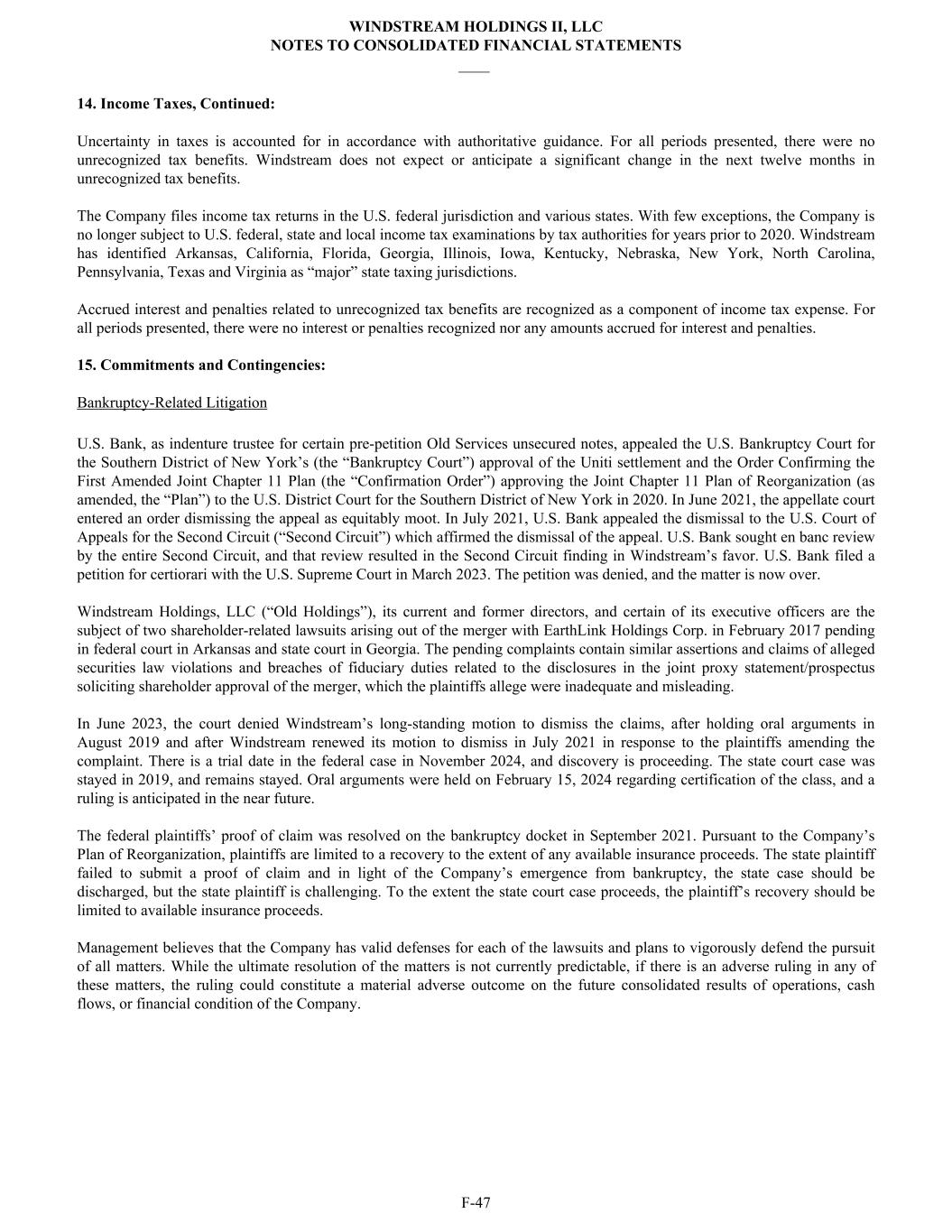 14. Income Taxes, Continued: Uncertainty in taxes is accounted for in accordance with authoritative guidance. For all periods presented, there were no unrecognized tax benefits. Windstream does not expect or anticipate a significant change in the next twelve months in unrecognized tax benefits. The Company files income tax returns in the U.S. federal jurisdiction and various states. With few exceptions, the Company is no longer subject to U.S. federal, state and local income tax examinations by tax authorities for years prior to 2020. Windstream has identified Arkansas, California, Florida, Georgia, Illinois, Iowa, Kentucky, Nebraska, New York, North Carolina, Pennsylvania, Texas and Virginia as “major” state taxing jurisdictions. Accrued interest and penalties related to unrecognized tax benefits are recognized as a component of income tax expense. For all periods presented, there were no interest or penalties recognized nor any amounts accrued for interest and penalties. 15. Commitments and Contingencies: Bankruptcy-Related Litigation U.S. Bank, as indenture trustee for certain pre-petition Old Services unsecured notes, appealed the U.S. Bankruptcy Court for the Southern District of New York’s (the “Bankruptcy Court”) approval of the Uniti settlement and the Order Confirming the First Amended Joint Chapter 11 Plan (the “Confirmation Order”) approving the Joint Chapter 11 Plan of Reorganization (as amended, the “Plan”) to the U.S. District Court for the Southern District of New York in 2020. In June 2021, the appellate court entered an order dismissing the appeal as equitably moot. In July 2021, U.S. Bank appealed the dismissal to the U.S. Court of Appeals for the Second Circuit (“Second Circuit”) which affirmed the dismissal of the appeal. U.S. Bank sought en banc review by the entire Second Circuit, and that review resulted in the Second Circuit finding in Windstream’s favor. U.S. Bank filed a petition for certiorari with the U.S. Supreme Court in March 2023. The petition was denied, and the matter is now over. Windstream Holdings, LLC (“Old Holdings”), its current and former directors, and certain of its executive officers are the subject of two shareholder-related lawsuits arising out of the merger with EarthLink Holdings Corp. in February 2017 pending in federal court in Arkansas and state court in Georgia. The pending complaints contain similar assertions and claims of alleged securities law violations and breaches of fiduciary duties related to the disclosures in the joint proxy statement/prospectus soliciting shareholder approval of the merger, which the plaintiffs allege were inadequate and misleading. In June 2023, the court denied Windstream’s long-standing motion to dismiss the claims, after holding oral arguments in August 2019 and after Windstream renewed its motion to dismiss in July 2021 in response to the plaintiffs amending the complaint. There is a trial date in the federal case in November 2024, and discovery is proceeding. The state court case was stayed in 2019, and remains stayed. Oral arguments were held on February 15, 2024 regarding certification of the class, and a ruling is anticipated in the near future. The federal plaintiffs’ proof of claim was resolved on the bankruptcy docket in September 2021. Pursuant to the Company’s Plan of Reorganization, plaintiffs are limited to a recovery to the extent of any available insurance proceeds. The state plaintiff failed to submit a proof of claim and in light of the Company’s emergence from bankruptcy, the state case should be discharged, but the state plaintiff is challenging. To the extent the state court case proceeds, the plaintiff’s recovery should be limited to available insurance proceeds. Management believes that the Company has valid defenses for each of the lawsuits and plans to vigorously defend the pursuit of all matters. While the ultimate resolution of the matters is not currently predictable, if there is an adverse ruling in any of these matters, the ruling could constitute a material adverse outcome on the future consolidated results of operations, cash flows, or financial condition of the Company. WINDSTREAM HOLDINGS II, LLC NOTES TO CONSOLIDATED FINANCIAL STATEMENTS ____ F-47