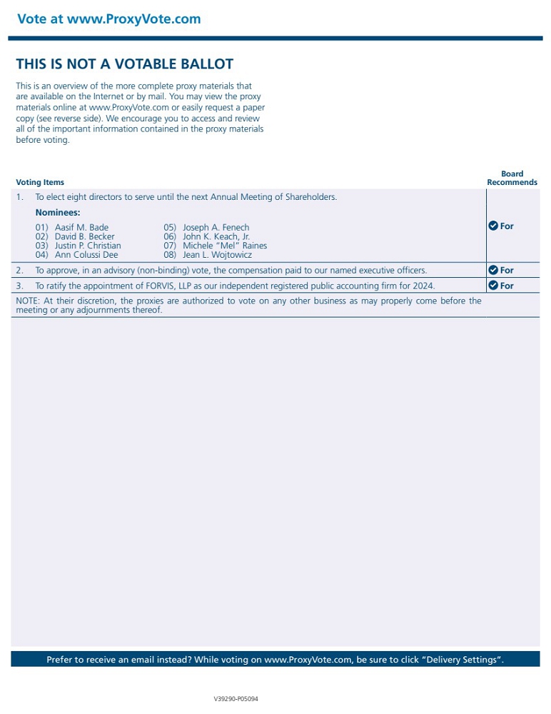 | Vote at www.ProxyVote.com Prefer to receive an email instead? While voting on www.ProxyVote.com, be sure to click “Delivery Settings”. Voting Items Board Recommends V39290-P05094 THIS IS NOT A VOTABLE BALLOT This is an overview of the more complete proxy materials that are available on the Internet or by mail. You may view the proxy materials online at www.ProxyVote.com or easily request a paper copy (see reverse side). We encourage you to access and review all of the important information contained in the proxy materials before voting. 1. To elect eight directors to serve until the next Annual Meeting of Shareholders. For Nominees: 01) Aasif M. Bade 02) David B. Becker 03) Justin P. Christian 04) Ann Colussi Dee 05) Joseph A. Fenech 06) John K. Keach, Jr. 07) Michele “Mel” Raines 08) Jean L. Wojtowicz 2. To approve, in an advisory (non-binding) vote, the compensation paid to our named executive officers. For 3. To ratify the appointment of FORVIS, LLP as our independent registered public accounting firm for 2024. For NOTE: At their discretion, the proxies are authorized to vote on any other business as may properly come before the meeting or any adjournments thereof. |