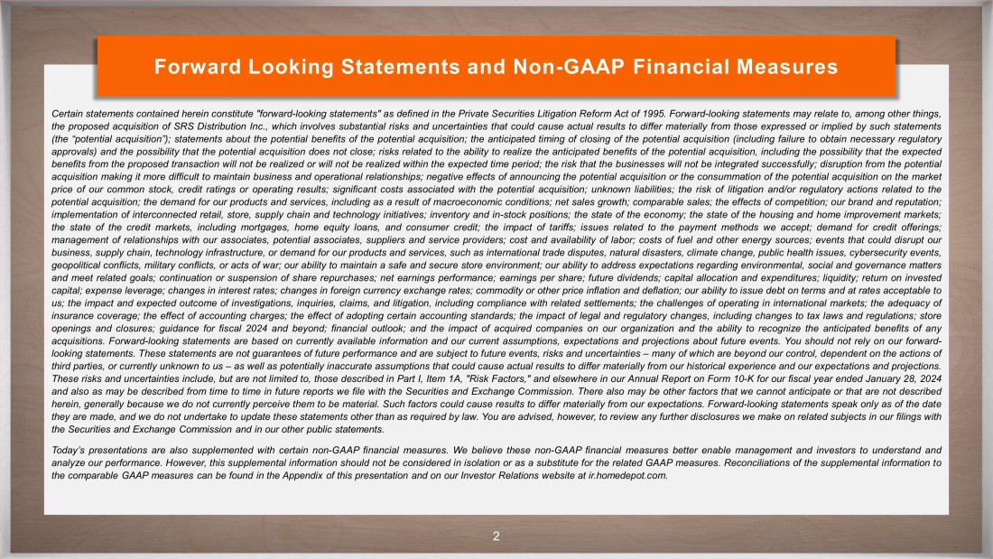 CONFIDENTIAL Forward Looking Statements and Non - GAAP Financial Measures Certain statements contained herein constitute "forward - looking statements" as defined in the Private Securities Litigation Reform Act of 1995 . Forward - looking statements may relate to, among other things, the proposed acquisition of SRS Distribution Inc . , which involves substantial risks and uncertainties that could cause actual results to differ materially from those expressed or implied by such statements (the “potential acquisition”) ; statements about the potential benefits of the potential acquisition ; the anticipated timing of closing of the potential acquisition (including failure to obtain necessary regulatory approvals) and the possibility that the potential acquisition does not close ; risks related to the ability to realize the anticipated benefits of the potential acquisition, including the possibility that the expected benefits from the proposed transaction will not be realized or will not be realized within the expected time period ; the risk that the businesses will not be integrated successfully ; disruption from the potential acquisition making it more difficult to maintain business and operational relationships ; negative effects of announcing the potential acquisition or the consummation of the potential acquisition on the market price of our common stock, credit ratings or operating results ; significant costs associated with the potential acquisition ; unknown liabilities ; the risk of litigation and/or regulatory actions related to the potential acquisition ; the demand for our products and services, including as a result of macroeconomic conditions ; net sales growth ; comparable sales ; the effects of competition ; our brand and reputation ; implementation of interconnected retail, store, supply chain and technology initiatives ; inventory and in - stock positions ; the state of the economy ; the state of the housing and home improvement markets ; the state of the credit markets, including mortgages, home equity loans, and consumer credit ; the impact of tariffs ; issues related to the payment methods we accept ; demand for credit offerings ; management of relationships with our associates, potential associates, suppliers and service providers ; cost and availability of labor ; costs of fuel and other energy sources ; events that could disrupt our business, supply chain, technology infrastructure, or demand for our products and services, such as international trade disputes, natural disasters, climate change, public health issues, cybersecurity events, geopolitical conflicts, military conflicts, or acts of war ; our ability to maintain a safe and secure store environment ; our ability to address expectations regarding environmental, social and governance matters and meet related goals ; continuation or suspension of share repurchases ; net earnings performance ; earnings per share ; future dividends ; capital allocation and expenditures ; liquidity ; return on invested capital ; expense leverage ; changes in interest rates ; changes in foreign currency exchange rates ; commodity or other price inflation and deflation ; our ability to issue debt on terms and at rates acceptable to us ; the impact and expected outcome of investigations, inquiries, claims, and litigation, including compliance with related settlements ; the challenges of operating in international markets ; the adequacy of insurance coverage ; the effect of accounting charges ; the effect of adopting certain accounting standards ; the impact of legal and regulatory changes, including changes to tax laws and regulations ; store openings and closures ; guidance for fiscal 2024 and beyond ; financial outlook ; and the impact of acquired companies on our organization and the ability to recognize the anticipated benefits of any acquisitions . Forward - looking statements are based on currently available information and our current assumptions, expectations and projections about future events . You should not rely on our forward - looking statements . These statements are not guarantees of future performance and are subject to future events, risks and uncertainties – many of which are beyond our control, dependent on the actions of third parties, or currently unknown to us – as well as potentially inaccurate assumptions that could cause actual results to differ materially from our historical experience and our expectations and projections . These risks and uncertainties include, but are not limited to, those described in Part I, Item 1 A, "Risk Factors," and elsewhere in our Annual Report on Form 10 - K for our fiscal year ended January 28 , 2024 and also as may be described from time to time in future reports we file with the Securities and Exchange Commission . There also may be other factors that we cannot anticipate or that are not described herein, generally because we do not currently perceive them to be material . Such factors could cause results to differ materially from our expectations . Forward - looking statements speak only as of the date they are made, and we do not undertake to update these statements other than as required by law . You are advised, however, to review any further disclosures we make on related subjects in our filings with the Securities and Exchange Commission and in our other public statements . Today’s presentations are also supplemented with certain non - GAAP financial measures . We believe these non - GAAP financial measures better enable management and investors to understand and analyze our performance . However, this supplemental information should not be considered in isolation or as a substitute for the related GAAP measures . Reconciliations of the supplemental information to the comparable GAAP measures can be found in the Appendix of this presentation and on our Investor Relations website at ir . homedepot . com . 2