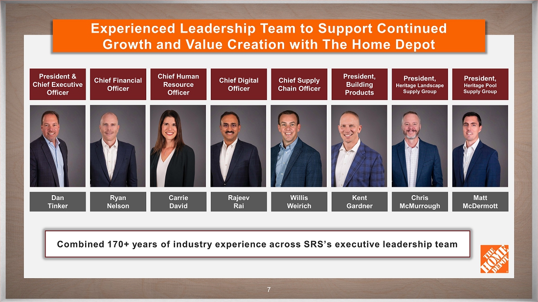CONFIDENTIAL 6 SRS has a Robust Set of Capabilities for the Pro Salesforce Strategic Locations Order and Account Management Systems Delivery Fleet Trade Credit Brands & Assortment eCommerce / Digital Tools 760+ branches and warehouses across 47 states 2,500+ inside and outside professional sales representatives 4,000+ flatbed, box, and boom delivery assets Trusted brands with breadth and depth One single, modern ERP system with mature integration playbook Sophisticated trade credit program and systems Digital ecosystem tailored to each segment (Roof Hub, Heritage+ Landscape, Heritage+ Pool) SRS ASSETS & CAPABILITIES