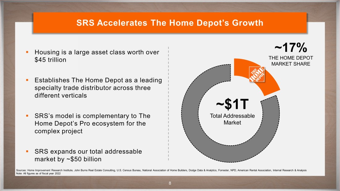 SRS will accelerate The Home Depot’s growth with the residential professional customer. SRS complements The Home Depot’s capabilities and will enable the company to better serve complex project purchase occasions with the renovator/remodeler, while also establishing The Home Depot as a leading specialty trade distributor across multiple verticals.