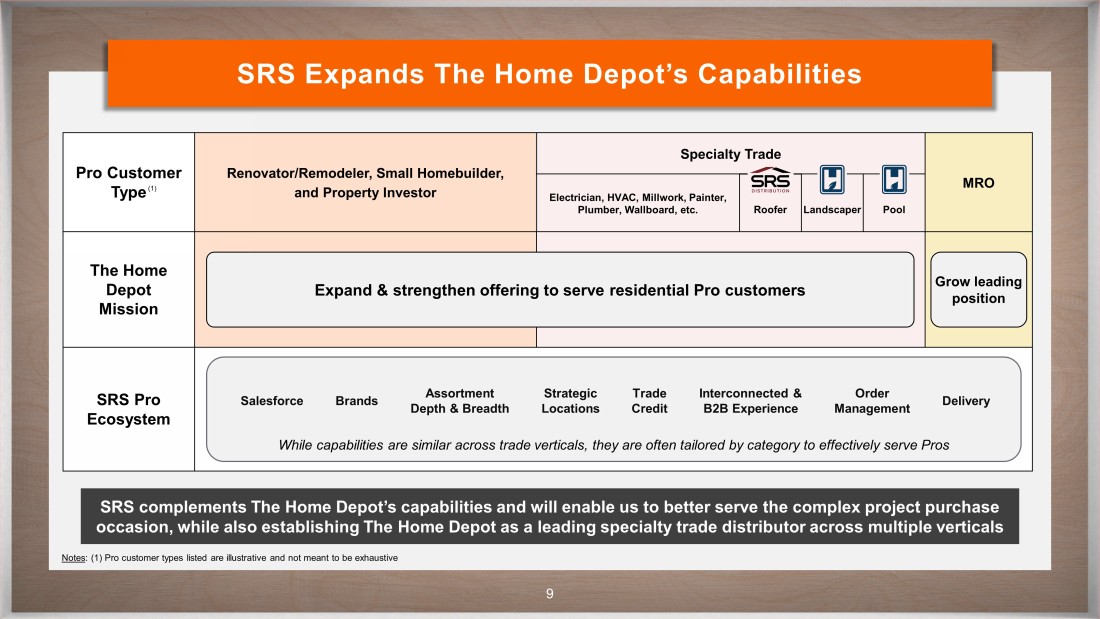CONFIDENTIAL 8 SRS Accelerates The Home Depot’s Growth ~$1T Total Addressable Market ~17% THE HOME DEPOT MARKET SHARE Sources: Home Improvement Research Institute, John Burns Real Estate Consulting, U.S. Census Bureau, National Association of Home Buil der s, Dodge Data & Analytics, Forrester, NPD, American Rental Association, Internal Research & Analysis Note: All figures as of fiscal year 2022 ▪ Housing is a l arge asset class worth over $45 trillion ▪ Establishes The Home Depot as a leading specialty trade distributor across three different verticals ▪ SRS’s model is complementary to The Home Depot’s Pro ecosystem for the complex project ▪ SRS expands our total addressable market by ~$50 billion