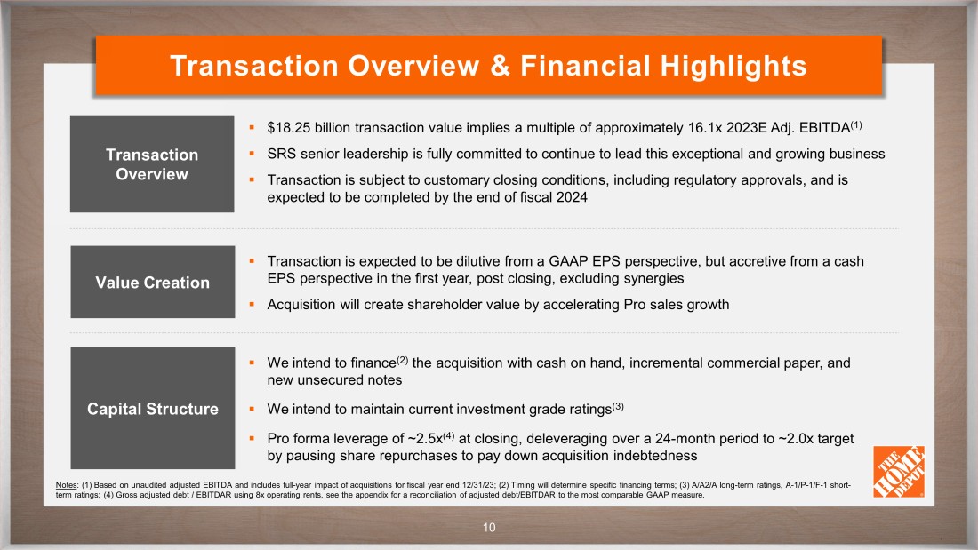 CONFIDENTIAL 9 SRS Expands The Home Depot’s Capabilities SRS complements The Home Depot’s capabilities and will enable us to better serve the complex project purchase occasion, while also establishing The Home Depot as a leading specialty trade distributor across multiple verticals Notes : (1) Pro customer types listed are illustrative and not meant to be exhaustive Pro Customer Type Renovator/Remodeler, Small Homebuilder, and Property Investor Specialty Trade MRO Electrician, HVAC, Millwork, Painter, Plumber, Wallboard, etc. Roofer Landscaper Pool The Home Depot Mission SRS Pro Ecosystem Expand & strengthen offering to serve residential Pro customers Grow leading position While capabilities are similar across trade verticals, they are often tailored by category to effectively serve Pros Salesforce Brands Assortment Depth & Breadth Strategic Locations Trade Credit Interconnected & B2B Experience Order Management Delivery (1)