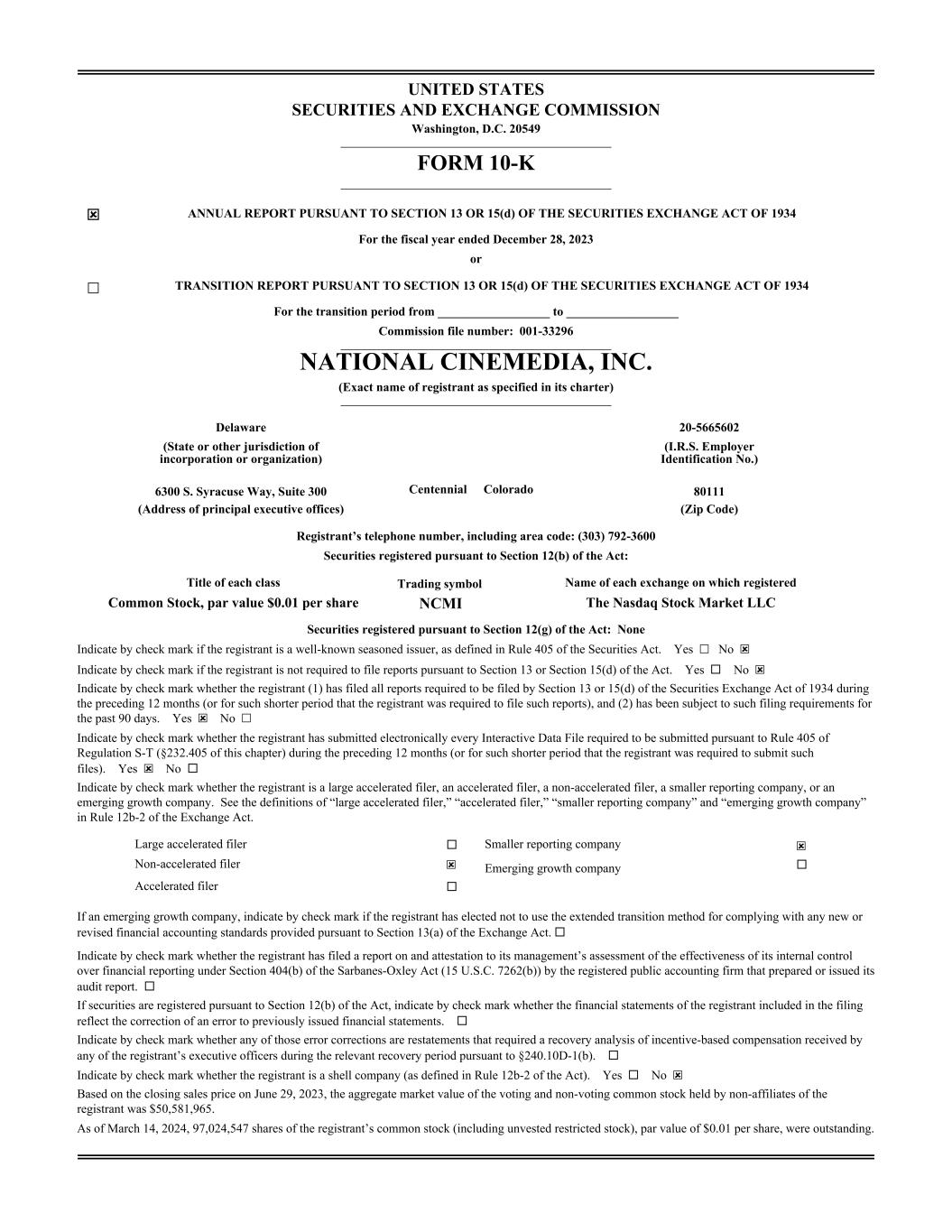 UNITED STATES SECURITIES AND EXCHANGE COMMISSION Washington, D.C. 20549 __________________________________________________________ FORM 10-K __________________________________________________________ ý ANNUAL REPORT PURSUANT TO SECTION 13 OR 15(d) OF THE SECURITIES EXCHANGE ACT OF 1934 For the fiscal year ended December 28, 2023 or ☐ TRANSITION REPORT PURSUANT TO SECTION 13 OR 15(d) OF THE SECURITIES EXCHANGE ACT OF 1934 For the transition period from __________________ to __________________ Commission file number: 001-33296 __________________________________________________________ NATIONAL CINEMEDIA, INC. (Exact name of registrant as specified in its charter) __________________________________________________________ Delaware 20-5665602 (State or other jurisdiction of incorporation or organization) (I.R.S. Employer Identification No.) 6300 S. Syracuse Way, Suite 300 Centennial Colorado 80111 (Address of principal executive offices) (Zip Code) Registrant’s telephone number, including area code: (303) 792-3600 Securities registered pursuant to Section 12(b) of the Act: Title of each class Trading symbol Name of each exchange on which registered Common Stock, par value $0.01 per share NCMI The Nasdaq Stock Market LLC Securities registered pursuant to Section 12(g) of the Act: None Indicate by check mark if the registrant is a well-known seasoned issuer, as defined in Rule 405 of the Securities Act. Yes ☐ No ☒ Indicate by check mark if the registrant is not required to file reports pursuant to Section 13 or Section 15(d) of the Act. Yes ¨ No ☒ Indicate by check mark whether the registrant (1) has filed all reports required to be filed by Section 13 or 15(d) of the Securities Exchange Act of 1934 during the preceding 12 months (or for such shorter period that the registrant was required to file such reports), and (2) has been subject to such filing requirements for the past 90 days. Yes ☒ No ☐ Indicate by check mark whether the registrant has submitted electronically every Interactive Data File required to be submitted pursuant to Rule 405 of Regulation S-T (§232.405 of this chapter) during the preceding 12 months (or for such shorter period that the registrant was required to submit such files). Yes ☒ No ¨ Indicate by check mark whether the registrant is a large accelerated filer, an accelerated filer, a non-accelerated filer, a smaller reporting company, or an emerging growth company. See the definitions of “large accelerated filer,” “accelerated filer,” “smaller reporting company” and “emerging growth company” in Rule 12b-2 of the Exchange Act. Large accelerated filer ¨ Smaller reporting company ☒ Non-accelerated filer ☒ Emerging growth company ¨ Accelerated filer ¨ If an emerging growth company, indicate by check mark if the registrant has elected not to use the extended transition method for complying with any new or revised financial accounting standards provided pursuant to Section 13(a) of the Exchange Act. ¨ Indicate by check mark whether the registrant has filed a report on and attestation to its management’s assessment of the effectiveness of its internal control over financial reporting under Section 404(b) of the Sarbanes-Oxley Act (15 U.S.C. 7262(b)) by the registered public accounting firm that prepared or issued its audit report. ¨ If securities are registered pursuant to Section 12(b) of the Act, indicate by check mark whether the financial statements of the registrant included in the filing reflect the correction of an error to previously issued financial statements. ¨ Indicate by check mark whether any of those error corrections are restatements that required a recovery analysis of incentive-based compensation received by any of the registrant’s executive officers during the relevant recovery period pursuant to §240.10D-1(b). ¨ Indicate by check mark whether the registrant is a shell company (as defined in Rule 12b-2 of the Act). Yes ¨ No ☒ Based on the closing sales price on June 29, 2023, the aggregate market value of the voting and non-voting common stock held by non-affiliates of the registrant was $50,581,965. As of March 14, 2024, 97,024,547 shares of the registrant’s common stock (including unvested restricted stock), par value of $0.01 per share, were outstanding.