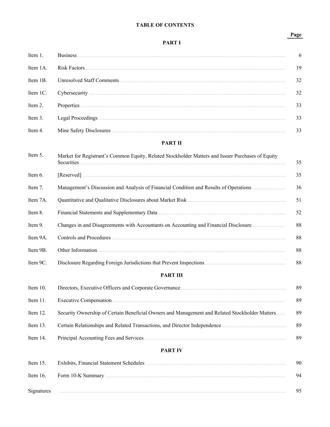 TABLE OF CONTENTS Page PART I Item 1. Business .......................................................................................................................................................... 6 Item 1A. Risk Factors ..................................................................................................................................................... 19 Item 1B. Unresolved Staff Comments ........................................................................................................................... 32 Item 1C. Cybersecurity .................................................................................................................................................. 32 Item 2. Properties ........................................................................................................................................................ 33 Item 3. Legal Proceedings ........................................................................................................................................... 33 Item 4. Mine Safety Disclosures ................................................................................................................................. 33 PART II Item 5. Market for Registrant’s Common Equity, Related Stockholder Matters and Issuer Purchases of Equity Securities ......................................................................................................................................................... 35 Item 6. [Reserved] ....................................................................................................................................................... 35 Item 7. Management’s Discussion and Analysis of Financial Condition and Results of Operations ......................... 36 Item 7A. Quantitative and Qualitative Disclosures about Market Risk ......................................................................... 51 Item 8. Financial Statements and Supplementary Data ............................................................................................... 52 Item 9. Changes in and Disagreements with Accountants on Accounting and Financial Disclosure ......................... 88 Item 9A. Controls and Procedures ................................................................................................................................. 88 Item 9B. Other Information ............................................................................................................................................ 88 Item 9C. Disclosure Regarding Foreign Jurisdictions that Prevent Inspections ............................................................ 88 PART III Item 10. Directors, Executive Officers and Corporate Governance .............................................................................. 89 Item 11. Executive Compensation ................................................................................................................................. 89 Item 12. Security Ownership of Certain Beneficial Owners and Management and Related Stockholder Matters ....... 89 Item 13. Certain Relationships and Related Transactions, and Director Independence ................................................ 89 Item 14. Principal Accounting Fees and Services ......................................................................................................... 89 PART IV Item 15. Exhibits, Financial Statement Schedules ........................................................................................................ 90 Item 16. Form 10-K Summary ...................................................................................................................................... 94 Signatures ........................................................................................................................................................................ 95