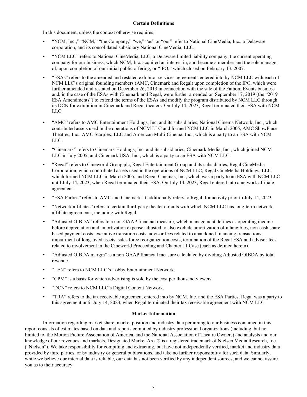 Certain Definitions In this document, unless the context otherwise requires: • “NCM, Inc.,” “NCM,” “the Company,” “we,” “us” or “our” refer to National CineMedia, Inc., a Delaware corporation, and its consolidated subsidiary National CineMedia, LLC. • “NCM LLC” refers to National CineMedia, LLC, a Delaware limited liability company, the current operating company for our business, which NCM, Inc. acquired an interest in, and became a member and the sole manager of, upon completion of our initial public offering, or “IPO,” which closed on February 13, 2007. • “ESAs” refers to the amended and restated exhibitor services agreements entered into by NCM LLC with each of NCM LLC’s original founding members (AMC, Cinemark and Regal) upon completion of the IPO, which were further amended and restated on December 26, 2013 in connection with the sale of the Fathom Events business and, in the case of the ESAs with Cinemark and Regal, were further amended on September 17, 2019 (the “2019 ESA Amendments”) to extend the terms of the ESAs and modify the program distributed by NCM LLC through its DCN for exhibition in Cinemark and Regal theaters. On July 14, 2023, Regal terminated their ESA with NCM LLC. • “AMC” refers to AMC Entertainment Holdings, Inc. and its subsidiaries, National Cinema Network, Inc., which contributed assets used in the operations of NCM LLC and formed NCM LLC in March 2005, AMC ShowPlace Theatres, Inc., AMC Starplex, LLC and American Multi-Cinema, Inc., which is a party to an ESA with NCM LLC. • “Cinemark” refers to Cinemark Holdings, Inc. and its subsidiaries, Cinemark Media, Inc., which joined NCM LLC in July 2005, and Cinemark USA, Inc., which is a party to an ESA with NCM LLC. • “Regal” refers to Cineworld Group plc, Regal Entertainment Group and its subsidiaries, Regal CineMedia Corporation, which contributed assets used in the operations of NCM LLC, Regal CineMedia Holdings, LLC, which formed NCM LLC in March 2005, and Regal Cinemas, Inc., which was a party to an ESA with NCM LLC until July 14, 2023, when Regal terminated their ESA. On July 14, 2023, Regal entered into a network affiliate agreement. • “ESA Parties” refers to AMC and Cinemark. It additionally refers to Regal, for activity prior to July 14, 2023. • “Network affiliates” refers to certain third-party theater circuits with which NCM LLC has long-term network affiliate agreements, including with Regal. • “Adjusted OIBDA” refers to a non-GAAP financial measure, which management defines as operating income before depreciation and amortization expense adjusted to also exclude amortization of intangibles, non-cash share- based payment costs, executive transition costs, advisor fees related to abandoned financing transactions, impairment of long-lived assets, sales force reorganization costs, termination of the Regal ESA and advisor fees related to involvement in the Cineworld Proceeding and Chapter 11 Case (each as defined herein). • “Adjusted OIBDA margin” is a non-GAAP financial measure calculated by dividing Adjusted OIBDA by total revenue. • “LEN” refers to NCM LLC’s Lobby Entertainment Network. • “CPM” is a basis for which advertising is sold by the cost per thousand viewers. • “DCN” refers to NCM LLC’s Digital Content Network. • “TRA” refers to the tax receivable agreement entered into by NCM, Inc. and the ESA Parties. Regal was a party to this agreement until July 14, 2023, when Regal terminated their tax receivable agreement with NCM LLC. Market Information Information regarding market share, market position and industry data pertaining to our business contained in this report consists of estimates based on data and reports compiled by industry professional organizations (including, but not limited to, the Motion Picture Association of America, and the National Association of Theatre Owners) and analysts and our knowledge of our revenues and markets. Designated Market Area® is a registered trademark of Nielsen Media Research, Inc. (“Nielsen”). We take responsibility for compiling and extracting, but have not independently verified, market and industry data provided by third parties, or by industry or general publications, and take no further responsibility for such data. Similarly, while we believe our internal data is reliable, our data has not been verified by any independent sources, and we cannot assure you as to their accuracy. 3