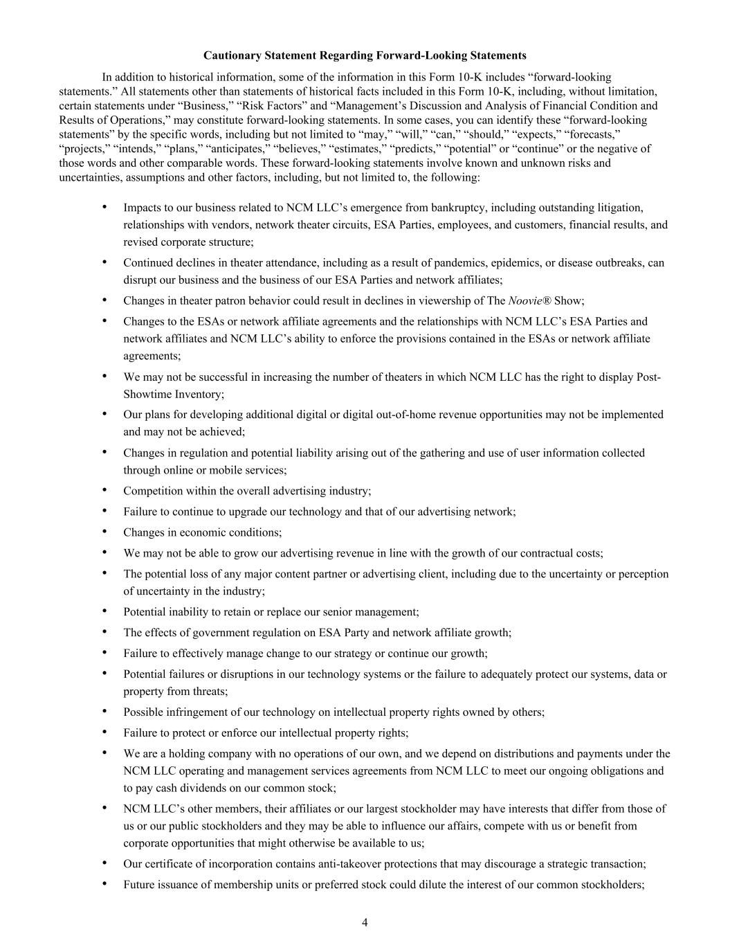 Cautionary Statement Regarding Forward-Looking Statements In addition to historical information, some of the information in this Form 10-K includes “forward-looking statements.” All statements other than statements of historical facts included in this Form 10-K, including, without limitation, certain statements under “Business,” “Risk Factors” and “Management’s Discussion and Analysis of Financial Condition and Results of Operations,” may constitute forward-looking statements. In some cases, you can identify these “forward-looking statements” by the specific words, including but not limited to “may,” “will,” “can,” “should,” “expects,” “forecasts,” “projects,” “intends,” “plans,” “anticipates,” “believes,” “estimates,” “predicts,” “potential” or “continue” or the negative of those words and other comparable words. These forward-looking statements involve known and unknown risks and uncertainties, assumptions and other factors, including, but not limited to, the following: • Impacts to our business related to NCM LLC’s emergence from bankruptcy, including outstanding litigation, relationships with vendors, network theater circuits, ESA Parties, employees, and customers, financial results, and revised corporate structure; • Continued declines in theater attendance, including as a result of pandemics, epidemics, or disease outbreaks, can disrupt our business and the business of our ESA Parties and network affiliates; • Changes in theater patron behavior could result in declines in viewership of The Noovie® Show; • Changes to the ESAs or network affiliate agreements and the relationships with NCM LLC’s ESA Parties and network affiliates and NCM LLC’s ability to enforce the provisions contained in the ESAs or network affiliate agreements; • We may not be successful in increasing the number of theaters in which NCM LLC has the right to display Post- Showtime Inventory; • Our plans for developing additional digital or digital out-of-home revenue opportunities may not be implemented and may not be achieved; • Changes in regulation and potential liability arising out of the gathering and use of user information collected through online or mobile services; • Competition within the overall advertising industry; • Failure to continue to upgrade our technology and that of our advertising network; • Changes in economic conditions; • We may not be able to grow our advertising revenue in line with the growth of our contractual costs; • The potential loss of any major content partner or advertising client, including due to the uncertainty or perception of uncertainty in the industry; • Potential inability to retain or replace our senior management; • The effects of government regulation on ESA Party and network affiliate growth; • Failure to effectively manage change to our strategy or continue our growth; • Potential failures or disruptions in our technology systems or the failure to adequately protect our systems, data or property from threats; • Possible infringement of our technology on intellectual property rights owned by others; • Failure to protect or enforce our intellectual property rights; • We are a holding company with no operations of our own, and we depend on distributions and payments under the NCM LLC operating and management services agreements from NCM LLC to meet our ongoing obligations and to pay cash dividends on our common stock; • NCM LLC’s other members, their affiliates or our largest stockholder may have interests that differ from those of us or our public stockholders and they may be able to influence our affairs, compete with us or benefit from corporate opportunities that might otherwise be available to us; • Our certificate of incorporation contains anti-takeover protections that may discourage a strategic transaction; • Future issuance of membership units or preferred stock could dilute the interest of our common stockholders; 4