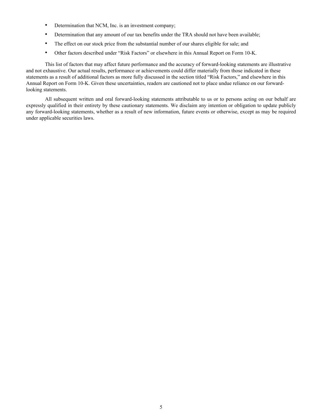 • Determination that NCM, Inc. is an investment company; • Determination that any amount of our tax benefits under the TRA should not have been available; • The effect on our stock price from the substantial number of our shares eligible for sale; and • Other factors described under “Risk Factors” or elsewhere in this Annual Report on Form 10-K. This list of factors that may affect future performance and the accuracy of forward-looking statements are illustrative and not exhaustive. Our actual results, performance or achievements could differ materially from those indicated in these statements as a result of additional factors as more fully discussed in the section titled “Risk Factors,” and elsewhere in this Annual Report on Form 10-K. Given these uncertainties, readers are cautioned not to place undue reliance on our forward- looking statements. All subsequent written and oral forward-looking statements attributable to us or to persons acting on our behalf are expressly qualified in their entirety by these cautionary statements. We disclaim any intention or obligation to update publicly any forward-looking statements, whether as a result of new information, future events or otherwise, except as may be required under applicable securities laws. 5