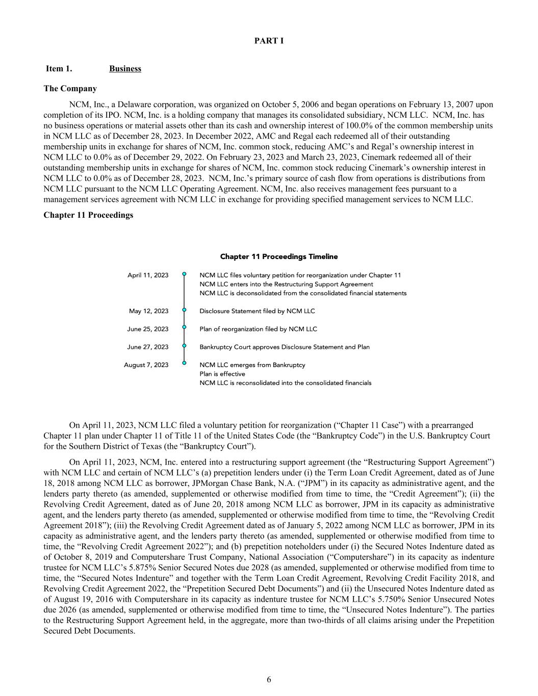 PART I Item 1. Business The Company NCM, Inc., a Delaware corporation, was organized on October 5, 2006 and began operations on February 13, 2007 upon completion of its IPO. NCM, Inc. is a holding company that manages its consolidated subsidiary, NCM LLC. NCM, Inc. has no business operations or material assets other than its cash and ownership interest of 100.0% of the common membership units in NCM LLC as of December 28, 2023. In December 2022, AMC and Regal each redeemed all of their outstanding membership units in exchange for shares of NCM, Inc. common stock, reducing AMC’s and Regal’s ownership interest in NCM LLC to 0.0% as of December 29, 2022. On February 23, 2023 and March 23, 2023, Cinemark redeemed all of their outstanding membership units in exchange for shares of NCM, Inc. common stock reducing Cinemark’s ownership interest in NCM LLC to 0.0% as of December 28, 2023. NCM, Inc.’s primary source of cash flow from operations is distributions from NCM LLC pursuant to the NCM LLC Operating Agreement. NCM, Inc. also receives management fees pursuant to a management services agreement with NCM LLC in exchange for providing specified management services to NCM LLC. Chapter 11 Proceedings On April 11, 2023, NCM LLC filed a voluntary petition for reorganization (“Chapter 11 Case”) with a prearranged Chapter 11 plan under Chapter 11 of Title 11 of the United States Code (the “Bankruptcy Code”) in the U.S. Bankruptcy Court for the Southern District of Texas (the “Bankruptcy Court”). On April 11, 2023, NCM, Inc. entered into a restructuring support agreement (the “Restructuring Support Agreement”) with NCM LLC and certain of NCM LLC’s (a) prepetition lenders under (i) the Term Loan Credit Agreement, dated as of June 18, 2018 among NCM LLC as borrower, JPMorgan Chase Bank, N.A. (“JPM”) in its capacity as administrative agent, and the lenders party thereto (as amended, supplemented or otherwise modified from time to time, the “Credit Agreement”); (ii) the Revolving Credit Agreement, dated as of June 20, 2018 among NCM LLC as borrower, JPM in its capacity as administrative agent, and the lenders party thereto (as amended, supplemented or otherwise modified from time to time, the “Revolving Credit Agreement 2018”); (iii) the Revolving Credit Agreement dated as of January 5, 2022 among NCM LLC as borrower, JPM in its capacity as administrative agent, and the lenders party thereto (as amended, supplemented or otherwise modified from time to time, the “Revolving Credit Agreement 2022”); and (b) prepetition noteholders under (i) the Secured Notes Indenture dated as of October 8, 2019 and Computershare Trust Company, National Association (“Computershare”) in its capacity as indenture trustee for NCM LLC’s 5.875% Senior Secured Notes due 2028 (as amended, supplemented or otherwise modified from time to time, the “Secured Notes Indenture” and together with the Term Loan Credit Agreement, Revolving Credit Facility 2018, and Revolving Credit Agreement 2022, the “Prepetition Secured Debt Documents”) and (ii) the Unsecured Notes Indenture dated as of August 19, 2016 with Computershare in its capacity as indenture trustee for NCM LLC’s 5.750% Senior Unsecured Notes due 2026 (as amended, supplemented or otherwise modified from time to time, the “Unsecured Notes Indenture”). The parties to the Restructuring Support Agreement held, in the aggregate, more than two-thirds of all claims arising under the Prepetition Secured Debt Documents. 6