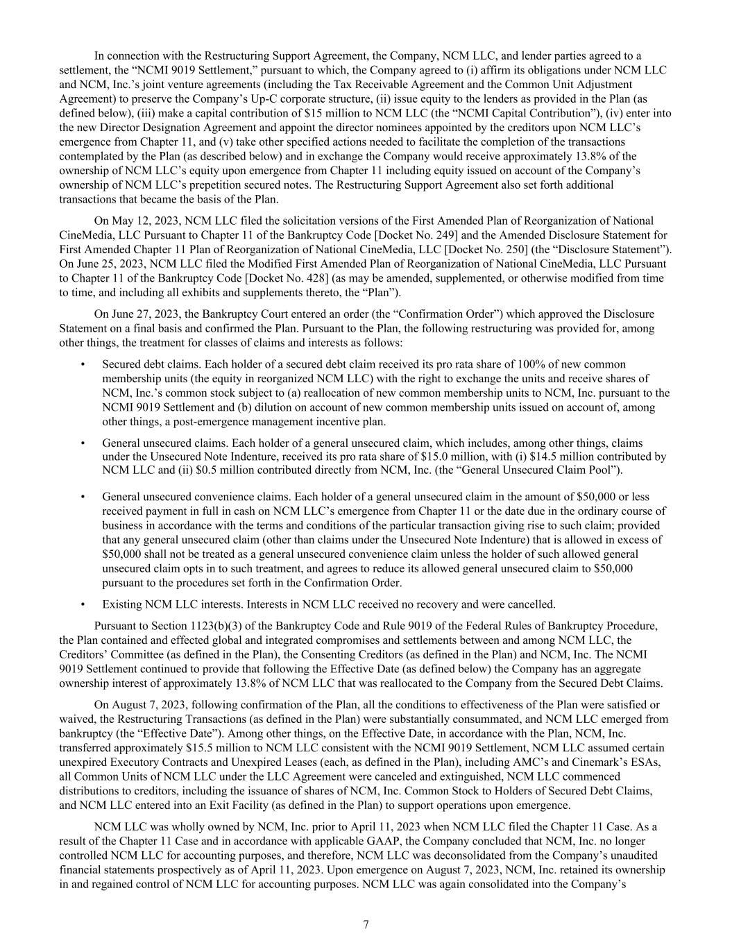 In connection with the Restructuring Support Agreement, the Company, NCM LLC, and lender parties agreed to a settlement, the “NCMI 9019 Settlement,” pursuant to which, the Company agreed to (i) affirm its obligations under NCM LLC and NCM, Inc.’s joint venture agreements (including the Tax Receivable Agreement and the Common Unit Adjustment Agreement) to preserve the Company’s Up-C corporate structure, (ii) issue equity to the lenders as provided in the Plan (as defined below), (iii) make a capital contribution of $15 million to NCM LLC (the “NCMI Capital Contribution”), (iv) enter into the new Director Designation Agreement and appoint the director nominees appointed by the creditors upon NCM LLC’s emergence from Chapter 11, and (v) take other specified actions needed to facilitate the completion of the transactions contemplated by the Plan (as described below) and in exchange the Company would receive approximately 13.8% of the ownership of NCM LLC’s equity upon emergence from Chapter 11 including equity issued on account of the Company’s ownership of NCM LLC’s prepetition secured notes. The Restructuring Support Agreement also set forth additional transactions that became the basis of the Plan. On May 12, 2023, NCM LLC filed the solicitation versions of the First Amended Plan of Reorganization of National CineMedia, LLC Pursuant to Chapter 11 of the Bankruptcy Code [Docket No. 249] and the Amended Disclosure Statement for First Amended Chapter 11 Plan of Reorganization of National CineMedia, LLC [Docket No. 250] (the “Disclosure Statement”). On June 25, 2023, NCM LLC filed the Modified First Amended Plan of Reorganization of National CineMedia, LLC Pursuant to Chapter 11 of the Bankruptcy Code [Docket No. 428] (as may be amended, supplemented, or otherwise modified from time to time, and including all exhibits and supplements thereto, the “Plan”). On June 27, 2023, the Bankruptcy Court entered an order (the “Confirmation Order”) which approved the Disclosure Statement on a final basis and confirmed the Plan. Pursuant to the Plan, the following restructuring was provided for, among other things, the treatment for classes of claims and interests as follows: • Secured debt claims. Each holder of a secured debt claim received its pro rata share of 100% of new common membership units (the equity in reorganized NCM LLC) with the right to exchange the units and receive shares of NCM, Inc.’s common stock subject to (a) reallocation of new common membership units to NCM, Inc. pursuant to the NCMI 9019 Settlement and (b) dilution on account of new common membership units issued on account of, among other things, a post-emergence management incentive plan. • General unsecured claims. Each holder of a general unsecured claim, which includes, among other things, claims under the Unsecured Note Indenture, received its pro rata share of $15.0 million, with (i) $14.5 million contributed by NCM LLC and (ii) $0.5 million contributed directly from NCM, Inc. (the “General Unsecured Claim Pool”). • General unsecured convenience claims. Each holder of a general unsecured claim in the amount of $50,000 or less received payment in full in cash on NCM LLC’s emergence from Chapter 11 or the date due in the ordinary course of business in accordance with the terms and conditions of the particular transaction giving rise to such claim; provided that any general unsecured claim (other than claims under the Unsecured Note Indenture) that is allowed in excess of $50,000 shall not be treated as a general unsecured convenience claim unless the holder of such allowed general unsecured claim opts in to such treatment, and agrees to reduce its allowed general unsecured claim to $50,000 pursuant to the procedures set forth in the Confirmation Order. • Existing NCM LLC interests. Interests in NCM LLC received no recovery and were cancelled. Pursuant to Section 1123(b)(3) of the Bankruptcy Code and Rule 9019 of the Federal Rules of Bankruptcy Procedure, the Plan contained and effected global and integrated compromises and settlements between and among NCM LLC, the Creditors’ Committee (as defined in the Plan), the Consenting Creditors (as defined in the Plan) and NCM, Inc. The NCMI 9019 Settlement continued to provide that following the Effective Date (as defined below) the Company has an aggregate ownership interest of approximately 13.8% of NCM LLC that was reallocated to the Company from the Secured Debt Claims. On August 7, 2023, following confirmation of the Plan, all the conditions to effectiveness of the Plan were satisfied or waived, the Restructuring Transactions (as defined in the Plan) were substantially consummated, and NCM LLC emerged from bankruptcy (the “Effective Date”). Among other things, on the Effective Date, in accordance with the Plan, NCM, Inc. transferred approximately $15.5 million to NCM LLC consistent with the NCMI 9019 Settlement, NCM LLC assumed certain unexpired Executory Contracts and Unexpired Leases (each, as defined in the Plan), including AMC’s and Cinemark’s ESAs, all Common Units of NCM LLC under the LLC Agreement were canceled and extinguished, NCM LLC commenced distributions to creditors, including the issuance of shares of NCM, Inc. Common Stock to Holders of Secured Debt Claims, and NCM LLC entered into an Exit Facility (as defined in the Plan) to support operations upon emergence. NCM LLC was wholly owned by NCM, Inc. prior to April 11, 2023 when NCM LLC filed the Chapter 11 Case. As a result of the Chapter 11 Case and in accordance with applicable GAAP, the Company concluded that NCM, Inc. no longer controlled NCM LLC for accounting purposes, and therefore, NCM LLC was deconsolidated from the Company’s unaudited financial statements prospectively as of April 11, 2023. Upon emergence on August 7, 2023, NCM, Inc. retained its ownership in and regained control of NCM LLC for accounting purposes. NCM LLC was again consolidated