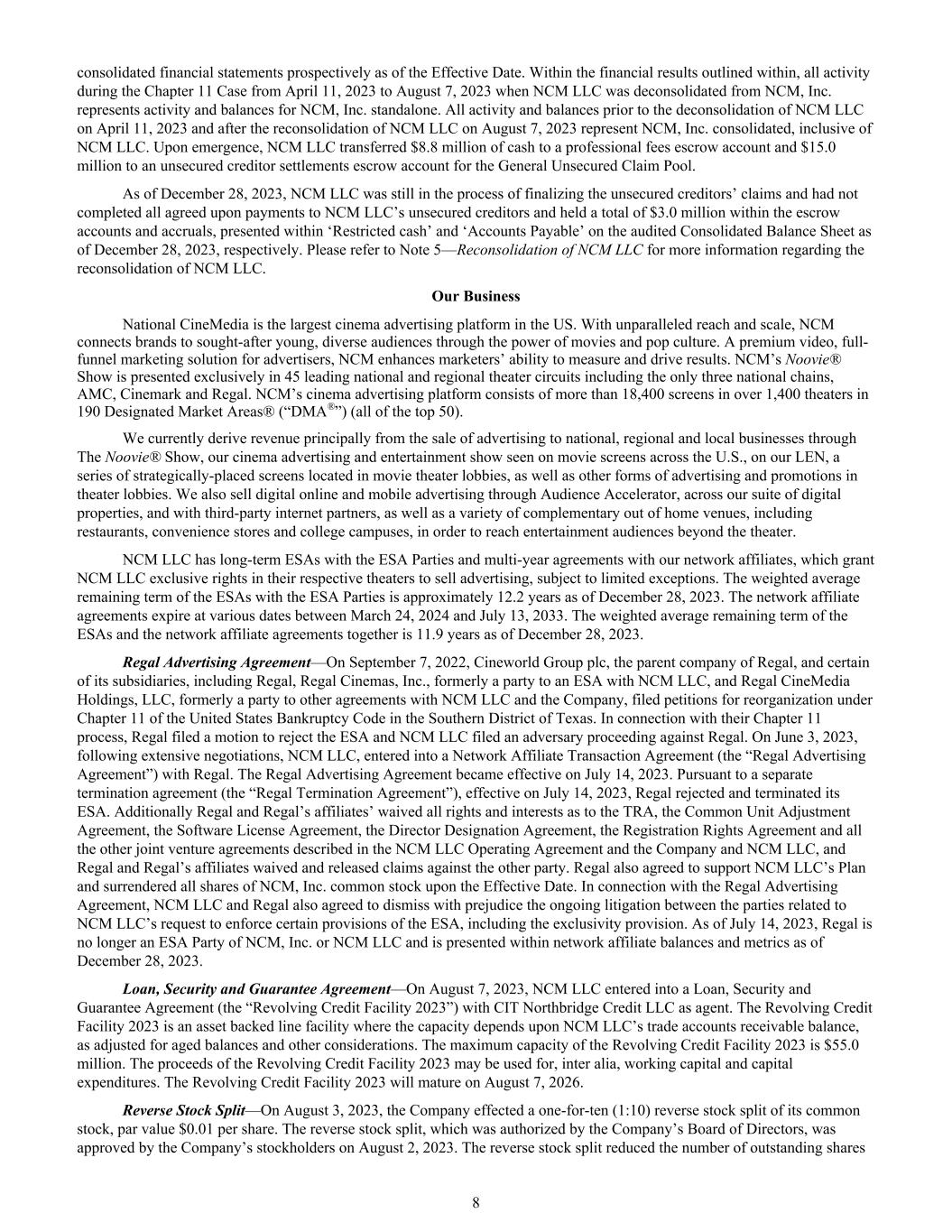 consolidated financial statements prospectively as of the Effective Date. Within the financial results outlined within, all activity during the Chapter 11 Case from April 11, 2023 to August 7, 2023 when NCM LLC was deconsolidated from NCM, Inc. represents activity and balances for NCM, Inc. standalone. All activity and balances prior to the deconsolidation of NCM LLC on April 11, 2023 and after the reconsolidation of NCM LLC on August 7, 2023 represent NCM, Inc. consolidated, inclusive of NCM LLC. Upon emergence, NCM LLC transferred $8.8 million of cash to a professional fees escrow account and $15.0 million to an unsecured creditor settlements escrow account for the General Unsecured Claim Pool. As of December 28, 2023, NCM LLC was still in the process of finalizing the unsecured creditors’ claims and had not completed all agreed upon payments to NCM LLC’s unsecured creditors and held a total of $3.0 million within the escrow accounts and accruals, presented within ‘Restricted cash’ and ‘Accounts Payable’ on the audited Consolidated Balance Sheet as of December 28, 2023, respectively. Please refer to Note 5—Reconsolidation of NCM LLC for more information regarding the reconsolidation of NCM LLC. Our Business National CineMedia is the largest cinema advertising platform in the US. With unparalleled reach and scale, NCM connects brands to sought-after young, diverse audiences through the power of movies and pop culture. A premium video, full- funnel marketing solution for advertisers, NCM enhances marketers’ ability to measure and drive results. NCM’s Noovie® Show is presented exclusively in 45 leading national and regional theater circuits including the only three national chains, AMC, Cinemark and Regal. NCM’s cinema advertising platform consists of more than 18,400 screens in over 1,400 theaters in 190 Designated Market Areas® (“DMA®”) (all of the top 50). We currently derive revenue principally from the sale of advertising to national, regional and local businesses through The Noovie® Show, our cinema advertising and entertainment show seen on movie screens across the U.S., on our LEN, a series of strategically-placed screens located in movie theater lobbies, as well as other forms of advertising and promotions in theater lobbies. We also sell digital online and mobile advertising through Audience Accelerator, across our suite of digital properties, and with third-party internet partners, as well as a variety of complementary out of home venues, including restaurants, convenience stores and college campuses, in order to reach entertainment audiences beyond the theater. NCM LLC has long-term ESAs with the ESA Parties and multi-year agreements with our network affiliates, which grant NCM LLC exclusive rights in their respective theaters to sell advertising, subject to limited exceptions. The weighted average remaining term of the ESAs with the ESA Parties is approximately 12.2 years as of December 28, 2023. The network affiliate agreements expire at various dates between March 24, 2024 and July 13, 2033. The weighted average remaining term of the ESAs and the network affiliate agreements together is 11.9 years as of December 28, 2023. Regal Advertising Agreement—On September 7, 2022, Cineworld Group plc, the parent company of Regal, and certain of its subsidiaries, including Regal, Regal Cinemas, Inc., formerly a party to an ESA with NCM LLC, and Regal CineMedia Holdings, LLC, formerly a party to other agreements with NCM LLC and the Company, filed petitions for reorganization under Chapter 11 of the United States Bankruptcy Code in the Southern District of Texas. In connection with their Chapter 11 process, Regal filed a motion to reject the ESA and NCM LLC filed an adversary proceeding against Regal. On June 3, 2023, following extensive negotiations, NCM LLC, entered into a Network Affiliate Transaction Agreement (the “Regal Advertising Agreement”) with Regal. The Regal Advertising Agreement became effective on July 14, 2023. Pursuant to a separate termination agreement (the “Regal Termination Agreement”), effective on July 14, 2023, Regal rejected and terminated its ESA. Additionally Regal and Regal’s affiliates’ waived all rights and interests as to the TRA, the Common Unit Adjustment Agreement, the Software License Agreement, the Director Designation Agreement, the Registration Rights Agreement and all the other joint venture agreements described in the NCM LLC Operating Agreement and the Company and NCM LLC, and Regal and Regal’s affiliates waived and released claims against the other party. Regal also agreed to support NCM LLC’s Plan and surrendered all shares of NCM, Inc. common stock upon the Effective Date. In connection with the Regal Advertising Agreement, NCM LLC and Regal also agreed to dismiss with prejudice the ongoing litigation between the parties related to NCM LLC’s request to enforce certain provisions of the ESA, including the exclusivity provision. As of July 14, 2023, Regal is no longer an ESA Party of NCM, Inc. or NCM LLC and is presented within network affiliate balances and metrics as of December 28, 2023. Loan, Security and Guarantee Agreement—On August 7, 2023, NCM LLC entered into a Loan, Security and Guarantee Agreement (the “Revolving Credit Facility 2023”) with CIT Northbridge Credit LLC as agent. The Revolving Credit Facility 2023 is an asset backed line facility where the capacity depends upon NCM LLC’s trade accounts receivable balance, as adjusted for aged balances and other considerations. The maximum capacity of the Revolving Credit Facility 2023 is $55.0 million. The proceeds of the Revolving Credit Facility 2023 may be used for, inter alia, working capital and capital expenditures. The Revolving Credit Facility 2023 will mature on August 7, 2026. Reverse Stock Split—On August 3, 2023, the Company effected a one-for-ten (1:10) reverse stock split of its common stock, par value $0.01 per sha