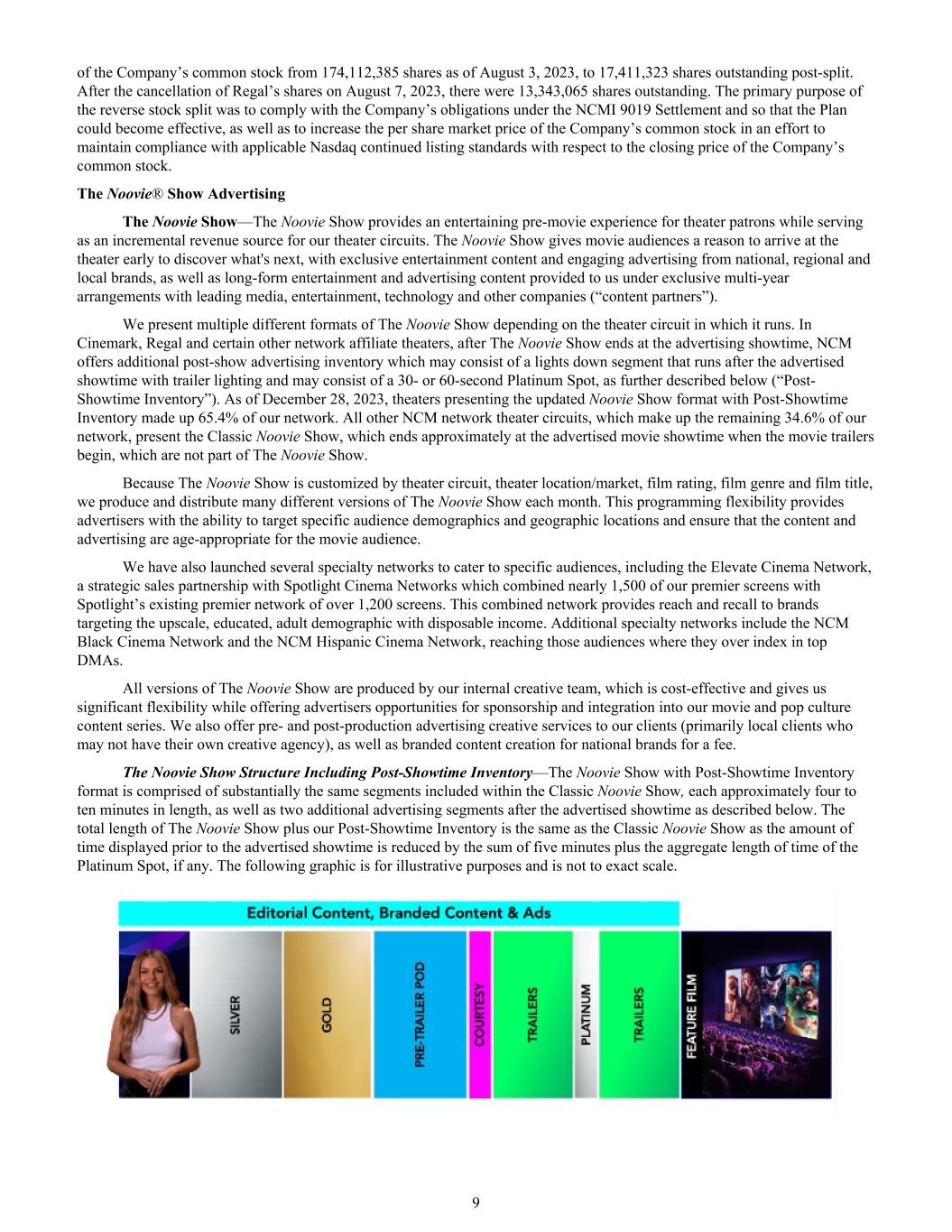 of the Company’s common stock from 174,112,385 shares as of August 3, 2023, to 17,411,323 shares outstanding post-split. After the cancellation of Regal’s shares on August 7, 2023, there were 13,343,065 shares outstanding. The primary purpose of the reverse stock split was to comply with the Company’s obligations under the NCMI 9019 Settlement and so that the Plan could become effective, as well as to increase the per share market price of the Company’s common stock in an effort to maintain compliance with applicable Nasdaq continued listing standards with respect to the closing price of the Company’s common stock. The Noovie® Show Advertising The Noovie Show—The Noovie Show provides an entertaining pre-movie experience for theater patrons while serving as an incremental revenue source for our theater circuits. The Noovie Show gives movie audiences a reason to arrive at the theater early to discover what's next, with exclusive entertainment content and engaging advertising from national, regional and local brands, as well as long-form entertainment and advertising content provided to us under exclusive multi-year arrangements with leading media, entertainment, technology and other companies (“content partners”). We present multiple different formats of The Noovie Show depending on the theater circuit in which it runs. In Cinemark, Regal and certain other network affiliate theaters, after The Noovie Show ends at the advertising showtime, NCM offers additional post-show advertising inventory which may consist of a lights down segment that runs after the advertised showtime with trailer lighting and may consist of a 30- or 60-second Platinum Spot, as further described below (“Post- Showtime Inventory”). As of December 28, 2023, theaters presenting the updated Noovie Show format with Post-Showtime Inventory made up 65.4% of our network. All other NCM network theater circuits, which make up the remaining 34.6% of our network, present the Classic Noovie Show, which ends approximately at the advertised movie showtime when the movie trailers begin, which are not part of The Noovie Show. Because The Noovie Show is customized by theater circuit, theater location/market, film rating, film genre and film title, we produce and distribute many different versions of The Noovie Show each month. This programming flexibility provides advertisers with the ability to target specific audience demographics and geographic locations and ensure that the content and advertising are age-appropriate for the movie audience. We have also launched several specialty networks to cater to specific audiences, including the Elevate Cinema Network, a strategic sales partnership with Spotlight Cinema Networks which combined nearly 1,500 of our premier screens with Spotlight’s existing premier network of over 1,200 screens. This combined network provides reach and recall to brands targeting the upscale, educated, adult demographic with disposable income. Additional specialty networks include the NCM Black Cinema Network and the NCM Hispanic Cinema Network, reaching those audiences where they over index in top DMAs. All versions of The Noovie Show are produced by our internal creative team, which is cost-effective and gives us significant flexibility while offering advertisers opportunities for sponsorship and integration into our movie and pop culture content series. We also offer pre- and post-production advertising creative services to our clients (primarily local clients who may not have their own creative agency), as well as branded content creation for national brands for a fee. The Noovie Show Structure Including Post-Showtime Inventory—The Noovie Show with Post-Showtime Inventory format is comprised of substantially the same segments included within the Classic Noovie Show, each approximately four to ten minutes in length, as well as two additional advertising segments after the advertised showtime as described below. The total length of The Noovie Show plus our Post-Showtime Inventory is the same as the Classic Noovie Show as the amount of time displayed prior to the advertised showtime is reduced by the sum of five minutes plus the aggregate length of time of the Platinum Spot, if any. The following graphic is for illustrative purposes and is not to exact scale. 9