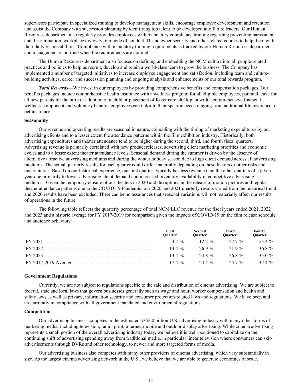 supervisors participate in specialized training to develop management skills, encourage employee development and retention and assist the Company with succession planning by identifying top talent to be developed into future leaders. Our Human Resources department also regularly provides employees with mandatory compliance training regarding preventing harassment and discrimination, workplace diversity, our code of conduct, IT and cyber security and other related courses to help them with their daily responsibilities. Compliance with mandatory training requirements is tracked by our Human Resources department and management is notified when the requirements are not met. The Human Resources department also focuses on defining and embedding the NCM culture into all people-related practices and policies to help us recruit, develop and retain a world-class team to grow the business. The Company has implemented a number of targeted initiatives to increase employee engagement and satisfaction, including team and culture- building activities, career and succession planning and ongoing analysis and enhancements of our total rewards program. Total Rewards—We invest in our employees by providing comprehensive benefits and compensation packages. Our benefits packages include comprehensive health insurance with a wellness program for all eligible employees, parental leave for all new parents for the birth or adoption of a child or placement of foster care, 401k plan with a comprehensive financial wellness component and voluntary benefits employees can tailor to their specific needs ranging from additional life insurance to pet insurance. Seasonality Our revenue and operating results are seasonal in nature, coinciding with the timing of marketing expenditures by our advertising clients and to a lesser extent the attendance patterns within the film exhibition industry. Historically, both advertising expenditures and theater attendance tend to be higher during the second, third, and fourth fiscal quarters. Advertising revenue is primarily correlated with new product releases, advertising client marketing priorities and economic cycles and to a lesser extent theater attendance levels. Seasonal demand during the summer is driven by the absence of alternative attractive advertising mediums and during the winter holiday season due to high client demand across all advertising mediums. The actual quarterly results for each quarter could differ materially depending on these factors or other risks and uncertainties. Based on our historical experience, our first quarter typically has less revenue than the other quarters of a given year due primarily to lower advertising client demand and increased inventory availability in competitive advertising mediums. Given the temporary closure of our theaters in 2020 and disruptions in the release of motion pictures and regular theater attendance patterns due to the COVID-19 Pandemic, our 2020 and 2021 quarterly results varied from the historical trend and 2020 results have been excluded. There can be no assurances that seasonal variations will not materially affect our results of operations in the future. The following table reflects the quarterly percentage of total NCM LLC revenue for the fiscal years ended 2021, 2022 and 2023 and a historic average for FY 2017-2019 for comparison given the impacts of COVID-19 on the film release schedule and audience behaviors: First Quarter Second Quarter Third Quarter Fourth Quarter FY 2021 .......................................................................................... 4.7 % 12.2 % 27.7 % 55.4 % FY 2022 .......................................................................................... 14.4 % 26.9 % 21.9 % 36.8 % FY 2023 .......................................................................................... 13.4 % 24.8 % 26.8 % 35.0 % FY 2017-2019 Average ................................................................... 17.4 % 24.4 % 25.7 % 32.4 % Government Regulations Currently, we are not subject to regulations specific to the sale and distribution of cinema advertising. We are subject to federal, state and local laws that govern businesses generally such as wage and hour, worker compensation and health and safety laws as well as privacy, information security and consumer protection-related laws and regulations. We have been and are currently in compliance with all government mandated and environmental regulations. Competition Our advertising business competes in the estimated $352.0 billion U.S. advertising industry with many other forms of marketing media, including television, radio, print, internet, mobile and outdoor display advertising. While cinema advertising represents a small portion of the overall advertising industry today, we believe it is well-positioned to capitalize on the continuing shift of advertising spending away from traditional media, in particular linear television where consumers can skip advertisements through DVRs and other technology, to newer and more targeted forms of media. Our advertising business also competes with many other providers of cinema advertising, which vary substantially in size. As the largest cinema advertising network in the U.S., we believe that we are able to generate economies of scale, 14