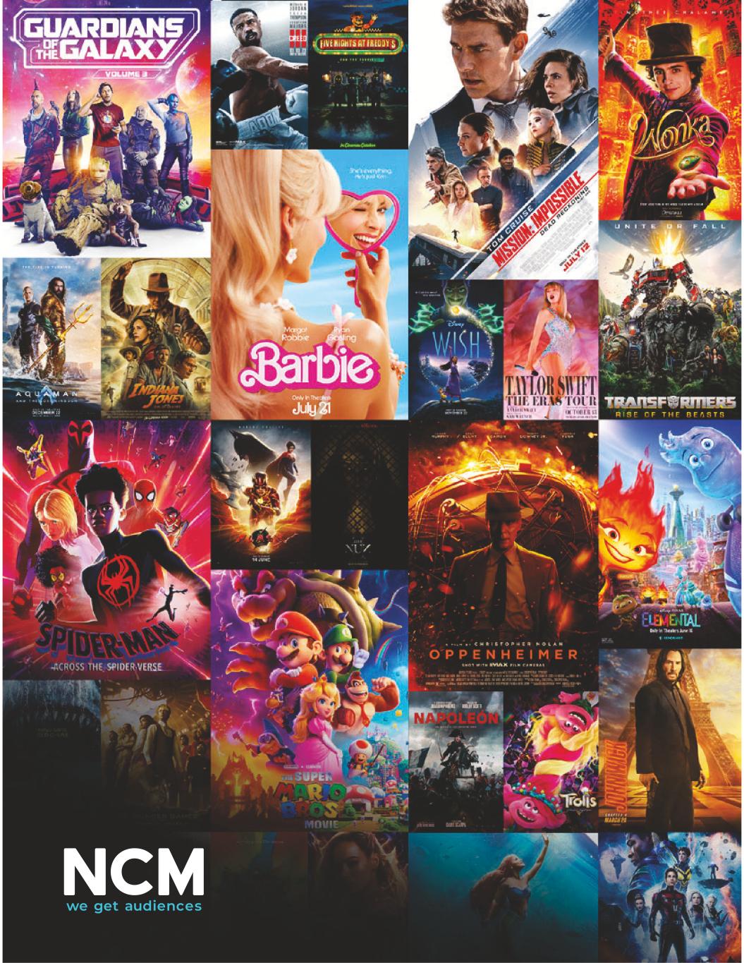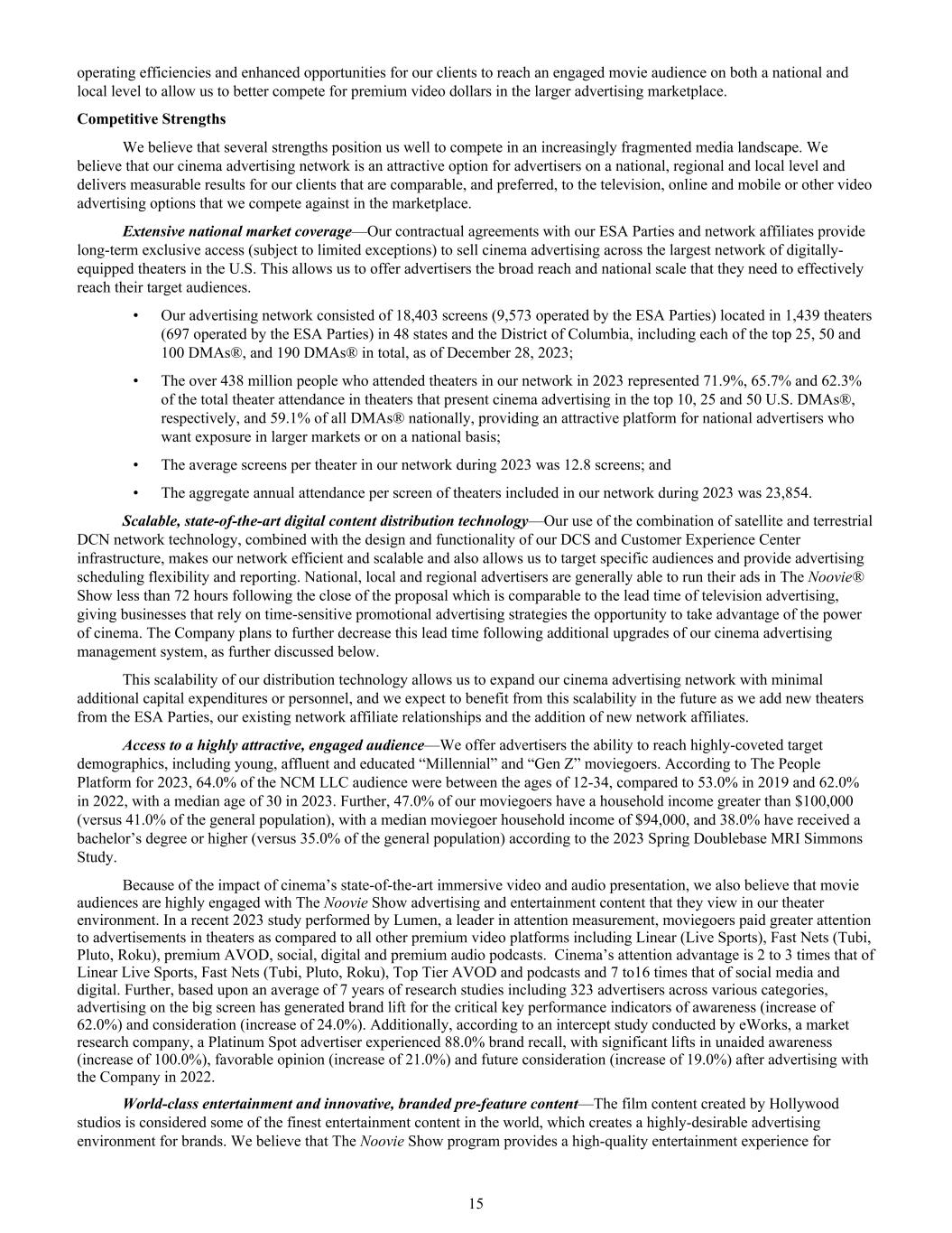 operating efficiencies and enhanced opportunities for our clients to reach an engaged movie audience on both a national and local level to allow us to better compete for premium video dollars in the larger advertising marketplace. Competitive Strengths We believe that several strengths position us well to compete in an increasingly fragmented media landscape. We believe that our cinema advertising network is an attractive option for advertisers on a national, regional and local level and delivers measurable results for our clients that are comparable, and preferred, to the television, online and mobile or other video advertising options that we compete against in the marketplace. Extensive national market coverage—Our contractual agreements with our ESA Parties and network affiliates provide long-term exclusive access (subject to limited exceptions) to sell cinema advertising across the largest network of digitally- equipped theaters in the U.S. This allows us to offer advertisers the broad reach and national scale that they need to effectively reach their target audiences. • Our advertising network consisted of 18,403 screens (9,573 operated by the ESA Parties) located in 1,439 theaters (697 operated by the ESA Parties) in 48 states and the District of Columbia, including each of the top 25, 50 and 100 DMAs®, and 190 DMAs® in total, as of December 28, 2023; • The over 438 million people who attended theaters in our network in 2023 represented 71.9%, 65.7% and 62.3% of the total theater attendance in theaters that present cinema advertising in the top 10, 25 and 50 U.S. DMAs®, respectively, and 59.1% of all DMAs® nationally, providing an attractive platform for national advertisers who want exposure in larger markets or on a national basis; • The average screens per theater in our network during 2023 was 12.8 screens; and • The aggregate annual attendance per screen of theaters included in our network during 2023 was 23,854. Scalable, state-of-the-art digital content distribution technology—Our use of the combination of satellite and terrestrial DCN network technology, combined with the design and functionality of our DCS and Customer Experience Center infrastructure, makes our network efficient and scalable and also allows us to target specific audiences and provide advertising scheduling flexibility and reporting. National, local and regional advertisers are generally able to run their ads in The Noovie® Show less than 72 hours following the close of the proposal which is comparable to the lead time of television advertising, giving businesses that rely on time-sensitive promotional advertising strategies the opportunity to take advantage of the power of cinema. The Company plans to further decrease this lead time following additional upgrades of our cinema advertising management system, as further discussed below. This scalability of our distribution technology allows us to expand our cinema advertising network with minimal additional capital expenditures or personnel, and we expect to benefit from this scalability in the future as we add new theaters from the ESA Parties, our existing network affiliate relationships and the addition of new network affiliates. Access to a highly attractive, engaged audience—We offer advertisers the ability to reach highly-coveted target demographics, including young, affluent and educated “Millennial” and “Gen Z” moviegoers. According to The People Platform for 2023, 64.0% of the NCM LLC audience were between the ages of 12-34, compared to 53.0% in 2019 and 62.0% in 2022, with a median age of 30 in 2023. Further, 47.0% of our moviegoers have a household income greater than $100,000 (versus 41.0% of the general population), with a median moviegoer household income of $94,000, and 38.0% have received a bachelor’s degree or higher (versus 35.0% of the general population) according to the 2023 Spring Doublebase MRI Simmons Study. Because of the impact of cinema’s state-of-the-art immersive video and audio presentation, we also believe that movie audiences are highly engaged with The Noovie Show advertising and entertainment content that they view in our theater environment. In a recent 2023 study performed by Lumen, a leader in attention measurement, moviegoers paid greater attention to advertisements in theaters as compared to all other premium video platforms including Linear (Live Sports), Fast Nets (Tubi, Pluto, Roku), premium AVOD, social, digital and premium audio podcasts. Cinema’s attention advantage is 2 to 3 times that of Linear Live Sports, Fast Nets (Tubi, Pluto, Roku), Top Tier AVOD and podcasts and 7 to16 times that of social media and digital. Further, based upon an average of 7 years of research studies including 323 advertisers across various categories, advertising on the big screen has generated brand lift for the critical key performance indicators of awareness (increase of 62.0%) and consideration (increase of 24.0%). Additionally, according to an intercept study conducted by eWorks, a market research company, a Platinum Spot advertiser experienced 88.0% brand recall, with significant lifts in unaided awareness (increase of 100.0%), favorable opinion (increase of 21.0%) and future consideration (increase of 19.0%) after advertising with the Company in 2022. World-class entertainment and innovative, branded pre-feature content—The film content created by Hollywood studios is considered some of the finest entertainment content in the world, which creates a highly-desirable advertising environment for brands. We believe that The Noovie Show program provides a high-quality entertainment experience for 15