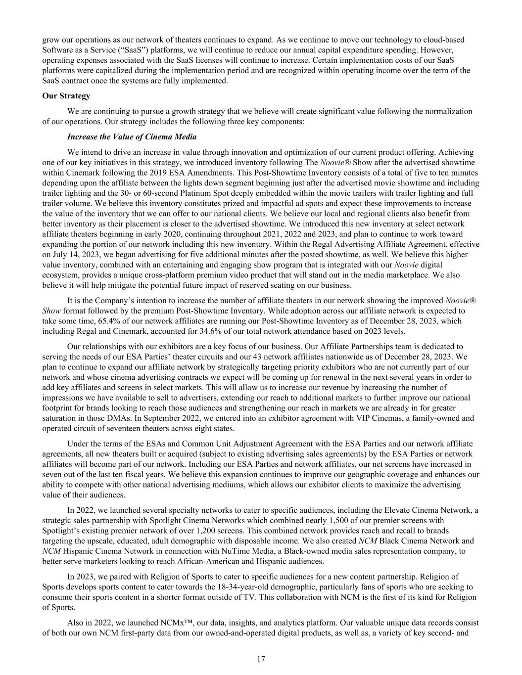 grow our operations as our network of theaters continues to expand. As we continue to move our technology to cloud-based Software as a Service (“SaaS”) platforms, we will continue to reduce our annual capital expenditure spending. However, operating expenses associated with the SaaS licenses will continue to increase. Certain implementation costs of our SaaS platforms were capitalized during the implementation period and are recognized within operating income over the term of the SaaS contract once the systems are fully implemented. Our Strategy We are continuing to pursue a growth strategy that we believe will create significant value following the normalization of our operations. Our strategy includes the following three key components: Increase the Value of Cinema Media We intend to drive an increase in value through innovation and optimization of our current product offering. Achieving one of our key initiatives in this strategy, we introduced inventory following The Noovie® Show after the advertised showtime within Cinemark following the 2019 ESA Amendments. This Post-Showtime Inventory consists of a total of five to ten minutes depending upon the affiliate between the lights down segment beginning just after the advertised movie showtime and including trailer lighting and the 30- or 60-second Platinum Spot deeply embedded within the movie trailers with trailer lighting and full trailer volume. We believe this inventory constitutes prized and impactful ad spots and expect these improvements to increase the value of the inventory that we can offer to our national clients. We believe our local and regional clients also benefit from better inventory as their placement is closer to the advertised showtime. We introduced this new inventory at select network affiliate theaters beginning in early 2020, continuing throughout 2021, 2022 and 2023, and plan to continue to work toward expanding the portion of our network including this new inventory. Within the Regal Advertising Affiliate Agreement, effective on July 14, 2023, we began advertising for five additional minutes after the posted showtime, as well. We believe this higher value inventory, combined with an entertaining and engaging show program that is integrated with our Noovie digital ecosystem, provides a unique cross-platform premium video product that will stand out in the media marketplace. We also believe it will help mitigate the potential future impact of reserved seating on our business. It is the Company’s intention to increase the number of affiliate theaters in our network showing the improved Noovie® Show format followed by the premium Post-Showtime Inventory. While adoption across our affiliate network is expected to take some time, 65.4% of our network affiliates are running our Post-Showtime Inventory as of December 28, 2023, which including Regal and Cinemark, accounted for 34.6% of our total network attendance based on 2023 levels. Our relationships with our exhibitors are a key focus of our business. Our Affiliate Partnerships team is dedicated to serving the needs of our ESA Parties’ theater circuits and our 43 network affiliates nationwide as of December 28, 2023. We plan to continue to expand our affiliate network by strategically targeting priority exhibitors who are not currently part of our network and whose cinema advertising contracts we expect will be coming up for renewal in the next several years in order to add key affiliates and screens in select markets. This will allow us to increase our revenue by increasing the number of impressions we have available to sell to advertisers, extending our reach to additional markets to further improve our national footprint for brands looking to reach those audiences and strengthening our reach in markets we are already in for greater saturation in those DMAs. In September 2022, we entered into an exhibitor agreement with VIP Cinemas, a family-owned and operated circuit of seventeen theaters across eight states. Under the terms of the ESAs and Common Unit Adjustment Agreement with the ESA Parties and our network affiliate agreements, all new theaters built or acquired (subject to existing advertising sales agreements) by the ESA Parties or network affiliates will become part of our network. Including our ESA Parties and network affiliates, our net screens have increased in seven out of the last ten fiscal years. We believe this expansion continues to improve our geographic coverage and enhances our ability to compete with other national advertising mediums, which allows our exhibitor clients to maximize the advertising value of their audiences. In 2022, we launched several specialty networks to cater to specific audiences, including the Elevate Cinema Network, a strategic sales partnership with Spotlight Cinema Networks which combined nearly 1,500 of our premier screens with Spotlight’s existing premier network of over 1,200 screens. This combined network provides reach and recall to brands targeting the upscale, educated, adult demographic with disposable income. We also created NCM Black Cinema Network and NCM Hispanic Cinema Network in connection with NuTime Media, a Black-owned media sales representation company, to better serve marketers looking to reach African-American and Hispanic audiences. In 2023, we paired with Religion of Sports to cater to specific audiences for a new content partnership. Religion of Sports develops sports content to cater towards the 18-34-year-old demographic, particularly fans of sports who are seeking to consume their sports content in a shorter format outside of TV. This collaboration with NCM is the first of its kind for Religion of Sports. Also in 2022, we launched NCMx™, our data, insights, and analytics platform. Our valuable unique data records consist of both our own NCM first-party data from our owned-and-operated digital products, as well as, a variety of key second- and 17
