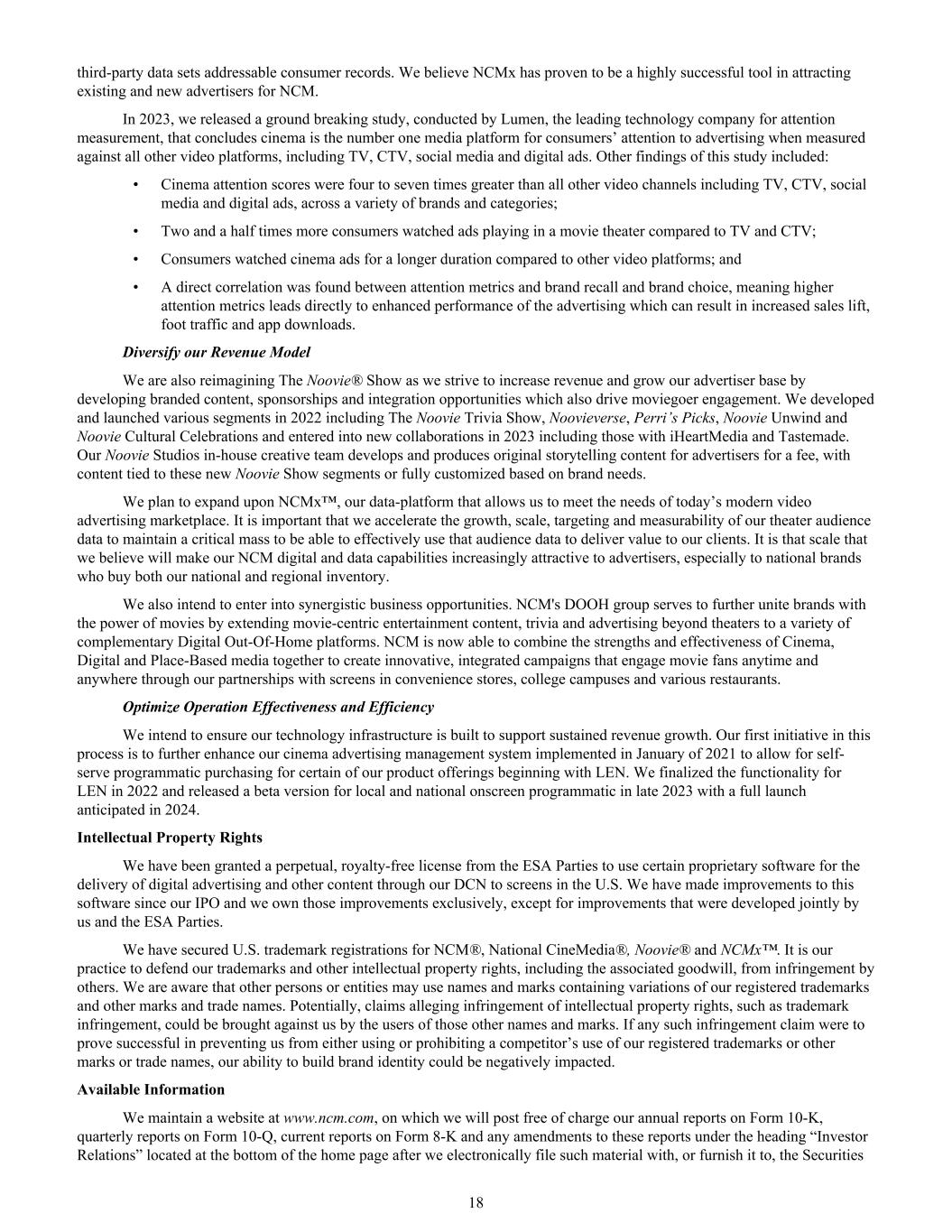 third-party data sets addressable consumer records. We believe NCMx has proven to be a highly successful tool in attracting existing and new advertisers for NCM. In 2023, we released a ground breaking study, conducted by Lumen, the leading technology company for attention measurement, that concludes cinema is the number one media platform for consumers’ attention to advertising when measured against all other video platforms, including TV, CTV, social media and digital ads. Other findings of this study included: • Cinema attention scores were four to seven times greater than all other video channels including TV, CTV, social media and digital ads, across a variety of brands and categories; • Two and a half times more consumers watched ads playing in a movie theater compared to TV and CTV; • Consumers watched cinema ads for a longer duration compared to other video platforms; and • A direct correlation was found between attention metrics and brand recall and brand choice, meaning higher attention metrics leads directly to enhanced performance of the advertising which can result in increased sales lift, foot traffic and app downloads. Diversify our Revenue Model We are also reimagining The Noovie® Show as we strive to increase revenue and grow our advertiser base by developing branded content, sponsorships and integration opportunities which also drive moviegoer engagement. We developed and launched various segments in 2022 including The Noovie Trivia Show, Noovieverse, Perri’s Picks, Noovie Unwind and Noovie Cultural Celebrations and entered into new collaborations in 2023 including those with iHeartMedia and Tastemade. Our Noovie Studios in-house creative team develops and produces original storytelling content for advertisers for a fee, with content tied to these new Noovie Show segments or fully customized based on brand needs. We plan to expand upon NCMx™, our data-platform that allows us to meet the needs of today’s modern video advertising marketplace. It is important that we accelerate the growth, scale, targeting and measurability of our theater audience data to maintain a critical mass to be able to effectively use that audience data to deliver value to our clients. It is that scale that we believe will make our NCM digital and data capabilities increasingly attractive to advertisers, especially to national brands who buy both our national and regional inventory. We also intend to enter into synergistic business opportunities. NCM's DOOH group serves to further unite brands with the power of movies by extending movie-centric entertainment content, trivia and advertising beyond theaters to a variety of complementary Digital Out-Of-Home platforms. NCM is now able to combine the strengths and effectiveness of Cinema, Digital and Place-Based media together to create innovative, integrated campaigns that engage movie fans anytime and anywhere through our partnerships with screens in convenience stores, college campuses and various restaurants. Optimize Operation Effectiveness and Efficiency We intend to ensure our technology infrastructure is built to support sustained revenue growth. Our first initiative in this process is to further enhance our cinema advertising management system implemented in January of 2021 to allow for self- serve programmatic purchasing for certain of our product offerings beginning with LEN. We finalized the functionality for LEN in 2022 and released a beta version for local and national onscreen programmatic in late 2023 with a full launch anticipated in 2024. Intellectual Property Rights We have been granted a perpetual, royalty-free license from the ESA Parties to use certain proprietary software for the delivery of digital advertising and other content through our DCN to screens in the U.S. We have made improvements to this software since our IPO and we own those improvements exclusively, except for improvements that were developed jointly by us and the ESA Parties. We have secured U.S. trademark registrations for NCM®, National CineMedia®, Noovie® and NCMx™. It is our practice to defend our trademarks and other intellectual property rights, including the associated goodwill, from infringement by others. We are aware that other persons or entities may use names and marks containing variations of our registered trademarks and other marks and trade names. Potentially, claims alleging infringement of intellectual property rights, such as trademark infringement, could be brought against us by the users of those other names and marks. If any such infringement claim were to prove successful in preventing us from either using or prohibiting a competitor’s use of our registered trademarks or other marks or trade names, our ability to build brand identity could be negatively impacted. Available Information We maintain a website at www.ncm.com, on which we will post free of charge our annual reports on Form 10-K, quarterly reports on Form 10-Q, current reports on Form 8-K and any amendments to these reports under the heading “Investor Relations” located at the bottom of the home page after we electronically file such material with, or furnish it to, the Securities 18