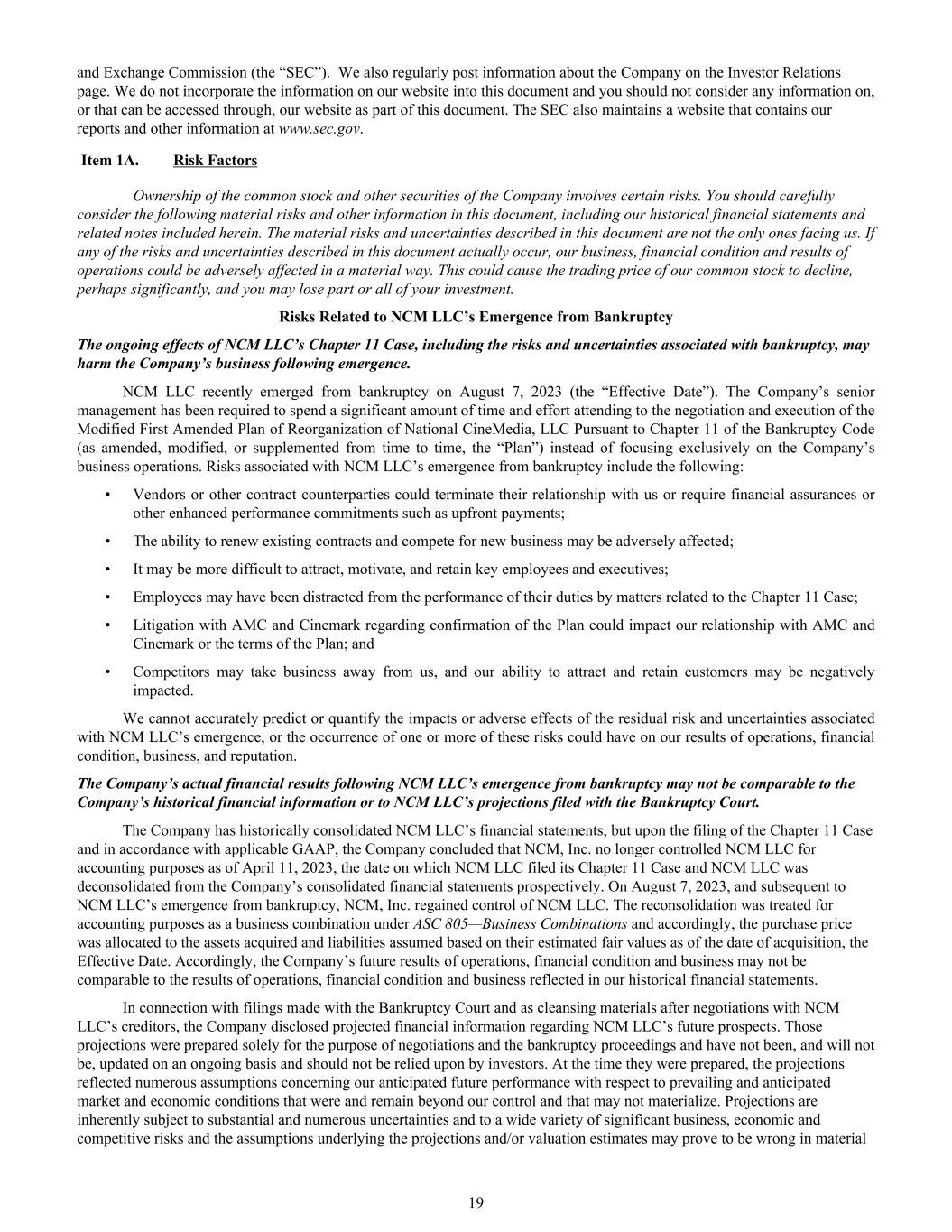 and Exchange Commission (the “SEC”). We also regularly post information about the Company on the Investor Relations page. We do not incorporate the information on our website into this document and you should not consider any information on, or that can be accessed through, our website as part of this document. The SEC also maintains a website that contains our reports and other information at www.sec.gov. Item 1A. Risk Factors Ownership of the common stock and other securities of the Company involves certain risks. You should carefully consider the following material risks and other information in this document, including our historical financial statements and related notes included herein. The material risks and uncertainties described in this document are not the only ones facing us. If any of the risks and uncertainties described in this document actually occur, our business, financial condition and results of operations could be adversely affected in a material way. This could cause the trading price of our common stock to decline, perhaps significantly, and you may lose part or all of your investment. Risks Related to NCM LLC’s Emergence from Bankruptcy The ongoing effects of NCM LLC’s Chapter 11 Case, including the risks and uncertainties associated with bankruptcy, may harm the Company’s business following emergence. NCM LLC recently emerged from bankruptcy on August 7, 2023 (the “Effective Date”). The Company’s senior management has been required to spend a significant amount of time and effort attending to the negotiation and execution of the Modified First Amended Plan of Reorganization of National CineMedia, LLC Pursuant to Chapter 11 of the Bankruptcy Code (as amended, modified, or supplemented from time to time, the “Plan”) instead of focusing exclusively on the Company’s business operations. Risks associated with NCM LLC’s emergence from bankruptcy include the following: • Vendors or other contract counterparties could terminate their relationship with us or require financial assurances or other enhanced performance commitments such as upfront payments; • The ability to renew existing contracts and compete for new business may be adversely affected; • It may be more difficult to attract, motivate, and retain key employees and executives; • Employees may have been distracted from the performance of their duties by matters related to the Chapter 11 Case; • Litigation with AMC and Cinemark regarding confirmation of the Plan could impact our relationship with AMC and Cinemark or the terms of the Plan; and • Competitors may take business away from us, and our ability to attract and retain customers may be negatively impacted. We cannot accurately predict or quantify the impacts or adverse effects of the residual risk and uncertainties associated with NCM LLC’s emergence, or the occurrence of one or more of these risks could have on our results of operations, financial condition, business, and reputation. The Company’s actual financial results following NCM LLC’s emergence from bankruptcy may not be comparable to the Company’s historical financial information or to NCM LLC’s projections filed with the Bankruptcy Court. The Company has historically consolidated NCM LLC’s financial statements, but upon the filing of the Chapter 11 Case and in accordance with applicable GAAP, the Company concluded that NCM, Inc. no longer controlled NCM LLC for accounting purposes as of April 11, 2023, the date on which NCM LLC filed its Chapter 11 Case and NCM LLC was deconsolidated from the Company’s consolidated financial statements prospectively. On August 7, 2023, and subsequent to NCM LLC’s emergence from bankruptcy, NCM, Inc. regained control of NCM LLC. The reconsolidation was treated for accounting purposes as a business combination under ASC 805—Business Combinations and accordingly, the purchase price was allocated to the assets acquired and liabilities assumed based on their estimated fair values as of the date of acquisition, the Effective Date. Accordingly, the Company’s future results of operations, financial condition and business may not be comparable to the results of operations, financial condition and business reflected in our historical financial statements. In connection with filings made with the Bankruptcy Court and as cleansing materials after negotiations with NCM LLC’s creditors, the Company disclosed projected financial information regarding NCM LLC’s future prospects. Those projections were prepared solely for the purpose of negotiations and the bankruptcy proceedings and have not been, and will not be, updated on an ongoing basis and should not be relied upon by investors. At the time they were prepared, the projections reflected numerous assumptions concerning our anticipated future performance with respect to prevailing and anticipated market and economic conditions that were and remain beyond our control and that may not materialize. Projections are inherently subject to substantial and numerous uncertainties and to a wide variety of significant business, economic and competitive risks and the assumptions underlying the projections and/or valuation estimates may prove to be wrong in material 19