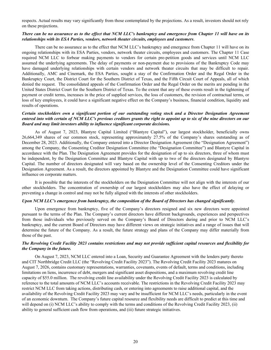 respects. Actual results may vary significantly from those contemplated by the projections. As a result, investors should not rely on these projections. There can be no assurance as to the effect that NCM LLC’s bankruptcy and emergence from Chapter 11 will have on its relationships with its ESA Parties, vendors, network theater circuits, employees and customers. There can be no assurance as to the effect that NCM LLC’s bankruptcy and emergence from Chapter 11 will have on its ongoing relationships with its ESA Parties, vendors, network theater circuits, employees and customers. The Chapter 11 Case required NCM LLC to forbear making payments to vendors for certain pre-petition goods and services until NCM LLC assumed the underlying agreements. The delay of payments or non-payment due to provisions of the Bankruptcy Code may have damaged underlying relationships with certain vendors and network theater circuits that may be difficult to repair. Additionally, AMC and Cinemark, the ESA Parties, sought a stay of the Confirmation Order and the Regal Order in the Bankruptcy Court, the District Court for the Southern District of Texas, and the Fifth Circuit Court of Appeals, all of which denied the request. The consolidated appeals of the Confirmation Order and the Regal Order on the merits are pending in the United States District Court for the Southern District of Texas. To the extent that any of these events result in the tightening of payment or credit terms, increases in the price of supplied services, the loss of customers, the revision of contractual terms, or loss of key employees, it could have a significant negative effect on the Company’s business, financial condition, liquidity and results of operations. Certain stockholders own a significant portion of our outstanding voting stock and a Director Designation Agreement entered into with certain of NCM LLC’s previous creditors grants the right to appoint up to six of the nine directors on our Board and may limit investors ability to influence significant corporate decisions. As of August 7, 2023, Blantyre Capital Limited (“Blantyre Capital”), our largest stockholder, beneficially owns 26,664,349 shares of our common stock, representing approximately 27.5% of the Company’s shares outstanding as of December 28, 2023. Additionally, the Company entered into a Director Designation Agreement (the “Designation Agreement”) among the Company, the Consenting Creditor Designation Committee (the “Designation Committee”) and Blantyre Capital in accordance with the Plan. The Designation Agreement provides for the designation of up to six directors, three of whom must be independent, by the Designation Committee and Blantyre Capital with up to two of the directors designated by Blantyre Capital. The number of directors designated will vary based on the ownership level of the Consenting Creditors under the Designation Agreement. As a result, the directors appointed by Blantyre and the Designation Committee could have significant influence on corporate matters. It is possible that the interests of the stockholders on the Designation Committee will not align with the interests of our other stockholders. The concentration of ownership of our largest stockholders may also have the effect of delaying or preventing a change in control and may not be fully aligned with the interests of other stockholders. Upon NCM LLC’s emergence from bankruptcy, the composition of the Board of Directors has changed significantly. Upon emergence from bankruptcy, five of the Company’s directors resigned and six new directors were appointed pursuant to the terms of the Plan. The Company’s current directors have different backgrounds, experiences and perspectives from those individuals who previously served on the Company’s Board of Directors during and prior to NCM LLC’s bankruptcy, and the current Board of Directors may have different views on strategic initiatives and a range of issues that will determine the future of the Company. As a result, the future strategy and plans of the Company may differ materially from those of the past. The Revolving Credit Facility 2023 contains restrictions and may not provide sufficient capital resources and flexibility for the Company in the future. On August 7, 2023, NCM LLC entered into a Loan, Security and Guarantee Agreement with the lenders party thereto and CIT Northbridge Credit LLC (the “Revolving Credit Facility 2023”). The Revolving Credit Facility 2023 matures on August 7, 2026, contains customary representations, warranties, covenants, events of default, terms and conditions, including limitations on liens, incurrence of debt, mergers and significant asset dispositions, and a maximum revolving credit line capacity of $55.0 million. The revolving credit line availability under the Revolving Credit Facility 2023 is calculated by reference to the total amounts of NCM LLC’s accounts receivable. The restrictions in the Revolving Credit Facility 2023 may restrict NCM LLC from taking actions, distributing cash, or entering into agreements to raise additional capital, and the availability of the Revolving Credit Facility 2023 may vary and be insufficient for NCM LLC’s needs, particularly in the event of an economic downturn. The Company’s future capital resource and flexibility needs are difficult to predict at this time and will depend on (i) NCM LLC’s ability to comply with the terms and conditions of the Revolving Credit Facility 2023, (ii) ability to general sufficient cash flow from operations, and (iii) future strategic initiatives. 20