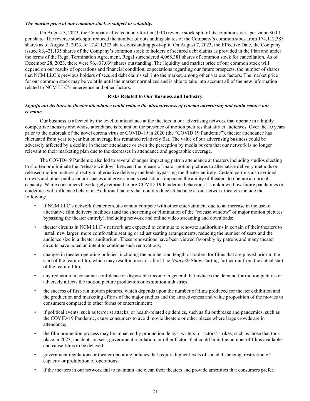 The market price of our common stock is subject to volatility. On August 3, 2023, the Company effected a one-for-ten (1:10) reverse stock split of its common stock, par value $0.01 per share. The reverse stock split reduced the number of outstanding shares of the Company’s common stock from 174,112,385 shares as of August 3, 2023, to 17,411,323 shares outstanding post-split. On August 7, 2023, the Effective Date, the Company issued 83,421,135 shares of the Company’s common stock to holders of secured debt claims as provided in the Plan and under the terms of the Regal Termination Agreement, Regal surrendered 4,068,381 shares of common stock for cancellation. As of December 28, 2023, there were 96,837,039 shares outstanding. The liquidity and market price of our common stock will depend on our results of operations and financial condition, expectations regarding our future prospects, the number of shares that NCM LLC’s previous holders of secured debt claims sell into the market, among other various factors. The market price for our common stock may be volatile until the market normalizes and is able to take into account all of the new information related to NCM LLC’s emergence and other factors. Risks Related to Our Business and Industry Significant declines in theater attendance could reduce the attractiveness of cinema advertising and could reduce our revenue. Our business is affected by the level of attendance at the theaters in our advertising network that operate in a highly competitive industry and whose attendance is reliant on the presence of motion pictures that attract audiences. Over the 10 years prior to the outbreak of the novel corona virus or COVID-19 in 2020 (the “COVID 19 Pandemic”), theater attendance has fluctuated from year to year but on average has remained relatively flat. The value of our advertising business could be adversely affected by a decline in theater attendance or even the perception by media buyers that our network is no longer relevant to their marketing plan due to the decreases in attendance and geographic coverage. The COVID-19 Pandemic also led to several changes impacting patron attendance at theaters including studios electing to shorten or eliminate the “release window” between the release of major motion pictures to alternative delivery methods or released motion pictures directly to alternative delivery methods bypassing the theater entirely. Certain patrons also avoided crowds and other public indoor spaces and governments restrictions impacted the ability of theaters to operate at normal capacity. While consumers have largely returned to pre-COVID-19 Pandemic behavior, it is unknown how future pandemics or epidemics will influence behavior. Additional factors that could reduce attendance at our network theaters include the following: • if NCM LLC’s network theater circuits cannot compete with other entertainment due to an increase in the use of alternative film delivery methods (and the shortening or elimination of the “release window” of major motion pictures bypassing the theater entirely), including network and online video streaming and downloads; • theater circuits in NCM LLC’s network are expected to continue to renovate auditoriums in certain of their theaters to install new larger, more comfortable seating or adjust seating arrangements, reducing the number of seats and the audience size in a theater auditorium. These renovations have been viewed favorably by patrons and many theater circuits have noted an intent to continue such renovations; • changes in theater operating policies, including the number and length of trailers for films that are played prior to the start of the feature film, which may result in most or all of The Noovie® Show starting further out from the actual start of the feature film; • any reduction in consumer confidence or disposable income in general that reduces the demand for motion pictures or adversely affects the motion picture production or exhibition industries; • the success of first-run motion pictures, which depends upon the number of films produced for theater exhibition and the production and marketing efforts of the major studios and the attractiveness and value proposition of the movies to consumers compared to other forms of entertainment; • if political events, such as terrorist attacks, or health-related epidemics, such as flu outbreaks and pandemics, such as the COVID-19 Pandemic, cause consumers to avoid movie theaters or other places where large crowds are in attendance; • the film production process may be impacted by production delays, writers’ or actors’ strikes, such as those that took place in 2023, incidents on sets, government regulation, or other factors that could limit the number of films available and cause films to be delayed; • government regulations or theater operating policies that require higher levels of social distancing, restriction of capacity or prohibition of operations; • if the theaters in our network fail to maintain and clean their theaters and provide amenities that consumers prefer; 21